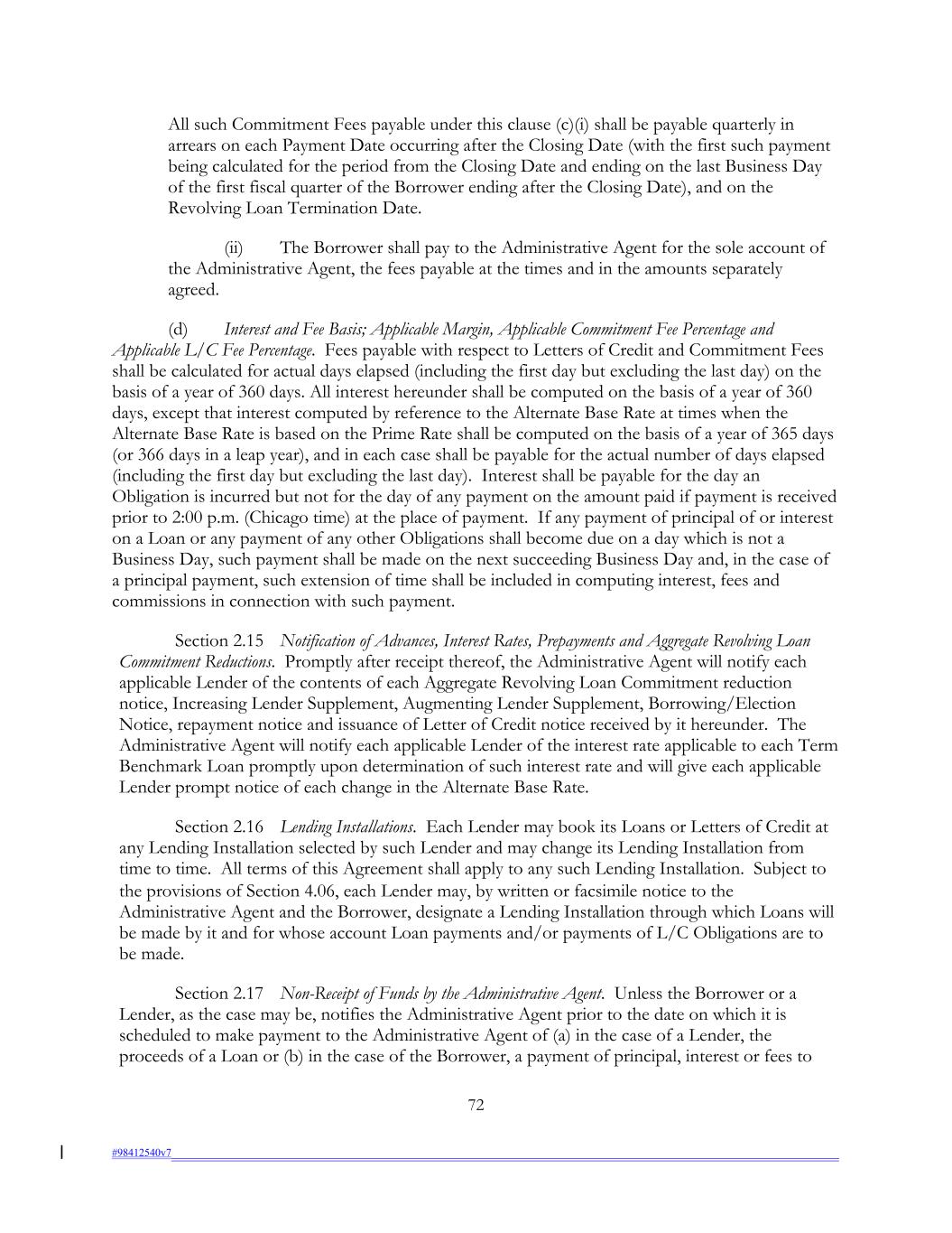 All such Commitment Fees payable under this clause (c) (i) shall be payable quarterly in arrears on each Payment Date occurring after the Closing Date (with the first such payment being calculated for the period from the Closing Date and ending on the last Business Day of the first fiscal quarter of the Borrower ending after the Closing Date), and on the Revolving Loan Termination Date. (ii) The Borrower shall pay to the Administrative Agent for the sole account of the Administrative Agent, the fees payable at the times and in the amounts separately agreed. (d) Interest and Fee Basis; Applicable Margin, Applicable Commitment Fee Percentage and Applicable L/C Fee Percentage. Fees payable with respect to Letters of Credit and Commitment Fees shall be calculated for actual days elapsed (including the first day but excluding the last day) on the basis of a year of 360 days. All interest hereunder shall be computed on the basis of a year of 360 days, except that interest computed by reference to the Alternate Base Rate at times when the Alternate Base Rate is based on the Prime Rate shall be computed on the basis of a year of 365 days (or 366 days in a leap year), and in each case shall be payable for the actual number of days elapsed (including the first day but excluding the last day). Interest shall be payable for the day an Obligation is incurred but not for the day of any payment on the amount paid if payment is received prior to 2:00 p.m. (Chicago time) at the place of payment. If any payment of principal of or interest on a Loan or any payment of any other Obligations shall become due on a day which is not a Business Day, such payment shall be made on the next succeeding Business Day and, in the case of a principal payment, such extension of time shall be included in computing interest, fees and commissions in connection with such payment. Section 2.15 Notification of Advances, Interest Rates, Prepayments and Aggregate Revolving Loan Commitment Reductions. Promptly after receipt thereof, the Administrative Agent will notify each applicable Lender of the contents of each Aggregate Revolving Loan Commitment reduction notice, Increasing Lender Supplement, Augmenting Lender Supplement, Borrowing/Election Notice, repayment notice and issuance of Letter of Credit notice received by it hereunder. The Administrative Agent will notify each applicable Lender of the interest rate applicable to each Term Benchmark Loan promptly upon determination of such interest rate and will give each applicable Lender prompt notice of each change in the Alternate Base Rate. Section 2.16 Lending Installations. Each Lender may book its Loans or Letters of Credit at any Lending Installation selected by such Lender and may change its Lending Installation from time to time. All terms of this Agreement shall apply to any such Lending Installation. Subject to the provisions of Section 4.06, each Lender may, by written or facsimile notice to the Administrative Agent and the Borrower, designate a Lending Installation through which Loans will be made by it and for whose account Loan payments and/or payments of L/C Obligations are to be made. Section 2.17 Non-Receipt of Funds by the Administrative Agent. Unless the Borrower or a Lender, as the case may be, notifies the Administrative Agent prior to the date on which it is scheduled to make payment to the Administrative Agent of (a) in the case of a Lender, the proceeds of a Loan or (b) in the case of the Borrower, a payment of principal, interest or fees to 72 #98412540v7