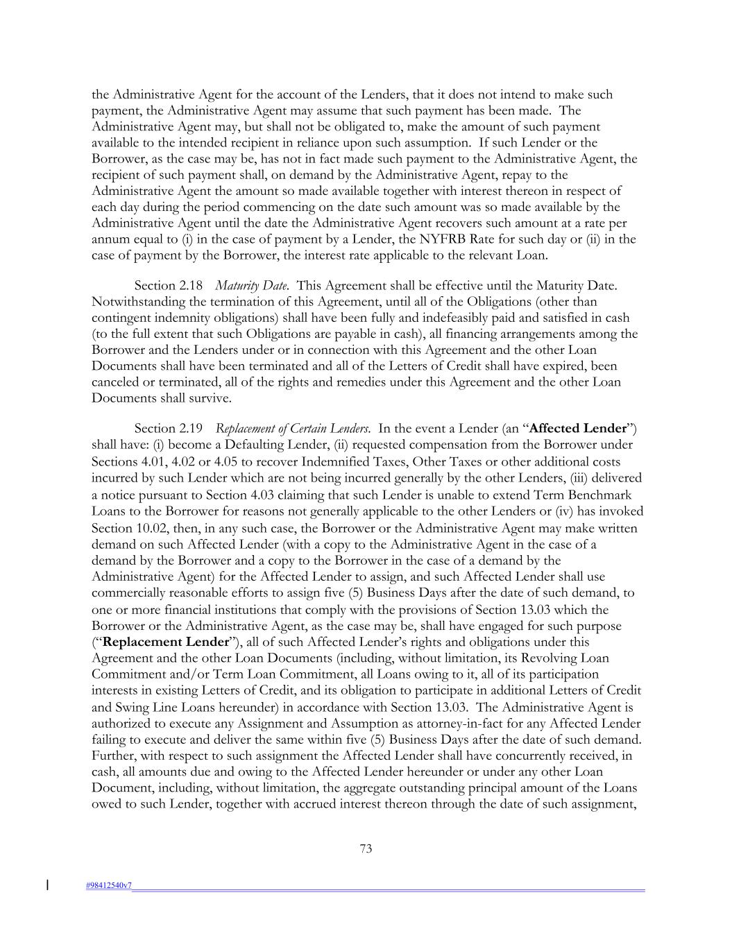 the Administrative Agent for the account of the Lenders, that it does not intend to make such payment, the Administrative Agent may assume that such payment has been made. The Administrative Agent may, but shall not be obligated to, make the amount of such payment available to the intended recipient in reliance upon such assumption. If such Lender or the Borrower, as the case may be, has not in fact made such payment to the Administrative Agent, the recipient of such payment shall, on demand by the Administrative Agent, repay to the Administrative Agent the amount so made available together with interest thereon in respect of each day during the period commencing on the date such amount was so made available by the Administrative Agent until the date the Administrative Agent recovers such amount at a rate per annum equal to (i) in the case of payment by a Lender, the NYFRB Rate for such day or (ii) in the case of payment by the Borrower, the interest rate applicable to the relevant Loan. Section 2.18 Maturity Date. This Agreement shall be effective until the Maturity Date. Notwithstanding the termination of this Agreement, until all of the Obligations (other than contingent indemnity obligations) shall have been fully and indefeasibly paid and satisfied in cash (to the full extent that such Obligations are payable in cash), all financing arrangements among the Borrower and the Lenders under or in connection with this Agreement and the other Loan Documents shall have been terminated and all of the Letters of Credit shall have expired, been canceled or terminated, all of the rights and remedies under this Agreement and the other Loan Documents shall survive. Section 2.19 Replacement of Certain Lenders. In the event a Lender (an “Affected Lender”) shall have: (i) become a Defaulting Lender, (ii) requested compensation from the Borrower under Sections 4.01, 4.02 or 4.05 to recover Indemnified Taxes, Other Taxes or other additional costs incurred by such Lender which are not being incurred generally by the other Lenders, (iii) delivered a notice pursuant to Section 4.03 claiming that such Lender is unable to extend Term Benchmark Loans to the Borrower for reasons not generally applicable to the other Lenders or (iv) has invoked Section 10.02, then, in any such case, the Borrower or the Administrative Agent may make written demand on such Affected Lender (with a copy to the Administrative Agent in the case of a demand by the Borrower and a copy to the Borrower in the case of a demand by the Administrative Agent) for the Affected Lender to assign, and such Affected Lender shall use commercially reasonable efforts to assign five (5) Business Days after the date of such demand, to one or more financial institutions that comply with the provisions of Section 13.03 which the Borrower or the Administrative Agent, as the case may be, shall have engaged for such purpose (“Replacement Lender”), all of such Affected Lender’s rights and obligations under this Agreement and the other Loan Documents (including, without limitation, its Revolving Loan Commitment and/or Term Loan Commitment, all Loans owing to it, all of its participation interests in existing Letters of Credit, and its obligation to participate in additional Letters of Credit and Swing Line Loans hereunder) in accordance with Section 13.03. The Administrative Agent is authorized to execute any Assignment and Assumption as attorney-in-fact for any Affected Lender failing to execute and deliver the same within five (5) Business Days after the date of such demand. Further, with respect to such assignment the Affected Lender shall have concurrently received, in cash, all amounts due and owing to the Affected Lender hereunder or under any other Loan Document, including, without limitation, the aggregate outstanding principal amount of the Loans owed to such Lender, together with accrued interest thereon through the date of such assignment, 73 #98412540v7