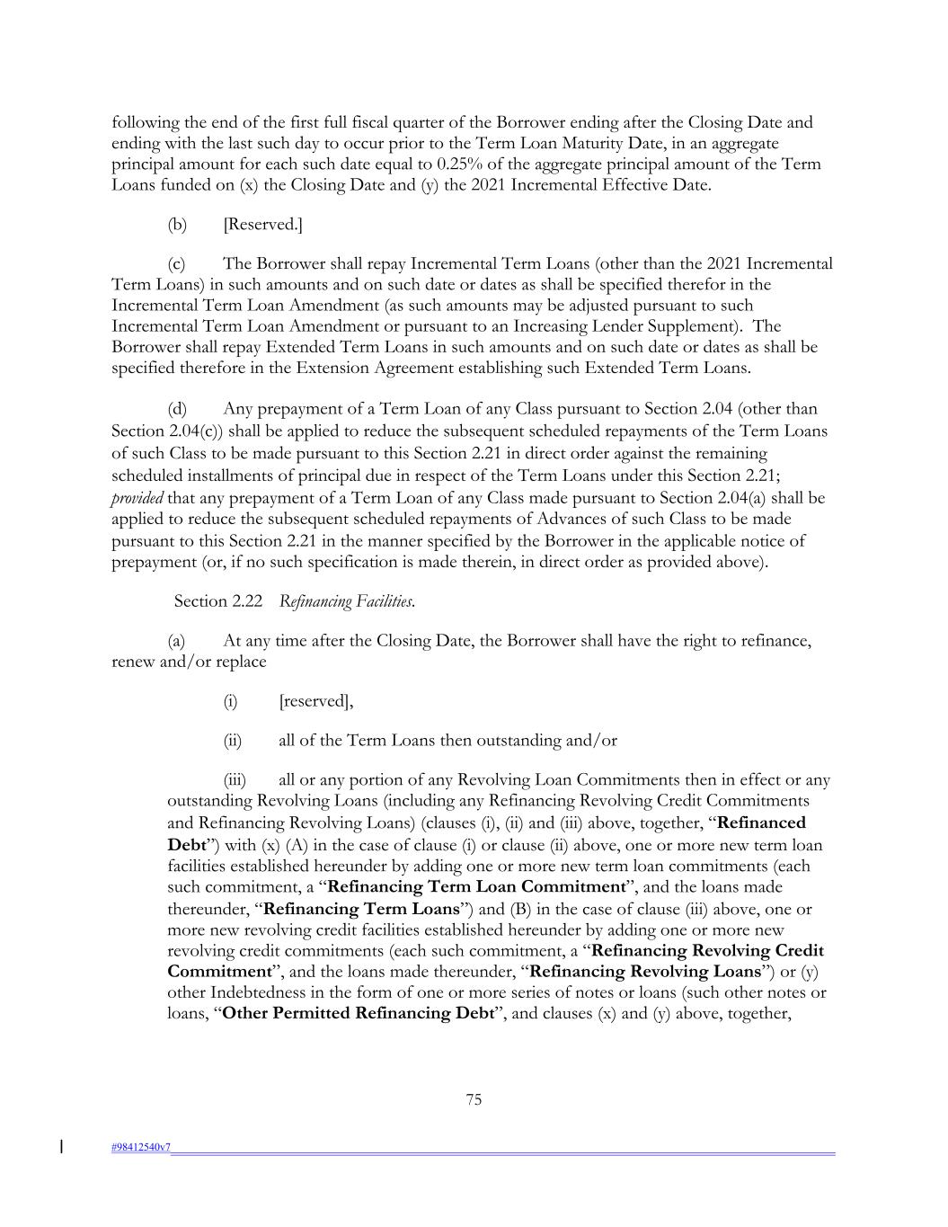 following the end of the first full fiscal quarter of the Borrower ending after the Closing Date and ending with the last such day to occur prior to the Term Loan Maturity Date, in an aggregate principal amount for each such date equal to 0.25% of the aggregate principal amount of the Term Loans funded on (x) the Closing Date and (y) the 2021 Incremental Effective Date. (b) [Reserved.] (c) The Borrower shall repay Incremental Term Loans (other than the 2021 Incremental Term Loans) in such amounts and on such date or dates as shall be specified therefor in the Incremental Term Loan Amendment (as such amounts may be adjusted pursuant to such Incremental Term Loan Amendment or pursuant to an Increasing Lender Supplement). The Borrower shall repay Extended Term Loans in such amounts and on such date or dates as shall be specified therefore in the Extension Agreement establishing such Extended Term Loans. (d) Any prepayment of a Term Loan of any Class pursuant to Section 2.04 (other than Section 2.04(c)) shall be applied to reduce the subsequent scheduled repayments of the Term Loans of such Class to be made pursuant to this Section 2.21 in direct order against the remaining scheduled installments of principal due in respect of the Term Loans under this Section 2.21; provided that any prepayment of a Term Loan of any Class made pursuant to Section 2.04(a) shall be applied to reduce the subsequent scheduled repayments of Advances of such Class to be made pursuant to this Section 2.21 in the manner specified by the Borrower in the applicable notice of prepayment (or, if no such specification is made therein, in direct order as provided above). Section 2.22 Refinancing Facilities. (a) At any time after the Closing Date, the Borrower shall have the right to refinance, renew and/or replace (i) [reserved], (ii) all of the Term Loans then outstanding and/or (iii) all or any portion of any Revolving Loan Commitments then in effect or any outstanding Revolving Loans (including any Refinancing Revolving Credit Commitments and Refinancing Revolving Loans) (clauses (i), (ii) and (iii) above, together, “Refinanced Debt”) with (x) (A) in the case of clause (i) or clause (ii) above, one or more new term loan facilities established hereunder by adding one or more new term loan commitments (each such commitment, a “Refinancing Term Loan Commitment”, and the loans made thereunder, “Refinancing Term Loans”) and (B) in the case of clause (iii) above, one or more new revolving credit facilities established hereunder by adding one or more new revolving credit commitments (each such commitment, a “Refinancing Revolving Credit Commitment”, and the loans made thereunder, “Refinancing Revolving Loans”) or (y) other Indebtedness in the form of one or more series of notes or loans (such other notes or loans, “Other Permitted Refinancing Debt”, and clauses (x) and (y) above, together, 75 #98412540v7