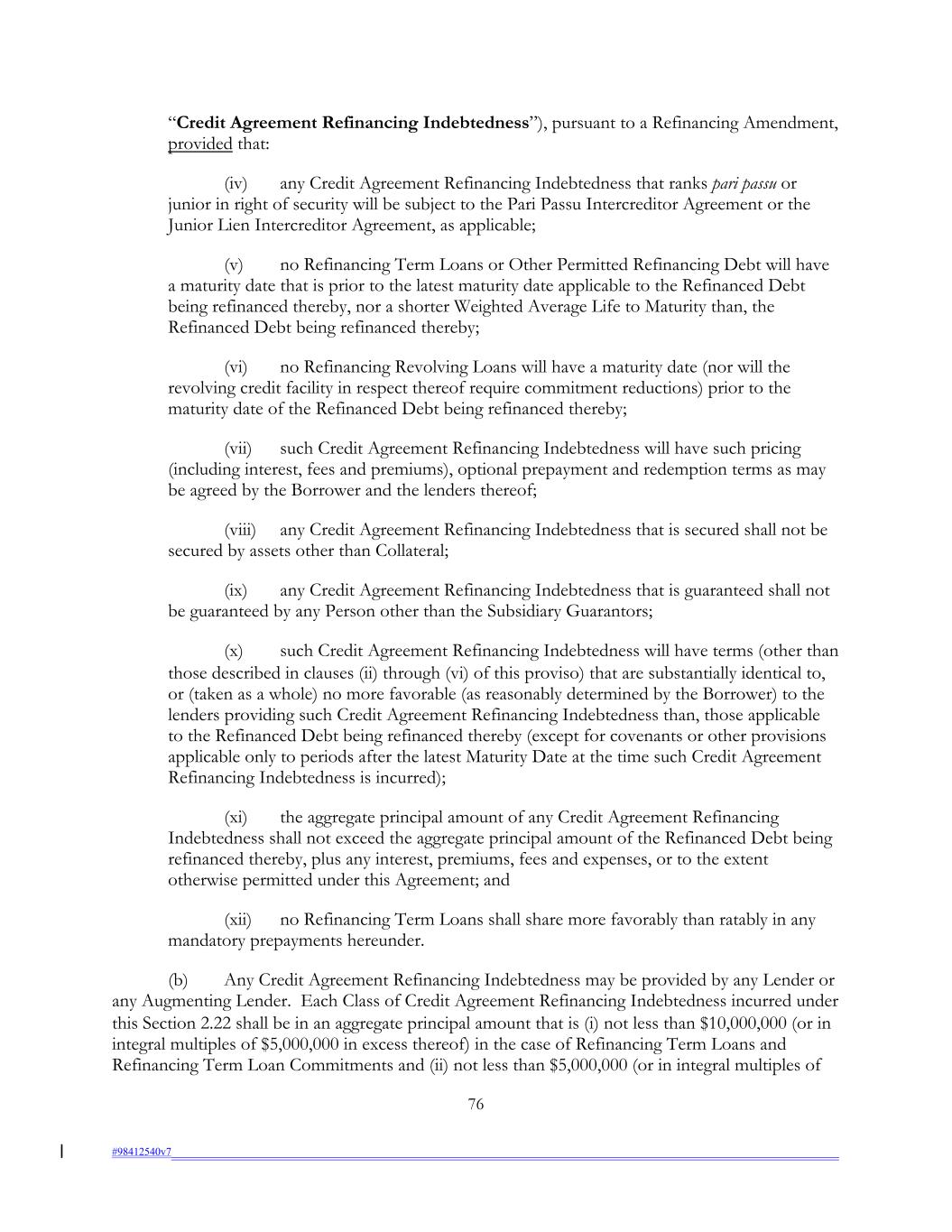 “Credit Agreement Refinancing Indebtedness”), pursuant to a Refinancing Amendment, provided that: (iv) any Credit Agreement Refinancing Indebtedness that ranks pari passu or junior in right of security will be subject to the Pari Passu Intercreditor Agreement or the Junior Lien Intercreditor Agreement, as applicable; (v) no Refinancing Term Loans or Other Permitted Refinancing Debt will have a maturity date that is prior to the latest maturity date applicable to the Refinanced Debt being refinanced thereby, nor a shorter Weighted Average Life to Maturity than, the Refinanced Debt being refinanced thereby; (vi) no Refinancing Revolving Loans will have a maturity date (nor will the revolving credit facility in respect thereof require commitment reductions) prior to the maturity date of the Refinanced Debt being refinanced thereby; (vii) such Credit Agreement Refinancing Indebtedness will have such pricing (including interest, fees and premiums), optional prepayment and redemption terms as may be agreed by the Borrower and the lenders thereof; (viii) any Credit Agreement Refinancing Indebtedness that is secured shall not be secured by assets other than Collateral; (ix) any Credit Agreement Refinancing Indebtedness that is guaranteed shall not be guaranteed by any Person other than the Subsidiary Guarantors; (x) such Credit Agreement Refinancing Indebtedness will have terms (other than those described in clauses (ii) through (vi) of this proviso) that are substantially identical to, or (taken as a whole) no more favorable (as reasonably determined by the Borrower) to the lenders providing such Credit Agreement Refinancing Indebtedness than, those applicable to the Refinanced Debt being refinanced thereby (except for covenants or other provisions applicable only to periods after the latest Maturity Date at the time such Credit Agreement Refinancing Indebtedness is incurred); (xi) the aggregate principal amount of any Credit Agreement Refinancing Indebtedness shall not exceed the aggregate principal amount of the Refinanced Debt being refinanced thereby, plus any interest, premiums, fees and expenses, or to the extent otherwise permitted under this Agreement; and (xii) no Refinancing Term Loans shall share more favorably than ratably in any mandatory prepayments hereunder. (b) Any Credit Agreement Refinancing Indebtedness may be provided by any Lender or any Augmenting Lender. Each Class of Credit Agreement Refinancing Indebtedness incurred under this Section 2.22 shall be in an aggregate principal amount that is (i) not less than $10,000,000 (or in integral multiples of $5,000,000 in excess thereof) in the case of Refinancing Term Loans and Refinancing Term Loan Commitments and (ii) not less than $5,000,000 (or in integral multiples of 76 #98412540v7
