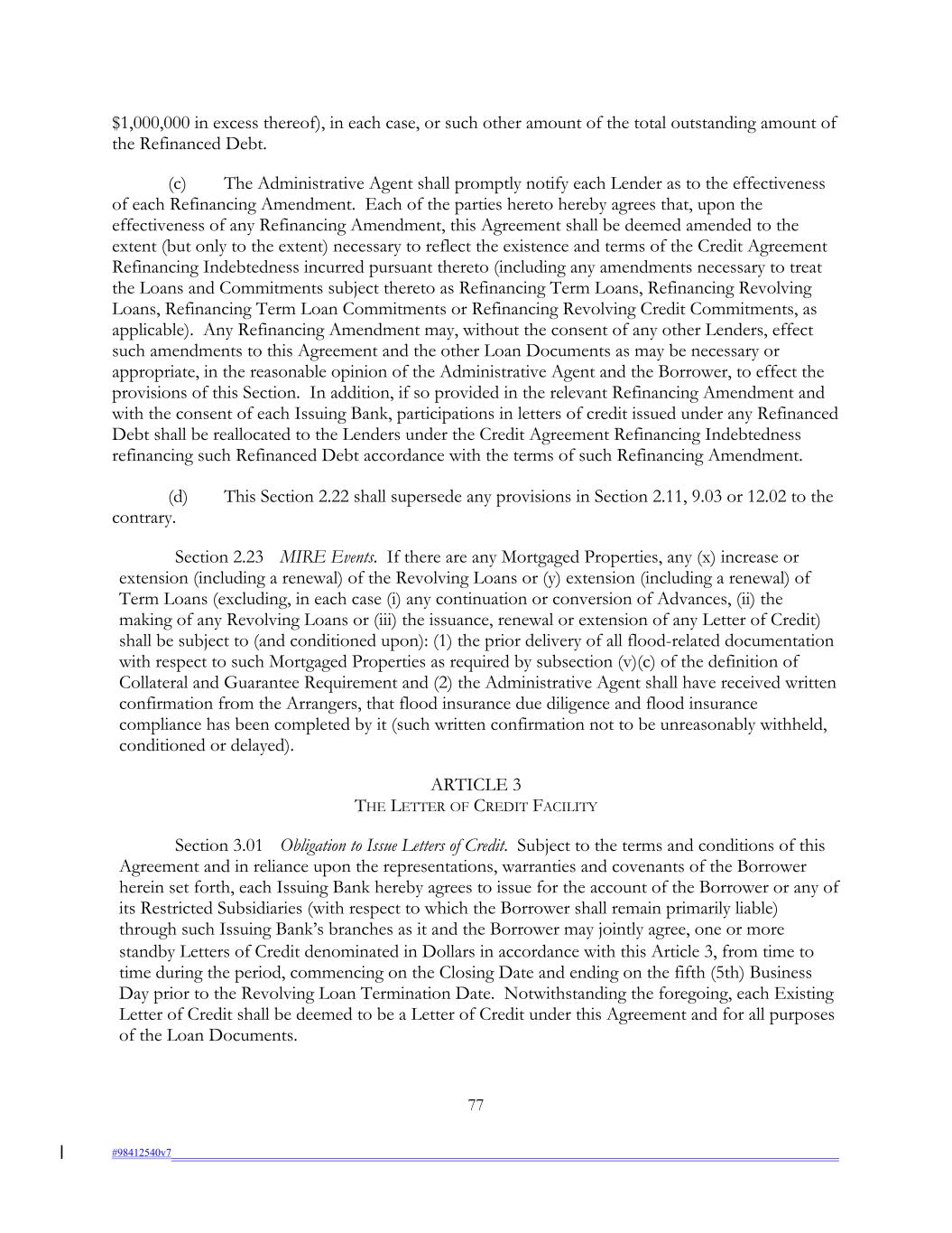 $1,000,000 in excess thereof), in each case, or such other amount of the total outstanding amount of the Refinanced Debt. (c) The Administrative Agent shall promptly notify each Lender as to the effectiveness of each Refinancing Amendment. Each of the parties hereto hereby agrees that, upon the effectiveness of any Refinancing Amendment, this Agreement shall be deemed amended to the extent (but only to the extent) necessary to reflect the existence and terms of the Credit Agreement Refinancing Indebtedness incurred pursuant thereto (including any amendments necessary to treat the Loans and Commitments subject thereto as Refinancing Term Loans, Refinancing Revolving Loans, Refinancing Term Loan Commitments or Refinancing Revolving Credit Commitments, as applicable). Any Refinancing Amendment may, without the consent of any other Lenders, effect such amendments to this Agreement and the other Loan Documents as may be necessary or appropriate, in the reasonable opinion of the Administrative Agent and the Borrower, to effect the provisions of this Section. In addition, if so provided in the relevant Refinancing Amendment and with the consent of each Issuing Bank, participations in letters of credit issued under any Refinanced Debt shall be reallocated to the Lenders under the Credit Agreement Refinancing Indebtedness refinancing such Refinanced Debt accordance with the terms of such Refinancing Amendment. (d) This Section 2.22 shall supersede any provisions in Section 2.11, 9.03 or 12.02 to the contrary. Section 2.23 MIRE Events. If there are any Mortgaged Properties, any (x) increase or extension (including a renewal) of the Revolving Loans or (y) extension (including a renewal) of Term Loans (excluding, in each case (i) any continuation or conversion of Advances, (ii) the making of any Revolving Loans or (iii) the issuance, renewal or extension of any Letter of Credit) shall be subject to (and conditioned upon): (1) the prior delivery of all flood-related documentation with respect to such Mortgaged Properties as required by subsection (v)(c) of the definition of Collateral and Guarantee Requirement and (2) the Administrative Agent shall have received written confirmation from the Arrangers, that flood insurance due diligence and flood insurance compliance has been completed by it (such written confirmation not to be unreasonably withheld, conditioned or delayed). ARTICLE 3 THE LETTER OF CREDIT FACILITY Section 3.01 Obligation to Issue Letters of Credit. Subject to the terms and conditions of this Agreement and in reliance upon the representations, warranties and covenants of the Borrower herein set forth, each Issuing Bank hereby agrees to issue for the account of the Borrower or any of its Restricted Subsidiaries (with respect to which the Borrower shall remain primarily liable) through such Issuing Bank’s branches as it and the Borrower may jointly agree, one or more standby Letters of Credit denominated in Dollars in accordance with this Article 3, from time to time during the period, commencing on the Closing Date and ending on the fifth (5th) Business Day prior to the Revolving Loan Termination Date. Notwithstanding the foregoing, each Existing Letter of Credit shall be deemed to be a Letter of Credit under this Agreement and for all purposes of the Loan Documents. 77 #98412540v7