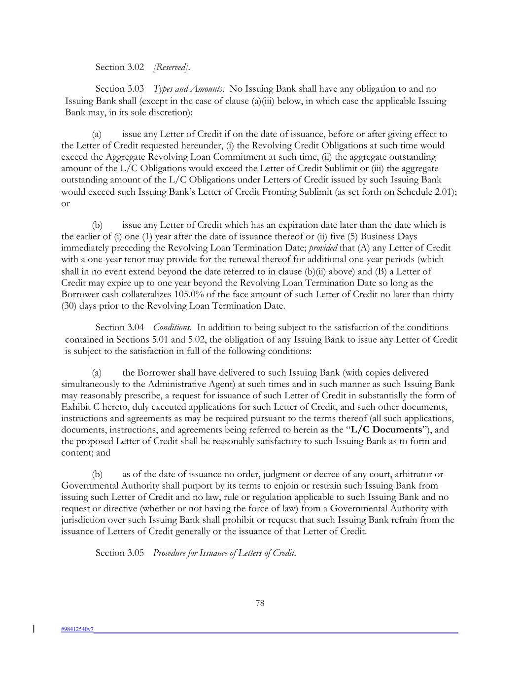 Section 3.02 [Reserved]. Section 3.03 Types and Amounts. No Issuing Bank shall have any obligation to and no Issuing Bank shall (except in the case of clause (a)(iii) below, in which case the applicable Issuing Bank may, in its sole discretion): (a) issue any Letter of Credit if on the date of issuance, before or after giving effect to the Letter of Credit requested hereunder, (i) the Revolving Credit Obligations at such time would exceed the Aggregate Revolving Loan Commitment at such time, (ii) the aggregate outstanding amount of the L/C Obligations would exceed the Letter of Credit Sublimit or (iii) the aggregate outstanding amount of the L/C Obligations under Letters of Credit issued by such Issuing Bank would exceed such Issuing Bank’s Letter of Credit Fronting Sublimit (as set forth on Schedule 2.01); or (b) issue any Letter of Credit which has an expiration date later than the date which is the earlier of (i) one (1) year after the date of issuance thereof or (ii) five (5) Business Days immediately preceding the Revolving Loan Termination Date; provided that (A) any Letter of Credit with a one-year tenor may provide for the renewal thereof for additional one-year periods (which shall in no event extend beyond the date referred to in clause (b)(ii) above) and (B) a Letter of Credit may expire up to one year beyond the Revolving Loan Termination Date so long as the Borrower cash collateralizes 105.0% of the face amount of such Letter of Credit no later than thirty (30) days prior to the Revolving Loan Termination Date. Section 3.04 Conditions. In addition to being subject to the satisfaction of the conditions contained in Sections 5.01 and 5.02, the obligation of any Issuing Bank to issue any Letter of Credit is subject to the satisfaction in full of the following conditions: (a) the Borrower shall have delivered to such Issuing Bank (with copies delivered simultaneously to the Administrative Agent) at such times and in such manner as such Issuing Bank may reasonably prescribe, a request for issuance of such Letter of Credit in substantially the form of Exhibit C hereto, duly executed applications for such Letter of Credit, and such other documents, instructions and agreements as may be required pursuant to the terms thereof (all such applications, documents, instructions, and agreements being referred to herein as the “L/C Documents”), and the proposed Letter of Credit shall be reasonably satisfactory to such Issuing Bank as to form and content; and (b) as of the date of issuance no order, judgment or decree of any court, arbitrator or Governmental Authority shall purport by its terms to enjoin or restrain such Issuing Bank from issuing such Letter of Credit and no law, rule or regulation applicable to such Issuing Bank and no request or directive (whether or not having the force of law) from a Governmental Authority with jurisdiction over such Issuing Bank shall prohibit or request that such Issuing Bank refrain from the issuance of Letters of Credit generally or the issuance of that Letter of Credit. Section 3.05 Procedure for Issuance of Letters of Credit. 78 #98412540v7