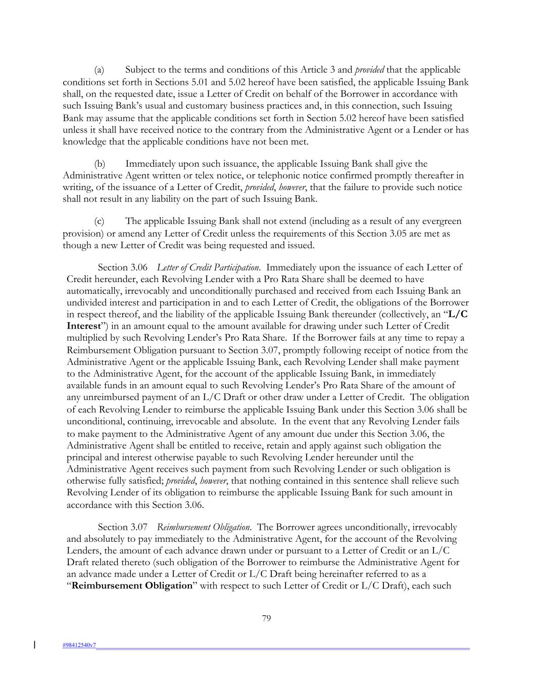 (a) Subject to the terms and conditions of this Article 3 and provided that the applicable conditions set forth in Sections 5.01 and 5.02 hereof have been satisfied, the applicable Issuing Bank shall, on the requested date, issue a Letter of Credit on behalf of the Borrower in accordance with such Issuing Bank’s usual and customary business practices and, in this connection, such Issuing Bank may assume that the applicable conditions set forth in Section 5.02 hereof have been satisfied unless it shall have received notice to the contrary from the Administrative Agent or a Lender or has knowledge that the applicable conditions have not been met. (b) Immediately upon such issuance, the applicable Issuing Bank shall give the Administrative Agent written or telex notice, or telephonic notice confirmed promptly thereafter in writing, of the issuance of a Letter of Credit, provided, however, that the failure to provide such notice shall not result in any liability on the part of such Issuing Bank. (c) The applicable Issuing Bank shall not extend (including as a result of any evergreen provision) or amend any Letter of Credit unless the requirements of this Section 3.05 are met as though a new Letter of Credit was being requested and issued. Section 3.06 Letter of Credit Participation. Immediately upon the issuance of each Letter of Credit hereunder, each Revolving Lender with a Pro Rata Share shall be deemed to have automatically, irrevocably and unconditionally purchased and received from each Issuing Bank an undivided interest and participation in and to each Letter of Credit, the obligations of the Borrower in respect thereof, and the liability of the applicable Issuing Bank thereunder (collectively, an “L/C Interest”) in an amount equal to the amount available for drawing under such Letter of Credit multiplied by such Revolving Lender’s Pro Rata Share. If the Borrower fails at any time to repay a Reimbursement Obligation pursuant to Section 3.07, promptly following receipt of notice from the Administrative Agent or the applicable Issuing Bank, each Revolving Lender shall make payment to the Administrative Agent, for the account of the applicable Issuing Bank, in immediately available funds in an amount equal to such Revolving Lender’s Pro Rata Share of the amount of any unreimbursed payment of an L/C Draft or other draw under a Letter of Credit. The obligation of each Revolving Lender to reimburse the applicable Issuing Bank under this Section 3.06 shall be unconditional, continuing, irrevocable and absolute. In the event that any Revolving Lender fails to make payment to the Administrative Agent of any amount due under this Section 3.06, the Administrative Agent shall be entitled to receive, retain and apply against such obligation the principal and interest otherwise payable to such Revolving Lender hereunder until the Administrative Agent receives such payment from such Revolving Lender or such obligation is otherwise fully satisfied; provided, however, that nothing contained in this sentence shall relieve such Revolving Lender of its obligation to reimburse the applicable Issuing Bank for such amount in accordance with this Section 3.06. Section 3.07 Reimbursement Obligation. The Borrower agrees unconditionally, irrevocably and absolutely to pay immediately to the Administrative Agent, for the account of the Revolving Lenders, the amount of each advance drawn under or pursuant to a Letter of Credit or an L/C Draft related thereto (such obligation of the Borrower to reimburse the Administrative Agent for an advance made under a Letter of Credit or L/C Draft being hereinafter referred to as a “Reimbursement Obligation” with respect to such Letter of Credit or L/C Draft), each such 79 #98412540v7