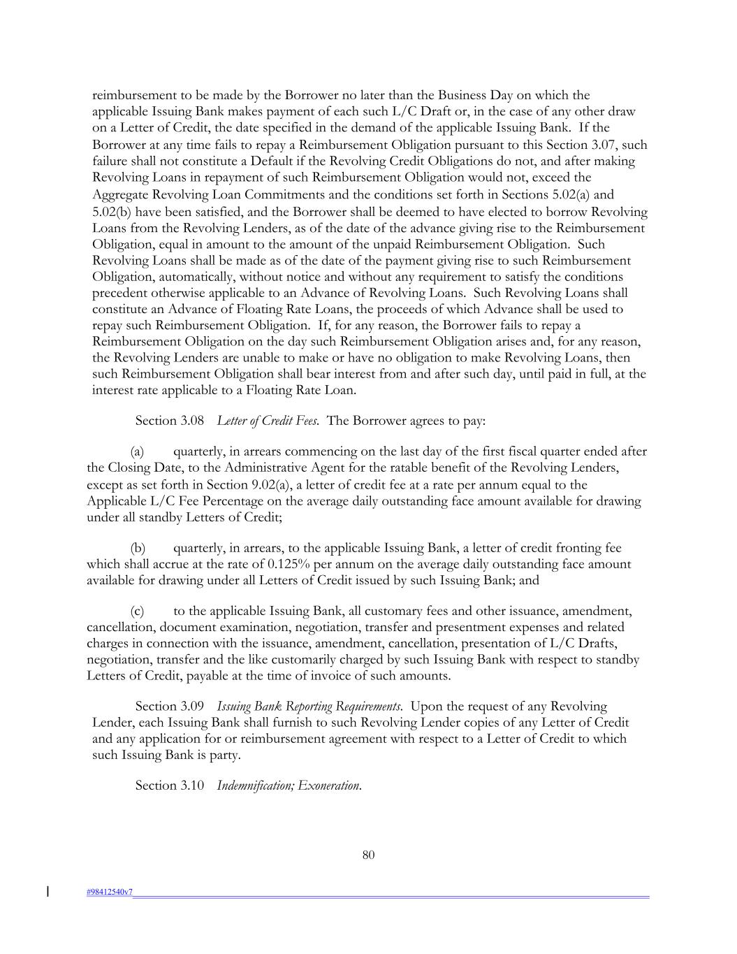 reimbursement to be made by the Borrower no later than the Business Day on which the applicable Issuing Bank makes payment of each such L/C Draft or, in the case of any other draw on a Letter of Credit, the date specified in the demand of the applicable Issuing Bank. If the Borrower at any time fails to repay a Reimbursement Obligation pursuant to this Section 3.07, such failure shall not constitute a Default if the Revolving Credit Obligations do not, and after making Revolving Loans in repayment of such Reimbursement Obligation would not, exceed the Aggregate Revolving Loan Commitments and the conditions set forth in Sections 5.02(a) and 5.02(b) have been satisfied, and the Borrower shall be deemed to have elected to borrow Revolving Loans from the Revolving Lenders, as of the date of the advance giving rise to the Reimbursement Obligation, equal in amount to the amount of the unpaid Reimbursement Obligation. Such Revolving Loans shall be made as of the date of the payment giving rise to such Reimbursement Obligation, automatically, without notice and without any requirement to satisfy the conditions precedent otherwise applicable to an Advance of Revolving Loans. Such Revolving Loans shall constitute an Advance of Floating Rate Loans, the proceeds of which Advance shall be used to repay such Reimbursement Obligation. If, for any reason, the Borrower fails to repay a Reimbursement Obligation on the day such Reimbursement Obligation arises and, for any reason, the Revolving Lenders are unable to make or have no obligation to make Revolving Loans, then such Reimbursement Obligation shall bear interest from and after such day, until paid in full, at the interest rate applicable to a Floating Rate Loan. Section 3.08 Letter of Credit Fees. The Borrower agrees to pay: (a) quarterly, in arrears commencing on the last day of the first fiscal quarter ended after the Closing Date, to the Administrative Agent for the ratable benefit of the Revolving Lenders, except as set forth in Section 9.02(a), a letter of credit fee at a rate per annum equal to the Applicable L/C Fee Percentage on the average daily outstanding face amount available for drawing under all standby Letters of Credit; (b) quarterly, in arrears, to the applicable Issuing Bank, a letter of credit fronting fee which shall accrue at the rate of 0.125% per annum on the average daily outstanding face amount available for drawing under all Letters of Credit issued by such Issuing Bank; and (c) to the applicable Issuing Bank, all customary fees and other issuance, amendment, cancellation, document examination, negotiation, transfer and presentment expenses and related charges in connection with the issuance, amendment, cancellation, presentation of L/C Drafts, negotiation, transfer and the like customarily charged by such Issuing Bank with respect to standby Letters of Credit, payable at the time of invoice of such amounts. Section 3.09 Issuing Bank Reporting Requirements. Upon the request of any Revolving Lender, each Issuing Bank shall furnish to such Revolving Lender copies of any Letter of Credit and any application for or reimbursement agreement with respect to a Letter of Credit to which such Issuing Bank is party. Section 3.10 Indemnification; Exoneration. 80 #98412540v7
