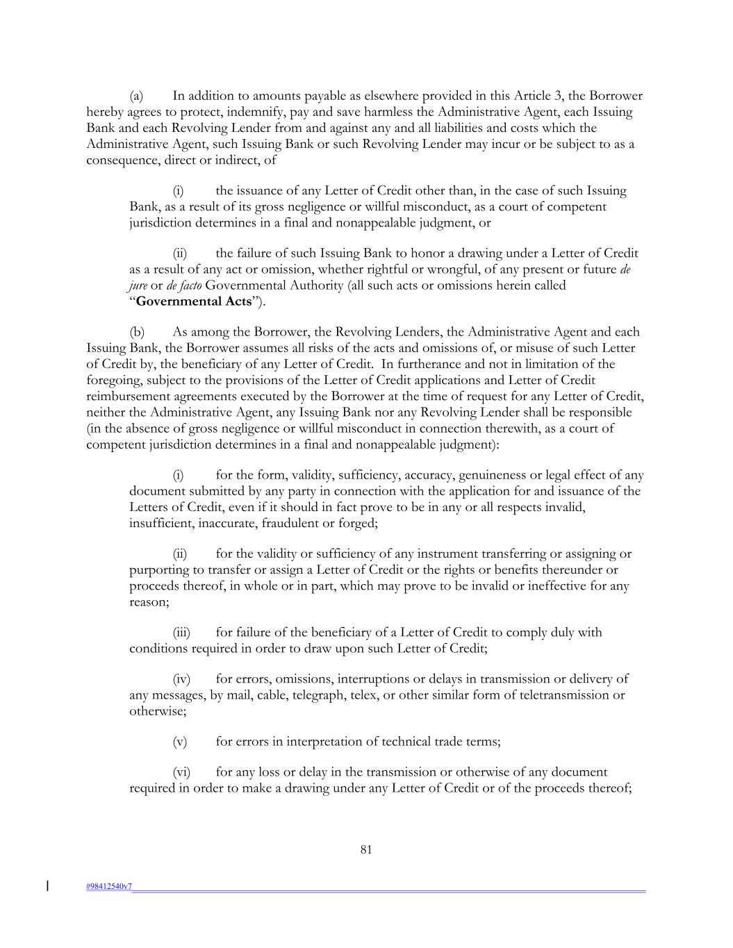 (a) In addition to amounts payable as elsewhere provided in this Article 3, the Borrower hereby agrees to protect, indemnify, pay and save harmless the Administrative Agent, each Issuing Bank and each Revolving Lender from and against any and all liabilities and costs which the Administrative Agent, such Issuing Bank or such Revolving Lender may incur or be subject to as a consequence, direct or indirect, of (i) the issuance of any Letter of Credit other than, in the case of such Issuing Bank, as a result of its gross negligence or willful misconduct, as a court of competent jurisdiction determines in a final and nonappealable judgment, or (ii) the failure of such Issuing Bank to honor a drawing under a Letter of Credit as a result of any act or omission, whether rightful or wrongful, of any present or future de jure or de facto Governmental Authority (all such acts or omissions herein called “Governmental Acts”). (b) As among the Borrower, the Revolving Lenders, the Administrative Agent and each Issuing Bank, the Borrower assumes all risks of the acts and omissions of, or misuse of such Letter of Credit by, the beneficiary of any Letter of Credit. In furtherance and not in limitation of the foregoing, subject to the provisions of the Letter of Credit applications and Letter of Credit reimbursement agreements executed by the Borrower at the time of request for any Letter of Credit, neither the Administrative Agent, any Issuing Bank nor any Revolving Lender shall be responsible (in the absence of gross negligence or willful misconduct in connection therewith, as a court of competent jurisdiction determines in a final and nonappealable judgment): (i) for the form, validity, sufficiency, accuracy, genuineness or legal effect of any document submitted by any party in connection with the application for and issuance of the Letters of Credit, even if it should in fact prove to be in any or all respects invalid, insufficient, inaccurate, fraudulent or forged; (ii) for the validity or sufficiency of any instrument transferring or assigning or purporting to transfer or assign a Letter of Credit or the rights or benefits thereunder or proceeds thereof, in whole or in part, which may prove to be invalid or ineffective for any reason; (iii) for failure of the beneficiary of a Letter of Credit to comply duly with conditions required in order to draw upon such Letter of Credit; (iv) for errors, omissions, interruptions or delays in transmission or delivery of any messages, by mail, cable, telegraph, telex, or other similar form of teletransmission or otherwise; (v) for errors in interpretation of technical trade terms; (vi) for any loss or delay in the transmission or otherwise of any document required in order to make a drawing under any Letter of Credit or of the proceeds thereof; 81 #98412540v7