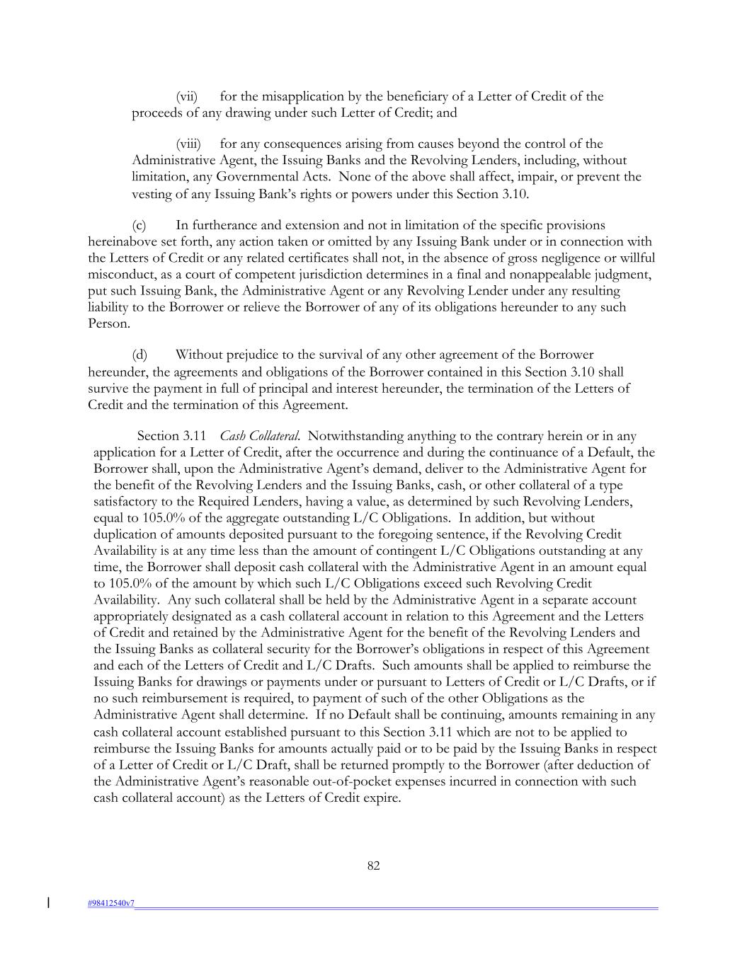 (vii) for the misapplication by the beneficiary of a Letter of Credit of the proceeds of any drawing under such Letter of Credit; and (viii) for any consequences arising from causes beyond the control of the Administrative Agent, the Issuing Banks and the Revolving Lenders, including, without limitation, any Governmental Acts. None of the above shall affect, impair, or prevent the vesting of any Issuing Bank’s rights or powers under this Section 3.10. (c) In furtherance and extension and not in limitation of the specific provisions hereinabove set forth, any action taken or omitted by any Issuing Bank under or in connection with the Letters of Credit or any related certificates shall not, in the absence of gross negligence or willful misconduct, as a court of competent jurisdiction determines in a final and nonappealable judgment, put such Issuing Bank, the Administrative Agent or any Revolving Lender under any resulting liability to the Borrower or relieve the Borrower of any of its obligations hereunder to any such Person. (d) Without prejudice to the survival of any other agreement of the Borrower hereunder, the agreements and obligations of the Borrower contained in this Section 3.10 shall survive the payment in full of principal and interest hereunder, the termination of the Letters of Credit and the termination of this Agreement. Section 3.11 Cash Collateral. Notwithstanding anything to the contrary herein or in any application for a Letter of Credit, after the occurrence and during the continuance of a Default, the Borrower shall, upon the Administrative Agent’s demand, deliver to the Administrative Agent for the benefit of the Revolving Lenders and the Issuing Banks, cash, or other collateral of a type satisfactory to the Required Lenders, having a value, as determined by such Revolving Lenders, equal to 105.0% of the aggregate outstanding L/C Obligations. In addition, but without duplication of amounts deposited pursuant to the foregoing sentence, if the Revolving Credit Availability is at any time less than the amount of contingent L/C Obligations outstanding at any time, the Borrower shall deposit cash collateral with the Administrative Agent in an amount equal to 105.0% of the amount by which such L/C Obligations exceed such Revolving Credit Availability. Any such collateral shall be held by the Administrative Agent in a separate account appropriately designated as a cash collateral account in relation to this Agreement and the Letters of Credit and retained by the Administrative Agent for the benefit of the Revolving Lenders and the Issuing Banks as collateral security for the Borrower’s obligations in respect of this Agreement and each of the Letters of Credit and L/C Drafts. Such amounts shall be applied to reimburse the Issuing Banks for drawings or payments under or pursuant to Letters of Credit or L/C Drafts, or if no such reimbursement is required, to payment of such of the other Obligations as the Administrative Agent shall determine. If no Default shall be continuing, amounts remaining in any cash collateral account established pursuant to this Section 3.11 which are not to be applied to reimburse the Issuing Banks for amounts actually paid or to be paid by the Issuing Banks in respect of a Letter of Credit or L/C Draft, shall be returned promptly to the Borrower (after deduction of the Administrative Agent’s reasonable out-of-pocket expenses incurred in connection with such cash collateral account) as the Letters of Credit expire. 82 #98412540v7