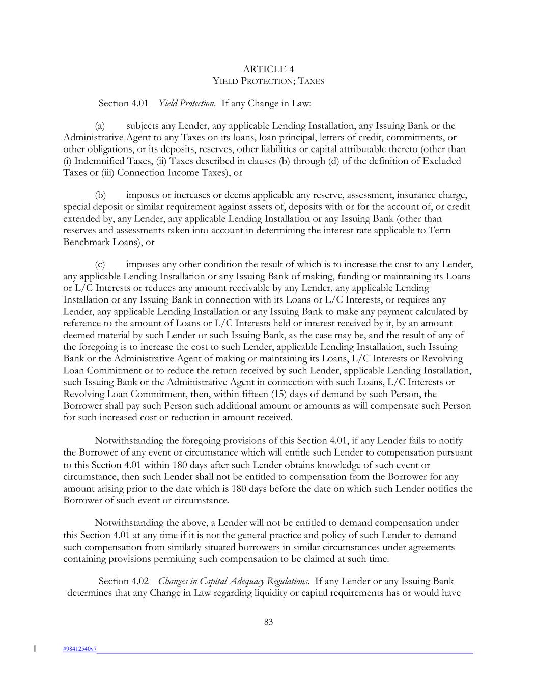 ARTICLE 4 YIELD PROTECTION; TAXES Section 4.01 Yield Protection. If any Change in Law: (a) subjects any Lender, any applicable Lending Installation, any Issuing Bank or the Administrative Agent to any Taxes on its loans, loan principal, letters of credit, commitments, or other obligations, or its deposits, reserves, other liabilities or capital attributable thereto (other than (i) Indemnified Taxes, (ii) Taxes described in clauses (b) through (d) of the definition of Excluded Taxes or (iii) Connection Income Taxes), or (b) imposes or increases or deems applicable any reserve, assessment, insurance charge, special deposit or similar requirement against assets of, deposits with or for the account of, or credit extended by, any Lender, any applicable Lending Installation or any Issuing Bank (other than reserves and assessments taken into account in determining the interest rate applicable to Term Benchmark Loans), or (c) imposes any other condition the result of which is to increase the cost to any Lender, any applicable Lending Installation or any Issuing Bank of making, funding or maintaining its Loans or L/C Interests or reduces any amount receivable by any Lender, any applicable Lending Installation or any Issuing Bank in connection with its Loans or L/C Interests, or requires any Lender, any applicable Lending Installation or any Issuing Bank to make any payment calculated by reference to the amount of Loans or L/C Interests held or interest received by it, by an amount deemed material by such Lender or such Issuing Bank, as the case may be, and the result of any of the foregoing is to increase the cost to such Lender, applicable Lending Installation, such Issuing Bank or the Administrative Agent of making or maintaining its Loans, L/C Interests or Revolving Loan Commitment or to reduce the return received by such Lender, applicable Lending Installation, such Issuing Bank or the Administrative Agent in connection with such Loans, L/C Interests or Revolving Loan Commitment, then, within fifteen (15) days of demand by such Person, the Borrower shall pay such Person such additional amount or amounts as will compensate such Person for such increased cost or reduction in amount received. Notwithstanding the foregoing provisions of this Section 4.01, if any Lender fails to notify the Borrower of any event or circumstance which will entitle such Lender to compensation pursuant to this Section 4.01 within 180 days after such Lender obtains knowledge of such event or circumstance, then such Lender shall not be entitled to compensation from the Borrower for any amount arising prior to the date which is 180 days before the date on which such Lender notifies the Borrower of such event or circumstance. Notwithstanding the above, a Lender will not be entitled to demand compensation under this Section 4.01 at any time if it is not the general practice and policy of such Lender to demand such compensation from similarly situated borrowers in similar circumstances under agreements containing provisions permitting such compensation to be claimed at such time. Section 4.02 Changes in Capital Adequacy Regulations. If any Lender or any Issuing Bank determines that any Change in Law regarding liquidity or capital requirements has or would have 83 #98412540v7