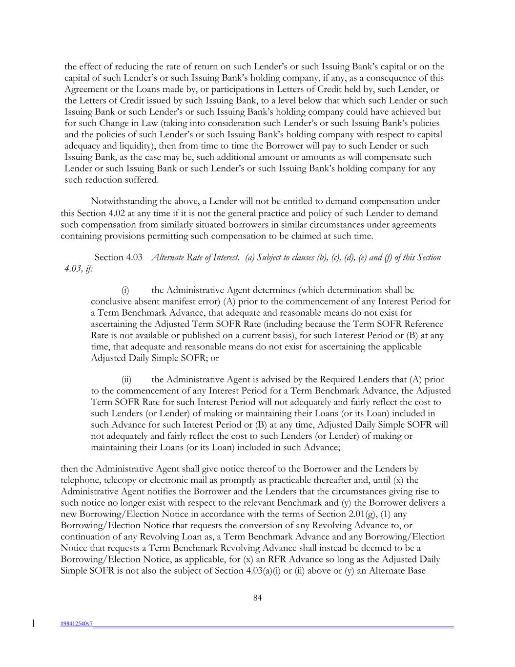 the effect of reducing the rate of return on such Lender’s or such Issuing Bank’s capital or on the capital of such Lender’s or such Issuing Bank’s holding company, if any, as a consequence of this Agreement or the Loans made by, or participations in Letters of Credit held by, such Lender, or the Letters of Credit issued by such Issuing Bank, to a level below that which such Lender or such Issuing Bank or such Lender’s or such Issuing Bank’s holding company could have achieved but for such Change in Law (taking into consideration such Lender’s or such Issuing Bank’s policies and the policies of such Lender’s or such Issuing Bank’s holding company with respect to capital adequacy and liquidity), then from time to time the Borrower will pay to such Lender or such Issuing Bank, as the case may be, such additional amount or amounts as will compensate such Lender or such Issuing Bank or such Lender’s or such Issuing Bank’s holding company for any such reduction suffered. Notwithstanding the above, a Lender will not be entitled to demand compensation under this Section 4.02 at any time if it is not the general practice and policy of such Lender to demand such compensation from similarly situated borrowers in similar circumstances under agreements containing provisions permitting such compensation to be claimed at such time. Section 4.03 Alternate Rate of Interest. (a) Subject to clauses (b), (c), (d), (e) and (f) of this Section 4.03, if: (i) the Administrative Agent determines (which determination shall be conclusive absent manifest error) (A) prior to the commencement of any Interest Period for a Term Benchmark Advance, that adequate and reasonable means do not exist for ascertaining the Adjusted Term SOFR Rate (including because the Term SOFR Reference Rate is not available or published on a current basis), for such Interest Period or (B) at any time, that adequate and reasonable means do not exist for ascertaining the applicable Adjusted Daily Simple SOFR; or (ii) the Administrative Agent is advised by the Required Lenders that (A) prior to the commencement of any Interest Period for a Term Benchmark Advance, the Adjusted Term SOFR Rate for such Interest Period will not adequately and fairly reflect the cost to such Lenders (or Lender) of making or maintaining their Loans (or its Loan) included in such Advance for such Interest Period or (B) at any time, Adjusted Daily Simple SOFR will not adequately and fairly reflect the cost to such Lenders (or Lender) of making or maintaining their Loans (or its Loan) included in such Advance; then the Administrative Agent shall give notice thereof to the Borrower and the Lenders by telephone, telecopy or electronic mail as promptly as practicable thereafter and, until (x) the Administrative Agent notifies the Borrower and the Lenders that the circumstances giving rise to such notice no longer exist with respect to the relevant Benchmark and (y) the Borrower delivers a new Borrowing/Election Notice in accordance with the terms of Section 2.01(g), (1) any Borrowing/Election Notice that requests the conversion of any Revolving Advance to, or continuation of any Revolving Loan as, a Term Benchmark Advance and any Borrowing/Election Notice that requests a Term Benchmark Revolving Advance shall instead be deemed to be a Borrowing/Election Notice, as applicable, for (x) an RFR Advance so long as the Adjusted Daily Simple SOFR is not also the subject of Section 4.03(a)(i) or (ii) above or (y) an Alternate Base 84 #98412540v7