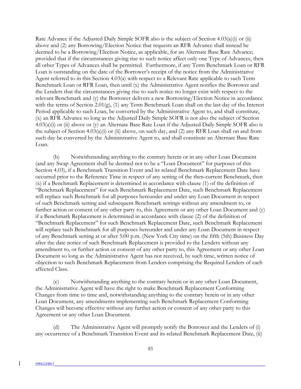 Rate Advance if the Adjusted Daily Simple SOFR also is the subject of Section 4.03(a)(i) or (ii) above and (2) any Borrowing/Election Notice that requests an RFR Advance shall instead be deemed to be a Borrowing/Election Notice, as applicable, for an Alternate Base Rate Advance; provided that if the circumstances giving rise to such notice affect only one Type of Advances, then all other Types of Advances shall be permitted. Furthermore, if any Term Benchmark Loan or RFR Loan is outstanding on the date of the Borrower’s receipt of the notice from the Administrative Agent referred to in this Section 4.03(a) with respect to a Relevant Rate applicable to such Term Benchmark Loan or RFR Loan, then until (x) the Administrative Agent notifies the Borrower and the Lenders that the circumstances giving rise to such notice no longer exist with respect to the relevant Benchmark and (y) the Borrower delivers a new Borrowing/Election Notice in accordance with the terms of Section 2.01(g), (1) any Term Benchmark Loan shall on the last day of the Interest Period applicable to such Loan, be converted by the Administrative Agent to, and shall constitute, (x) an RFR Advance so long as the Adjusted Daily Simple SOFR is not also the subject of Section 4.03(a)(i) or (ii) above or (y) an Alternate Base Rate Loan if the Adjusted Daily Simple SOFR also is the subject of Section 4.03(a)(i) or (ii) above, on such day, and (2) any RFR Loan shall on and from such day be converted by the Administrative Agent to, and shall constitute an Alternate Base Rate Loan. (b) Notwithstanding anything to the contrary herein or in any other Loan Document (and any Swap Agreement shall be deemed not to be a “Loan Document” for purposes of this Section 4.03), if a Benchmark Transition Event and its related Benchmark Replacement Date have occurred prior to the Reference Time in respect of any setting of the then-current Benchmark, then (x) if a Benchmark Replacement is determined in accordance with clause (1) of the definition of “Benchmark Replacement” for such Benchmark Replacement Date, such Benchmark Replacement will replace such Benchmark for all purposes hereunder and under any Loan Document in respect of such Benchmark setting and subsequent Benchmark settings without any amendment to, or further action or consent of any other party to, this Agreement or any other Loan Document and (y) if a Benchmark Replacement is determined in accordance with clause (2) of the definition of “Benchmark Replacement” for such Benchmark Replacement Date, such Benchmark Replacement will replace such Benchmark for all purposes hereunder and under any Loan Document in respect of any Benchmark setting at or after 5:00 p.m. (New York City time) on the fifth (5th) Business Day after the date notice of such Benchmark Replacement is provided to the Lenders without any amendment to, or further action or consent of any other party to, this Agreement or any other Loan Document so long as the Administrative Agent has not received, by such time, written notice of objection to such Benchmark Replacement from Lenders comprising the Required Lenders of each affected Class. (c) Notwithstanding anything to the contrary herein or in any other Loan Document, the Administrative Agent will have the right to make Benchmark Replacement Conforming Changes from time to time and, notwithstanding anything to the contrary herein or in any other Loan Document, any amendments implementing such Benchmark Replacement Conforming Changes will become effective without any further action or consent of any other party to this Agreement or any other Loan Document. (d) The Administrative Agent will promptly notify the Borrower and the Lenders of (i) any occurrence of a Benchmark Transition Event and its related Benchmark Replacement Date, (ii) 85 #98412540v7