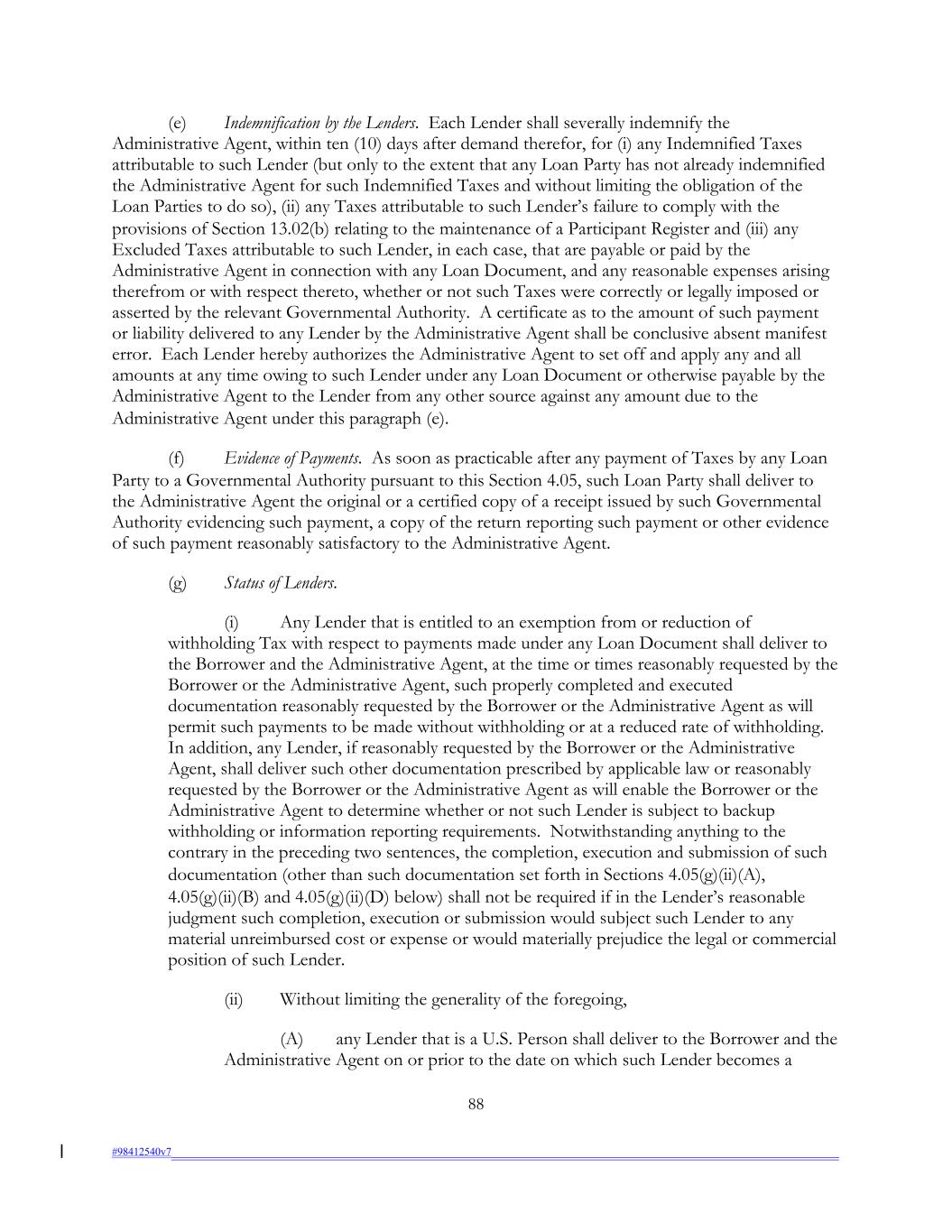 (e) Indemnification by the Lenders. Each Lender shall severally indemnify the Administrative Agent, within ten (10) days after demand therefor, for (i) any Indemnified Taxes attributable to such Lender (but only to the extent that any Loan Party has not already indemnified the Administrative Agent for such Indemnified Taxes and without limiting the obligation of the Loan Parties to do so), (ii) any Taxes attributable to such Lender’s failure to comply with the provisions of Section 13.02(b) relating to the maintenance of a Participant Register and (iii) any Excluded Taxes attributable to such Lender, in each case, that are payable or paid by the Administrative Agent in connection with any Loan Document, and any reasonable expenses arising therefrom or with respect thereto, whether or not such Taxes were correctly or legally imposed or asserted by the relevant Governmental Authority. A certificate as to the amount of such payment or liability delivered to any Lender by the Administrative Agent shall be conclusive absent manifest error. Each Lender hereby authorizes the Administrative Agent to set off and apply any and all amounts at any time owing to such Lender under any Loan Document or otherwise payable by the Administrative Agent to the Lender from any other source against any amount due to the Administrative Agent under this paragraph (e). (f) Evidence of Payments. As soon as practicable after any payment of Taxes by any Loan Party to a Governmental Authority pursuant to this Section 4.05, such Loan Party shall deliver to the Administrative Agent the original or a certified copy of a receipt issued by such Governmental Authority evidencing such payment, a copy of the return reporting such payment or other evidence of such payment reasonably satisfactory to the Administrative Agent. (g) Status of Lenders. (i) Any Lender that is entitled to an exemption from or reduction of withholding Tax with respect to payments made under any Loan Document shall deliver to the Borrower and the Administrative Agent, at the time or times reasonably requested by the Borrower or the Administrative Agent, such properly completed and executed documentation reasonably requested by the Borrower or the Administrative Agent as will permit such payments to be made without withholding or at a reduced rate of withholding. In addition, any Lender, if reasonably requested by the Borrower or the Administrative Agent, shall deliver such other documentation prescribed by applicable law or reasonably requested by the Borrower or the Administrative Agent as will enable the Borrower or the Administrative Agent to determine whether or not such Lender is subject to backup withholding or information reporting requirements. Notwithstanding anything to the contrary in the preceding two sentences, the completion, execution and submission of such documentation (other than such documentation set forth in Sections 4.05(g)(ii)(A), 4.05(g)(ii)(B) and 4.05(g)(ii)(D) below) shall not be required if in the Lender’s reasonable judgment such completion, execution or submission would subject such Lender to any material unreimbursed cost or expense or would materially prejudice the legal or commercial position of such Lender. (ii) Without limiting the generality of the foregoing, (A) any Lender that is a U.S. Person shall deliver to the Borrower and the Administrative Agent on or prior to the date on which such Lender becomes a 88 #98412540v7