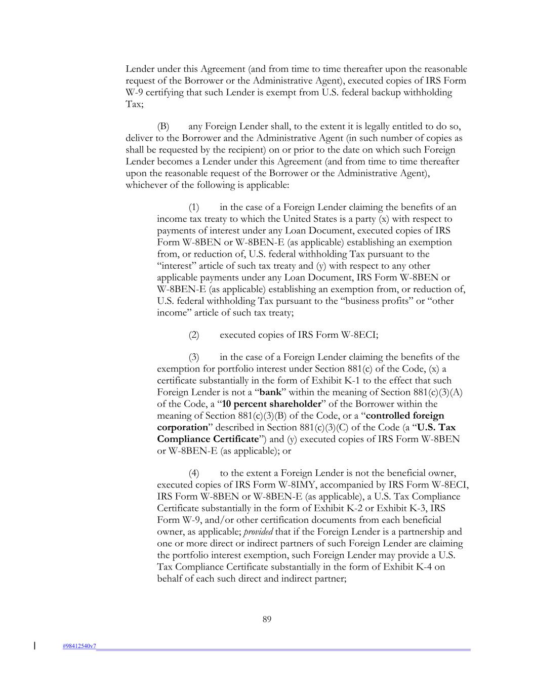 Lender under this Agreement (and from time to time thereafter upon the reasonable request of the Borrower or the Administrative Agent), executed copies of IRS Form W-9 certifying that such Lender is exempt from U.S. federal backup withholding Tax; (B) any Foreign Lender shall, to the extent it is legally entitled to do so, deliver to the Borrower and the Administrative Agent (in such number of copies as shall be requested by the recipient) on or prior to the date on which such Foreign Lender becomes a Lender under this Agreement (and from time to time thereafter upon the reasonable request of the Borrower or the Administrative Agent), whichever of the following is applicable: (1) in the case of a Foreign Lender claiming the benefits of an income tax treaty to which the United States is a party (x) with respect to payments of interest under any Loan Document, executed copies of IRS Form W-8BEN or W-8BEN-E (as applicable) establishing an exemption from, or reduction of, U.S. federal withholding Tax pursuant to the “interest” article of such tax treaty and (y) with respect to any other applicable payments under any Loan Document, IRS Form W-8BEN or W-8BEN-E (as applicable) establishing an exemption from, or reduction of, U.S. federal withholding Tax pursuant to the “business profits” or “other income” article of such tax treaty; (2) executed copies of IRS Form W-8ECI; (3) in the case of a Foreign Lender claiming the benefits of the exemption for portfolio interest under Section 881(c) of the Code, (x) a certificate substantially in the form of Exhibit K-1 to the effect that such Foreign Lender is not a “bank” within the meaning of Section 881(c)(3)(A) of the Code, a “10 percent shareholder” of the Borrower within the meaning of Section 881(c)(3)(B) of the Code, or a “controlled foreign corporation” described in Section 881(c)(3)(C) of the Code (a “U.S. Tax Compliance Certificate”) and (y) executed copies of IRS Form W-8BEN or W-8BEN-E (as applicable); or (4) to the extent a Foreign Lender is not the beneficial owner, executed copies of IRS Form W-8IMY, accompanied by IRS Form W-8ECI, IRS Form W-8BEN or W-8BEN-E (as applicable), a U.S. Tax Compliance Certificate substantially in the form of Exhibit K-2 or Exhibit K-3, IRS Form W-9, and/or other certification documents from each beneficial owner, as applicable; provided that if the Foreign Lender is a partnership and one or more direct or indirect partners of such Foreign Lender are claiming the portfolio interest exemption, such Foreign Lender may provide a U.S. Tax Compliance Certificate substantially in the form of Exhibit K-4 on behalf of each such direct and indirect partner; 89 #98412540v7