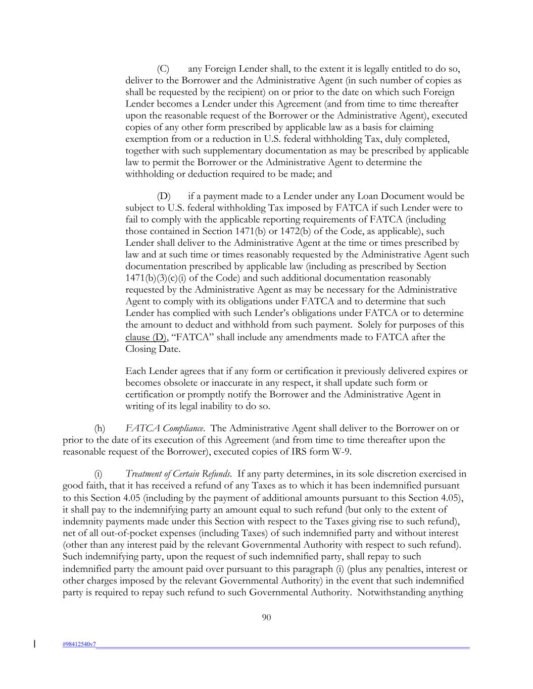(C) any Foreign Lender shall, to the extent it is legally entitled to do so, deliver to the Borrower and the Administrative Agent (in such number of copies as shall be requested by the recipient) on or prior to the date on which such Foreign Lender becomes a Lender under this Agreement (and from time to time thereafter upon the reasonable request of the Borrower or the Administrative Agent), executed copies of any other form prescribed by applicable law as a basis for claiming exemption from or a reduction in U.S. federal withholding Tax, duly completed, together with such supplementary documentation as may be prescribed by applicable law to permit the Borrower or the Administrative Agent to determine the withholding or deduction required to be made; and (D) if a payment made to a Lender under any Loan Document would be subject to U.S. federal withholding Tax imposed by FATCA if such Lender were to fail to comply with the applicable reporting requirements of FATCA (including those contained in Section 1471(b) or 1472(b) of the Code, as applicable), such Lender shall deliver to the Administrative Agent at the time or times prescribed by law and at such time or times reasonably requested by the Administrative Agent such documentation prescribed by applicable law (including as prescribed by Section 1471(b)(3)(c)(i) of the Code) and such additional documentation reasonably requested by the Administrative Agent as may be necessary for the Administrative Agent to comply with its obligations under FATCA and to determine that such Lender has complied with such Lender’s obligations under FATCA or to determine the amount to deduct and withhold from such payment. Solely for purposes of this clause (D), “FATCA” shall include any amendments made to FATCA after the Closing Date. Each Lender agrees that if any form or certification it previously delivered expires or becomes obsolete or inaccurate in any respect, it shall update such form or certification or promptly notify the Borrower and the Administrative Agent in writing of its legal inability to do so. (h) FATCA Compliance. The Administrative Agent shall deliver to the Borrower on or prior to the date of its execution of this Agreement (and from time to time thereafter upon the reasonable request of the Borrower), executed copies of IRS form W-9. (i) Treatment of Certain Refunds. If any party determines, in its sole discretion exercised in good faith, that it has received a refund of any Taxes as to which it has been indemnified pursuant to this Section 4.05 (including by the payment of additional amounts pursuant to this Section 4.05), it shall pay to the indemnifying party an amount equal to such refund (but only to the extent of indemnity payments made under this Section with respect to the Taxes giving rise to such refund), net of all out-of-pocket expenses (including Taxes) of such indemnified party and without interest (other than any interest paid by the relevant Governmental Authority with respect to such refund). Such indemnifying party, upon the request of such indemnified party, shall repay to such indemnified party the amount paid over pursuant to this paragraph (i) (plus any penalties, interest or other charges imposed by the relevant Governmental Authority) in the event that such indemnified party is required to repay such refund to such Governmental Authority. Notwithstanding anything 90 #98412540v7