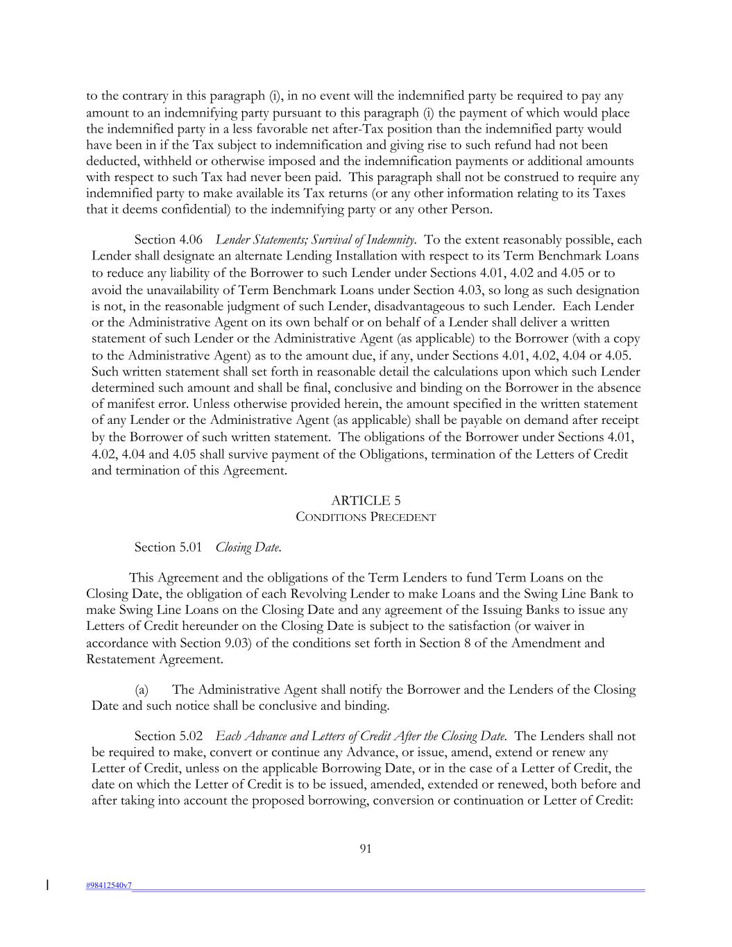 to the contrary in this paragraph (i), in no event will the indemnified party be required to pay any amount to an indemnifying party pursuant to this paragraph (i) the payment of which would place the indemnified party in a less favorable net after-Tax position than the indemnified party would have been in if the Tax subject to indemnification and giving rise to such refund had not been deducted, withheld or otherwise imposed and the indemnification payments or additional amounts with respect to such Tax had never been paid. This paragraph shall not be construed to require any indemnified party to make available its Tax returns (or any other information relating to its Taxes that it deems confidential) to the indemnifying party or any other Person. Section 4.06 Lender Statements; Survival of Indemnity. To the extent reasonably possible, each Lender shall designate an alternate Lending Installation with respect to its Term Benchmark Loans to reduce any liability of the Borrower to such Lender under Sections 4.01, 4.02 and 4.05 or to avoid the unavailability of Term Benchmark Loans under Section 4.03, so long as such designation is not, in the reasonable judgment of such Lender, disadvantageous to such Lender. Each Lender or the Administrative Agent on its own behalf or on behalf of a Lender shall deliver a written statement of such Lender or the Administrative Agent (as applicable) to the Borrower (with a copy to the Administrative Agent) as to the amount due, if any, under Sections 4.01, 4.02, 4.04 or 4.05. Such written statement shall set forth in reasonable detail the calculations upon which such Lender determined such amount and shall be final, conclusive and binding on the Borrower in the absence of manifest error. Unless otherwise provided herein, the amount specified in the written statement of any Lender or the Administrative Agent (as applicable) shall be payable on demand after receipt by the Borrower of such written statement. The obligations of the Borrower under Sections 4.01, 4.02, 4.04 and 4.05 shall survive payment of the Obligations, termination of the Letters of Credit and termination of this Agreement. ARTICLE 5 CONDITIONS PRECEDENT Section 5.01 Closing Date. This Agreement and the obligations of the Term Lenders to fund Term Loans on the Closing Date, the obligation of each Revolving Lender to make Loans and the Swing Line Bank to make Swing Line Loans on the Closing Date and any agreement of the Issuing Banks to issue any Letters of Credit hereunder on the Closing Date is subject to the satisfaction (or waiver in accordance with Section 9.03) of the conditions set forth in Section 8 of the Amendment and Restatement Agreement. (a) The Administrative Agent shall notify the Borrower and the Lenders of the Closing Date and such notice shall be conclusive and binding. Section 5.02 Each Advance and Letters of Credit After the Closing Date. The Lenders shall not be required to make, convert or continue any Advance, or issue, amend, extend or renew any Letter of Credit, unless on the applicable Borrowing Date, or in the case of a Letter of Credit, the date on which the Letter of Credit is to be issued, amended, extended or renewed, both before and after taking into account the proposed borrowing, conversion or continuation or Letter of Credit: 91 #98412540v7