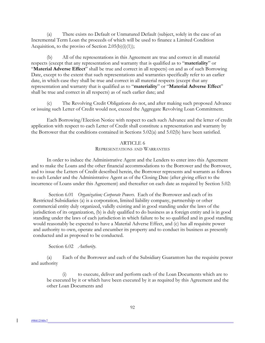 (a) There exists no Default or Unmatured Default (subject, solely in the case of an Incremental Term Loan the proceeds of which will be used to finance a Limited Condition Acquisition, to the proviso of Section 2.05(b)(i)(1)); (b) All of the representations in this Agreement are true and correct in all material respects (except that any representation and warranty that is qualified as to “materiality” or “Material Adverse Effect” shall be true and correct in all respects) on and as of such Borrowing Date, except to the extent that such representations and warranties specifically refer to an earlier date, in which case they shall be true and correct in all material respects (except that any representation and warranty that is qualified as to “materiality” or “Material Adverse Effect” shall be true and correct in all respects) as of such earlier date; and (c) The Revolving Credit Obligations do not, and after making such proposed Advance or issuing such Letter of Credit would not, exceed the Aggregate Revolving Loan Commitment. Each Borrowing/Election Notice with respect to each such Advance and the letter of credit application with respect to each Letter of Credit shall constitute a representation and warranty by the Borrower that the conditions contained in Sections 5.02(a) and 5.02(b) have been satisfied. ARTICLE 6 REPRESENTATIONS AND WARRANTIES In order to induce the Administrative Agent and the Lenders to enter into this Agreement and to make the Loans and the other financial accommodations to the Borrower and the Borrower, and to issue the Letters of Credit described herein, the Borrower represents and warrants as follows to each Lender and the Administrative Agent as of the Closing Date (after giving effect to the incurrence of Loans under this Agreement) and thereafter on each date as required by Section 5.02: Section 6.01 Organization; Corporate Powers. Each of the Borrower and each of its Restricted Subsidiaries (a) is a corporation, limited liability company, partnership or other commercial entity duly organized, validly existing and in good standing under the laws of the jurisdiction of its organization, (b) is duly qualified to do business as a foreign entity and is in good standing under the laws of each jurisdiction in which failure to be so qualified and in good standing would reasonably be expected to have a Material Adverse Effect, and (c) has all requisite power and authority to own, operate and encumber its property and to conduct its business as presently conducted and as proposed to be conducted. Section 6.02 Authority. (a) Each of the Borrower and each of the Subsidiary Guarantors has the requisite power and authority (i) to execute, deliver and perform each of the Loan Documents which are to be executed by it or which have been executed by it as required by this Agreement and the other Loan Documents and 92 #98412540v7