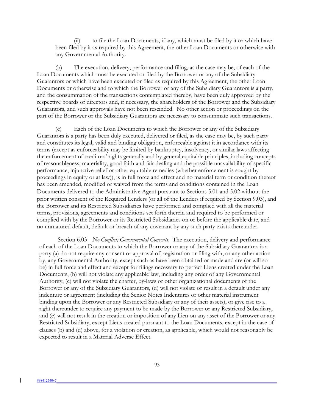(ii) to file the Loan Documents, if any, which must be filed by it or which have been filed by it as required by this Agreement, the other Loan Documents or otherwise with any Governmental Authority. (b) The execution, delivery, performance and filing, as the case may be, of each of the Loan Documents which must be executed or filed by the Borrower or any of the Subsidiary Guarantors or which have been executed or filed as required by this Agreement, the other Loan Documents or otherwise and to which the Borrower or any of the Subsidiary Guarantors is a party, and the consummation of the transactions contemplated thereby, have been duly approved by the respective boards of directors and, if necessary, the shareholders of the Borrower and the Subsidiary Guarantors, and such approvals have not been rescinded. No other action or proceedings on the part of the Borrower or the Subsidiary Guarantors are necessary to consummate such transactions. (c) Each of the Loan Documents to which the Borrower or any of the Subsidiary Guarantors is a party has been duly executed, delivered or filed, as the case may be, by such party and constitutes its legal, valid and binding obligation, enforceable against it in accordance with its terms (except as enforceability may be limited by bankruptcy, insolvency, or similar laws affecting the enforcement of creditors’ rights generally and by general equitable principles, including concepts of reasonableness, materiality, good faith and fair dealing and the possible unavailability of specific performance, injunctive relief or other equitable remedies (whether enforcement is sought by proceedings in equity or at law)), is in full force and effect and no material term or condition thereof has been amended, modified or waived from the terms and conditions contained in the Loan Documents delivered to the Administrative Agent pursuant to Sections 5.01 and 5.02 without the prior written consent of the Required Lenders (or all of the Lenders if required by Section 9.03), and the Borrower and its Restricted Subsidiaries have performed and complied with all the material terms, provisions, agreements and conditions set forth therein and required to be performed or complied with by the Borrower or its Restricted Subsidiaries on or before the applicable date, and no unmatured default, default or breach of any covenant by any such party exists thereunder. Section 6.03 No Conflict; Governmental Consents. The execution, delivery and performance of each of the Loan Documents to which the Borrower or any of the Subsidiary Guarantors is a party (a) do not require any consent or approval of, registration or filing with, or any other action by, any Governmental Authority, except such as have been obtained or made and are (or will so be) in full force and effect and except for filings necessary to perfect Liens created under the Loan Documents, (b) will not violate any applicable law, including any order of any Governmental Authority, (c) will not violate the charter, by-laws or other organizational documents of the Borrower or any of the Subsidiary Guarantors, (d) will not violate or result in a default under any indenture or agreement (including the Senior Notes Indentures or other material instrument binding upon the Borrower or any Restricted Subsidiary or any of their assets), or give rise to a right thereunder to require any payment to be made by the Borrower or any Restricted Subsidiary, and (e) will not result in the creation or imposition of any Lien on any asset of the Borrower or any Restricted Subsidiary, except Liens created pursuant to the Loan Documents, except in the case of clauses (b) and (d) above, for a violation or creation, as applicable, which would not reasonably be expected to result in a Material Adverse Effect. 93 #98412540v7