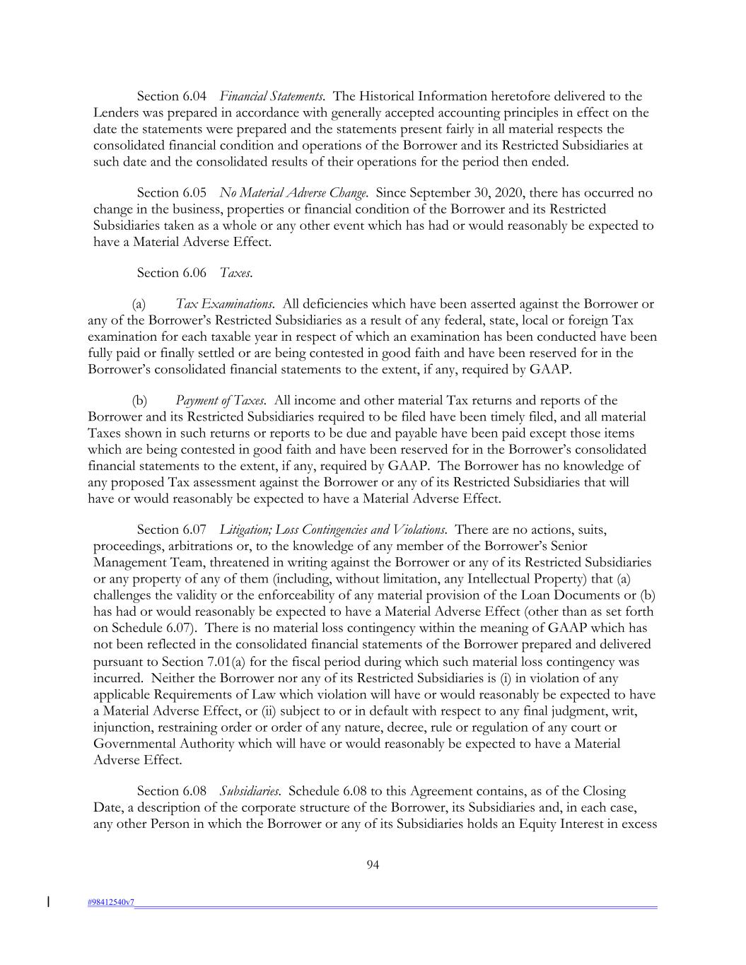 Section 6.04 Financial Statements. The Historical Information heretofore delivered to the Lenders was prepared in accordance with generally accepted accounting principles in effect on the date the statements were prepared and the statements present fairly in all material respects the consolidated financial condition and operations of the Borrower and its Restricted Subsidiaries at such date and the consolidated results of their operations for the period then ended. Section 6.05 No Material Adverse Change. Since September 30, 2020, there has occurred no change in the business, properties or financial condition of the Borrower and its Restricted Subsidiaries taken as a whole or any other event which has had or would reasonably be expected to have a Material Adverse Effect. Section 6.06 Taxes. (a) Tax Examinations. All deficiencies which have been asserted against the Borrower or any of the Borrower’s Restricted Subsidiaries as a result of any federal, state, local or foreign Tax examination for each taxable year in respect of which an examination has been conducted have been fully paid or finally settled or are being contested in good faith and have been reserved for in the Borrower’s consolidated financial statements to the extent, if any, required by GAAP. (b) Payment of Taxes. All income and other material Tax returns and reports of the Borrower and its Restricted Subsidiaries required to be filed have been timely filed, and all material Taxes shown in such returns or reports to be due and payable have been paid except those items which are being contested in good faith and have been reserved for in the Borrower’s consolidated financial statements to the extent, if any, required by GAAP. The Borrower has no knowledge of any proposed Tax assessment against the Borrower or any of its Restricted Subsidiaries that will have or would reasonably be expected to have a Material Adverse Effect. Section 6.07 Litigation; Loss Contingencies and Violations. There are no actions, suits, proceedings, arbitrations or, to the knowledge of any member of the Borrower’s Senior Management Team, threatened in writing against the Borrower or any of its Restricted Subsidiaries or any property of any of them (including, without limitation, any Intellectual Property) that (a) challenges the validity or the enforceability of any material provision of the Loan Documents or (b) has had or would reasonably be expected to have a Material Adverse Effect (other than as set forth on Schedule 6.07). There is no material loss contingency within the meaning of GAAP which has not been reflected in the consolidated financial statements of the Borrower prepared and delivered pursuant to Section 7.01(a) for the fiscal period during which such material loss contingency was incurred. Neither the Borrower nor any of its Restricted Subsidiaries is (i) in violation of any applicable Requirements of Law which violation will have or would reasonably be expected to have a Material Adverse Effect, or (ii) subject to or in default with respect to any final judgment, writ, injunction, restraining order or order of any nature, decree, rule or regulation of any court or Governmental Authority which will have or would reasonably be expected to have a Material Adverse Effect. Section 6.08 Subsidiaries. Schedule 6.08 to this Agreement contains, as of the Closing Date, a description of the corporate structure of the Borrower, its Subsidiaries and, in each case, any other Person in which the Borrower or any of its Subsidiaries holds an Equity Interest in excess 94 #98412540v7