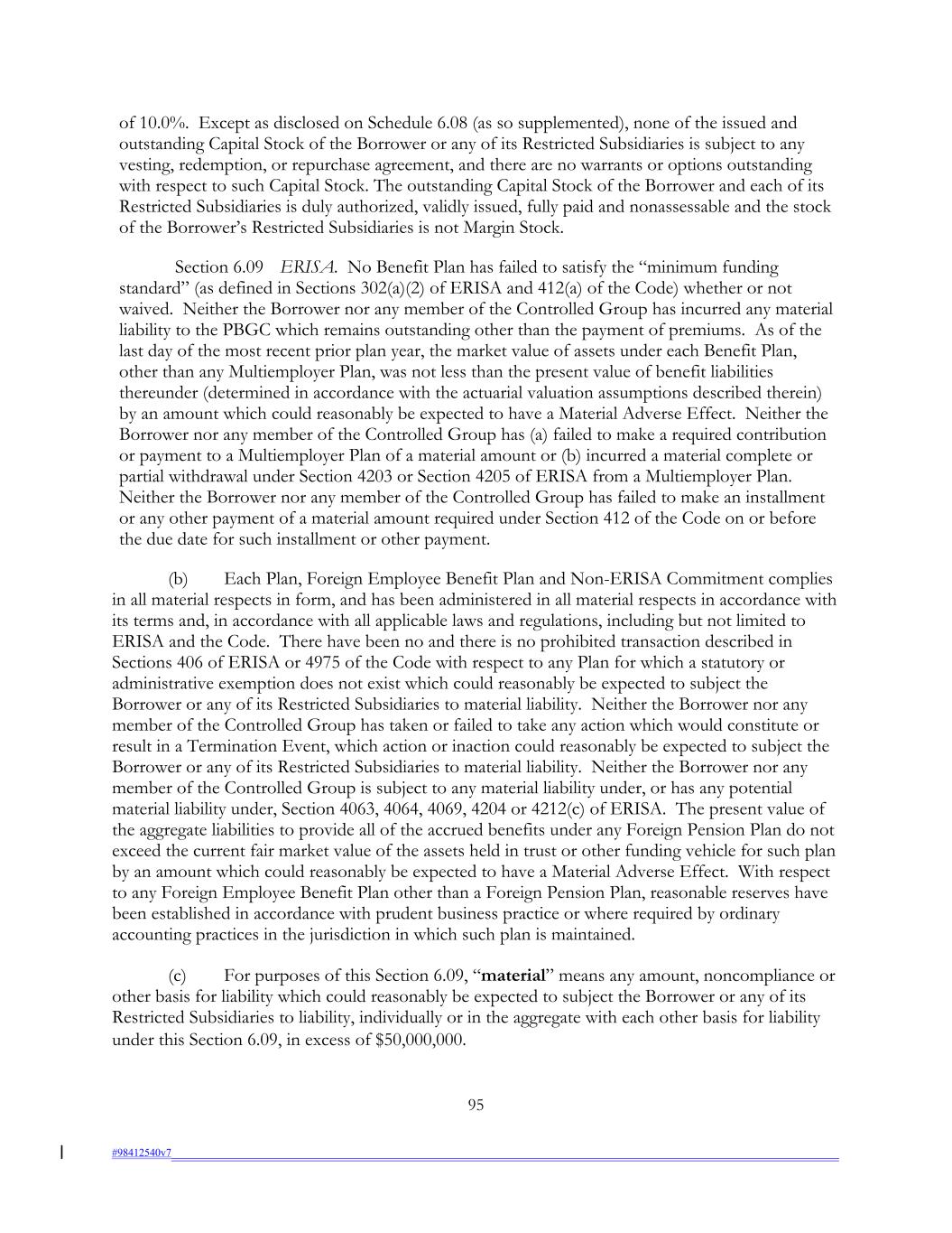 of 10.0%. Except as disclosed on Schedule 6.08 (as so supplemented), none of the issued and outstanding Capital Stock of the Borrower or any of its Restricted Subsidiaries is subject to any vesting, redemption, or repurchase agreement, and there are no warrants or options outstanding with respect to such Capital Stock. The outstanding Capital Stock of the Borrower and each of its Restricted Subsidiaries is duly authorized, validly issued, fully paid and nonassessable and the stock of the Borrower’s Restricted Subsidiaries is not Margin Stock. Section 6.09 ERISA. No Benefit Plan has failed to satisfy the “minimum funding standard” (as defined in Sections 302(a)(2) of ERISA and 412(a) of the Code) whether or not waived. Neither the Borrower nor any member of the Controlled Group has incurred any material liability to the PBGC which remains outstanding other than the payment of premiums. As of the last day of the most recent prior plan year, the market value of assets under each Benefit Plan, other than any Multiemployer Plan, was not less than the present value of benefit liabilities thereunder (determined in accordance with the actuarial valuation assumptions described therein) by an amount which could reasonably be expected to have a Material Adverse Effect. Neither the Borrower nor any member of the Controlled Group has (a) failed to make a required contribution or payment to a Multiemployer Plan of a material amount or (b) incurred a material complete or partial withdrawal under Section 4203 or Section 4205 of ERISA from a Multiemployer Plan. Neither the Borrower nor any member of the Controlled Group has failed to make an installment or any other payment of a material amount required under Section 412 of the Code on or before the due date for such installment or other payment. (b) Each Plan, Foreign Employee Benefit Plan and Non-ERISA Commitment complies in all material respects in form, and has been administered in all material respects in accordance with its terms and, in accordance with all applicable laws and regulations, including but not limited to ERISA and the Code. There have been no and there is no prohibited transaction described in Sections 406 of ERISA or 4975 of the Code with respect to any Plan for which a statutory or administrative exemption does not exist which could reasonably be expected to subject the Borrower or any of its Restricted Subsidiaries to material liability. Neither the Borrower nor any member of the Controlled Group has taken or failed to take any action which would constitute or result in a Termination Event, which action or inaction could reasonably be expected to subject the Borrower or any of its Restricted Subsidiaries to material liability. Neither the Borrower nor any member of the Controlled Group is subject to any material liability under, or has any potential material liability under, Section 4063, 4064, 4069, 4204 or 4212(c) of ERISA. The present value of the aggregate liabilities to provide all of the accrued benefits under any Foreign Pension Plan do not exceed the current fair market value of the assets held in trust or other funding vehicle for such plan by an amount which could reasonably be expected to have a Material Adverse Effect. With respect to any Foreign Employee Benefit Plan other than a Foreign Pension Plan, reasonable reserves have been established in accordance with prudent business practice or where required by ordinary accounting practices in the jurisdiction in which such plan is maintained. (c) For purposes of this Section 6.09, “material” means any amount, noncompliance or other basis for liability which could reasonably be expected to subject the Borrower or any of its Restricted Subsidiaries to liability, individually or in the aggregate with each other basis for liability under this Section 6.09, in excess of $50,000,000. 95 #98412540v7