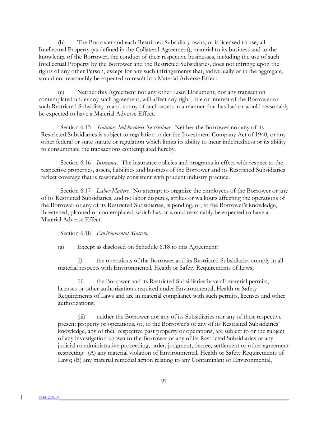 (b) The Borrower and each Restricted Subsidiary owns, or is licensed to use, all Intellectual Property (as defined in the Collateral Agreement), material to its business and to the knowledge of the Borrower, the conduct of their respective businesses, including the use of such Intellectual Property by the Borrower and the Restricted Subsidiaries, does not infringe upon the rights of any other Person, except for any such infringements that, individually or in the aggregate, would not reasonably be expected to result in a Material Adverse Effect. (c) Neither this Agreement nor any other Loan Document, nor any transaction contemplated under any such agreement, will affect any right, title or interest of the Borrower or such Restricted Subsidiary in and to any of such assets in a manner that has had or would reasonably be expected to have a Material Adverse Effect. Section 6.15 Statutory Indebtedness Restrictions. Neither the Borrower nor any of its Restricted Subsidiaries is subject to regulation under the Investment Company Act of 1940, or any other federal or state statute or regulation which limits its ability to incur indebtedness or its ability to consummate the transactions contemplated hereby. Section 6.16 Insurance. The insurance policies and programs in effect with respect to the respective properties, assets, liabilities and business of the Borrower and its Restricted Subsidiaries reflect coverage that is reasonably consistent with prudent industry practice. Section 6.17 Labor Matters. No attempt to organize the employees of the Borrower or any of its Restricted Subsidiaries, and no labor disputes, strikes or walkouts affecting the operations of the Borrower or any of its Restricted Subsidiaries, is pending, or, to the Borrower’s knowledge, threatened, planned or contemplated, which has or would reasonably be expected to have a Material Adverse Effect. Section 6.18 Environmental Matters. (a) Except as disclosed on Schedule 6.18 to this Agreement: (i) the operations of the Borrower and its Restricted Subsidiaries comply in all material respects with Environmental, Health or Safety Requirements of Laws; (ii) the Borrower and its Restricted Subsidiaries have all material permits, licenses or other authorizations required under Environmental, Health or Safety Requirements of Laws and are in material compliance with such permits, licenses and other authorizations; (iii) neither the Borrower nor any of its Subsidiaries nor any of their respective present property or operations, or, to the Borrower’s or any of its Restricted Subsidiaries’ knowledge, any of their respective past property or operations, are subject to or the subject of any investigation known to the Borrower or any of its Restricted Subsidiaries or any judicial or administrative proceeding, order, judgment, decree, settlement or other agreement respecting: (A) any material violation of Environmental, Health or Safety Requirements of Laws; (B) any material remedial action relating to any Contaminant or Environmental, 97 #98412540v7
