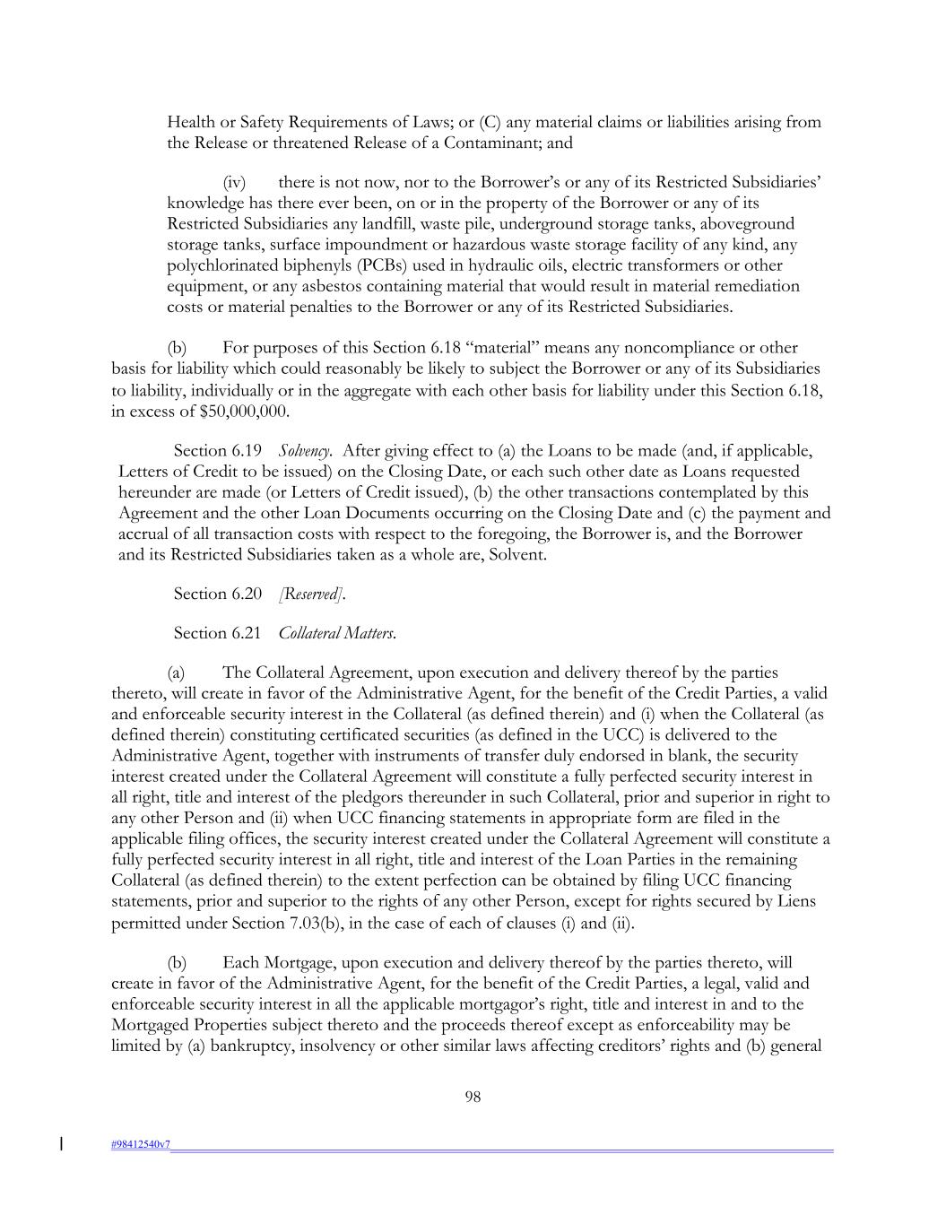 Health or Safety Requirements of Laws; or (C) any material claims or liabilities arising from the Release or threatened Release of a Contaminant; and (iv) there is not now, nor to the Borrower’s or any of its Restricted Subsidiaries’ knowledge has there ever been, on or in the property of the Borrower or any of its Restricted Subsidiaries any landfill, waste pile, underground storage tanks, aboveground storage tanks, surface impoundment or hazardous waste storage facility of any kind, any polychlorinated biphenyls (PCBs) used in hydraulic oils, electric transformers or other equipment, or any asbestos containing material that would result in material remediation costs or material penalties to the Borrower or any of its Restricted Subsidiaries. (b) For purposes of this Section 6.18 “material” means any noncompliance or other basis for liability which could reasonably be likely to subject the Borrower or any of its Subsidiaries to liability, individually or in the aggregate with each other basis for liability under this Section 6.18, in excess of $50,000,000. Section 6.19 Solvency. After giving effect to (a) the Loans to be made (and, if applicable, Letters of Credit to be issued) on the Closing Date, or each such other date as Loans requested hereunder are made (or Letters of Credit issued), (b) the other transactions contemplated by this Agreement and the other Loan Documents occurring on the Closing Date and (c) the payment and accrual of all transaction costs with respect to the foregoing, the Borrower is, and the Borrower and its Restricted Subsidiaries taken as a whole are, Solvent. Section 6.20 [Reserved]. Section 6.21 Collateral Matters. (a) The Collateral Agreement, upon execution and delivery thereof by the parties thereto, will create in favor of the Administrative Agent, for the benefit of the Credit Parties, a valid and enforceable security interest in the Collateral (as defined therein) and (i) when the Collateral (as defined therein) constituting certificated securities (as defined in the UCC) is delivered to the Administrative Agent, together with instruments of transfer duly endorsed in blank, the security interest created under the Collateral Agreement will constitute a fully perfected security interest in all right, title and interest of the pledgors thereunder in such Collateral, prior and superior in right to any other Person and (ii) when UCC financing statements in appropriate form are filed in the applicable filing offices, the security interest created under the Collateral Agreement will constitute a fully perfected security interest in all right, title and interest of the Loan Parties in the remaining Collateral (as defined therein) to the extent perfection can be obtained by filing UCC financing statements, prior and superior to the rights of any other Person, except for rights secured by Liens permitted under Section 7.03(b), in the case of each of clauses (i) and (ii). (b) Each Mortgage, upon execution and delivery thereof by the parties thereto, will create in favor of the Administrative Agent, for the benefit of the Credit Parties, a legal, valid and enforceable security interest in all the applicable mortgagor’s right, title and interest in and to the Mortgaged Properties subject thereto and the proceeds thereof except as enforceability may be limited by (a) bankruptcy, insolvency or other similar laws affecting creditors’ rights and (b) general 98 #98412540v7