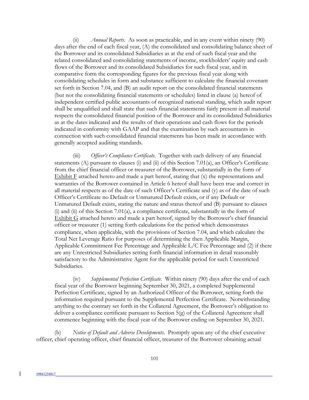 (ii) Annual Reports. As soon as practicable, and in any event within ninety (90) days after the end of each fiscal year, (A) the consolidated and consolidating balance sheet of the Borrower and its consolidated Subsidiaries as at the end of such fiscal year and the related consolidated and consolidating statements of income, stockholders’ equity and cash flows of the Borrower and its consolidated Subsidiaries for such fiscal year, and in comparative form the corresponding figures for the previous fiscal year along with consolidating schedules in form and substance sufficient to calculate the financial covenant set forth in Section 7.04, and (B) an audit report on the consolidated financial statements (but not the consolidating financial statements or schedules) listed in clause (a) hereof of independent certified public accountants of recognized national standing, which audit report shall be unqualified and shall state that such financial statements fairly present in all material respects the consolidated financial position of the Borrower and its consolidated Subsidiaries as at the dates indicated and the results of their operations and cash flows for the periods indicated in conformity with GAAP and that the examination by such accountants in connection with such consolidated financial statements has been made in accordance with generally accepted auditing standards. (iii) Officer’s Compliance Certificate. Together with each delivery of any financial statements (A) pursuant to clauses (i) and (ii) of this Section 7.01(a), an Officer’s Certificate from the chief financial officer or treasurer of the Borrower, substantially in the form of Exhibit F attached hereto and made a part hereof, stating that (x) the representations and warranties of the Borrower contained in Article 6 hereof shall have been true and correct in all material respects as of the date of such Officer’s Certificate and (y) as of the date of such Officer’s Certificate no Default or Unmatured Default exists, or if any Default or Unmatured Default exists, stating the nature and status thereof and (B) pursuant to clauses (i) and (ii) of this Section 7.01(a), a compliance certificate, substantially in the form of Exhibit G attached hereto and made a part hereof, signed by the Borrower’s chief financial officer or treasurer (1) setting forth calculations for the period which demonstrates compliance, when applicable, with the provisions of Section 7.04, and which calculate the Total Net Leverage Ratio for purposes of determining the then Applicable Margin, Applicable Commitment Fee Percentage and Applicable L/C Fee Percentage and (2) if there are any Unrestricted Subsidiaries setting forth financial information in detail reasonably satisfactory to the Administrative Agent for the applicable period for such Unrestricted Subsidiaries. (iv) Supplemental Perfection Certificate. Within ninety (90) days after the end of each fiscal year of the Borrower beginning September 30, 2021, a completed Supplemental Perfection Certificate, signed by an Authorized Officer of the Borrower, setting forth the information required pursuant to the Supplemental Perfection Certificate. Notwithstanding anything to the contrary set forth in the Collateral Agreement, the Borrower’s obligation to deliver a compliance certificate pursuant to Section 5(g) of the Collateral Agreement shall commence beginning with the fiscal year of the Borrower ending on September 30, 2021. (b) Notice of Default and Adverse Developments. Promptly upon any of the chief executive officer, chief operating officer, chief financial officer, treasurer of the Borrower obtaining actual 101 #98412540v7