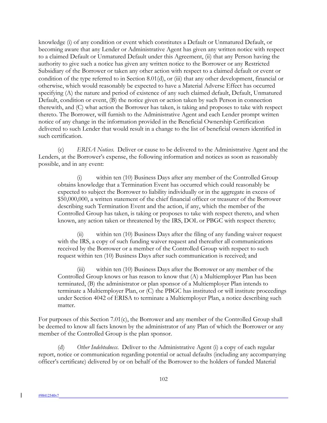 knowledge (i) of any condition or event which constitutes a Default or Unmatured Default, or becoming aware that any Lender or Administrative Agent has given any written notice with respect to a claimed Default or Unmatured Default under this Agreement, (ii) that any Person having the authority to give such a notice has given any written notice to the Borrower or any Restricted Subsidiary of the Borrower or taken any other action with respect to a claimed default or event or condition of the type referred to in Section 8.01(d), or (iii) that any other development, financial or otherwise, which would reasonably be expected to have a Material Adverse Effect has occurred specifying (A) the nature and period of existence of any such claimed default, Default, Unmatured Default, condition or event, (B) the notice given or action taken by such Person in connection therewith, and (C) what action the Borrower has taken, is taking and proposes to take with respect thereto. The Borrower, will furnish to the Administrative Agent and each Lender prompt written notice of any change in the information provided in the Beneficial Ownership Certification delivered to such Lender that would result in a change to the list of beneficial owners identified in such certification. (c) ERISA Notices. Deliver or cause to be delivered to the Administrative Agent and the Lenders, at the Borrower’s expense, the following information and notices as soon as reasonably possible, and in any event: (i) within ten (10) Business Days after any member of the Controlled Group obtains knowledge that a Termination Event has occurred which could reasonably be expected to subject the Borrower to liability individually or in the aggregate in excess of $50,000,000, a written statement of the chief financial officer or treasurer of the Borrower describing such Termination Event and the action, if any, which the member of the Controlled Group has taken, is taking or proposes to take with respect thereto, and when known, any action taken or threatened by the IRS, DOL or PBGC with respect thereto; (ii) within ten (10) Business Days after the filing of any funding waiver request with the IRS, a copy of such funding waiver request and thereafter all communications received by the Borrower or a member of the Controlled Group with respect to such request within ten (10) Business Days after such communication is received; and (iii) within ten (10) Business Days after the Borrower or any member of the Controlled Group knows or has reason to know that (A) a Multiemployer Plan has been terminated, (B) the administrator or plan sponsor of a Multiemployer Plan intends to terminate a Multiemployer Plan, or (C) the PBGC has instituted or will institute proceedings under Section 4042 of ERISA to terminate a Multiemployer Plan, a notice describing such matter. For purposes of this Section 7.01(c), the Borrower and any member of the Controlled Group shall be deemed to know all facts known by the administrator of any Plan of which the Borrower or any member of the Controlled Group is the plan sponsor. (d) Other Indebtedness. Deliver to the Administrative Agent (i) a copy of each regular report, notice or communication regarding potential or actual defaults (including any accompanying officer’s certificate) delivered by or on behalf of the Borrower to the holders of funded Material 102 #98412540v7