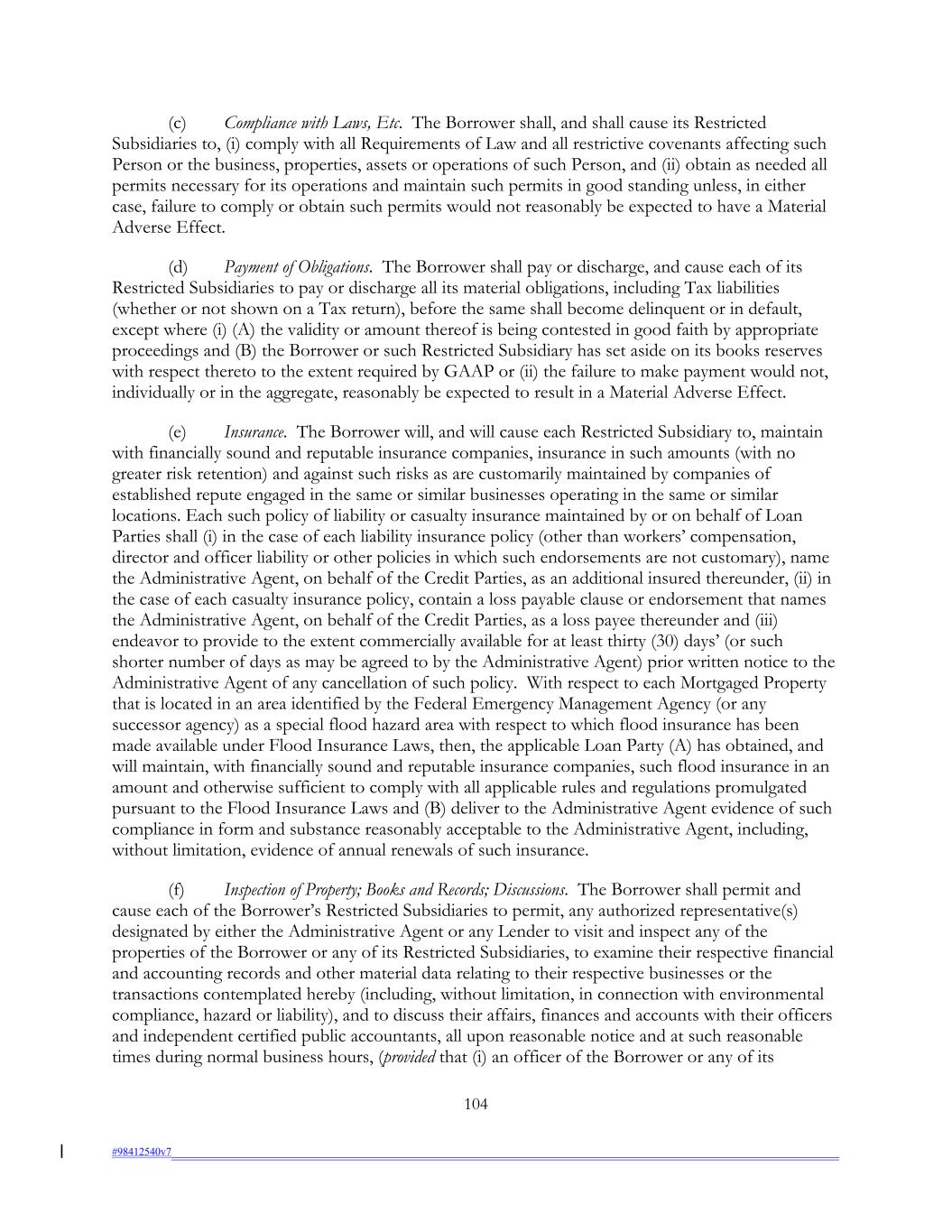 (c) Compliance with Laws, Etc. The Borrower shall, and shall cause its Restricted Subsidiaries to, (i) comply with all Requirements of Law and all restrictive covenants affecting such Person or the business, properties, assets or operations of such Person, and (ii) obtain as needed all permits necessary for its operations and maintain such permits in good standing unless, in either case, failure to comply or obtain such permits would not reasonably be expected to have a Material Adverse Effect. (d) Payment of Obligations. The Borrower shall pay or discharge, and cause each of its Restricted Subsidiaries to pay or discharge all its material obligations, including Tax liabilities (whether or not shown on a Tax return), before the same shall become delinquent or in default, except where (i) (A) the validity or amount thereof is being contested in good faith by appropriate proceedings and (B) the Borrower or such Restricted Subsidiary has set aside on its books reserves with respect thereto to the extent required by GAAP or (ii) the failure to make payment would not, individually or in the aggregate, reasonably be expected to result in a Material Adverse Effect. (e) Insurance. The Borrower will, and will cause each Restricted Subsidiary to, maintain with financially sound and reputable insurance companies, insurance in such amounts (with no greater risk retention) and against such risks as are customarily maintained by companies of established repute engaged in the same or similar businesses operating in the same or similar locations. Each such policy of liability or casualty insurance maintained by or on behalf of Loan Parties shall (i) in the case of each liability insurance policy (other than workers’ compensation, director and officer liability or other policies in which such endorsements are not customary), name the Administrative Agent, on behalf of the Credit Parties, as an additional insured thereunder, (ii) in the case of each casualty insurance policy, contain a loss payable clause or endorsement that names the Administrative Agent, on behalf of the Credit Parties, as a loss payee thereunder and (iii) endeavor to provide to the extent commercially available for at least thirty (30) days’ (or such shorter number of days as may be agreed to by the Administrative Agent) prior written notice to the Administrative Agent of any cancellation of such policy. With respect to each Mortgaged Property that is located in an area identified by the Federal Emergency Management Agency (or any successor agency) as a special flood hazard area with respect to which flood insurance has been made available under Flood Insurance Laws, then, the applicable Loan Party (A) has obtained, and will maintain, with financially sound and reputable insurance companies, such flood insurance in an amount and otherwise sufficient to comply with all applicable rules and regulations promulgated pursuant to the Flood Insurance Laws and (B) deliver to the Administrative Agent evidence of such compliance in form and substance reasonably acceptable to the Administrative Agent, including, without limitation, evidence of annual renewals of such insurance. (f) Inspection of Property; Books and Records; Discussions. The Borrower shall permit and cause each of the Borrower’s Restricted Subsidiaries to permit, any authorized representative(s) designated by either the Administrative Agent or any Lender to visit and inspect any of the properties of the Borrower or any of its Restricted Subsidiaries, to examine their respective financial and accounting records and other material data relating to their respective businesses or the transactions contemplated hereby (including, without limitation, in connection with environmental compliance, hazard or liability), and to discuss their affairs, finances and accounts with their officers and independent certified public accountants, all upon reasonable notice and at such reasonable times during normal business hours, (provided that (i) an officer of the Borrower or any of its 104 #98412540v7