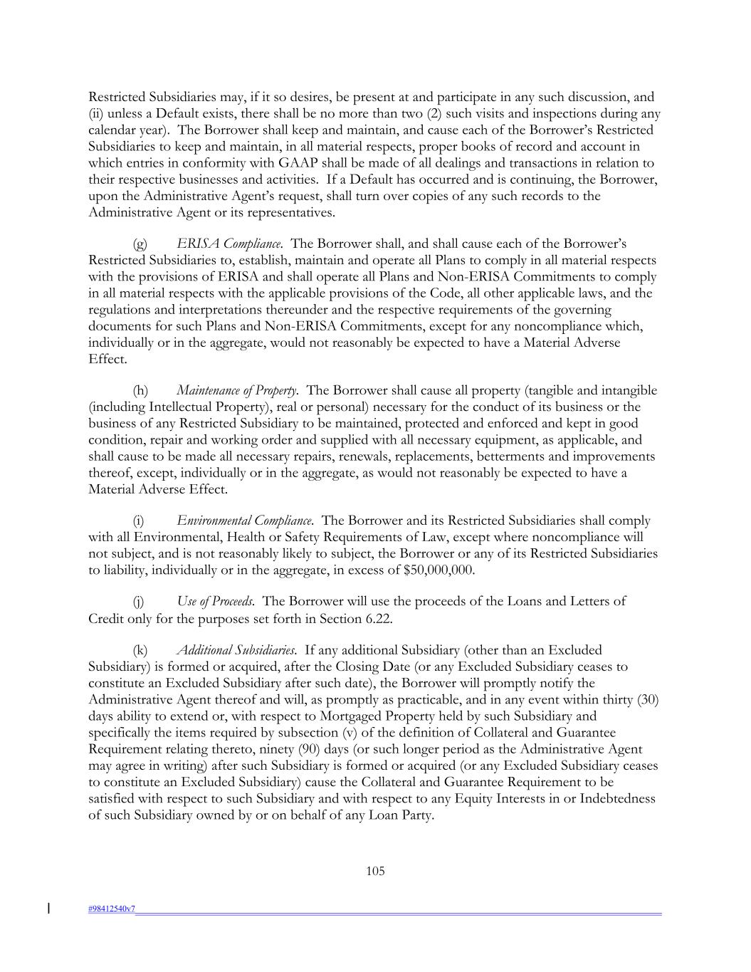 Restricted Subsidiaries may, if it so desires, be present at and participate in any such discussion, and (ii) unless a Default exists, there shall be no more than two (2) such visits and inspections during any calendar year). The Borrower shall keep and maintain, and cause each of the Borrower’s Restricted Subsidiaries to keep and maintain, in all material respects, proper books of record and account in which entries in conformity with GAAP shall be made of all dealings and transactions in relation to their respective businesses and activities. If a Default has occurred and is continuing, the Borrower, upon the Administrative Agent’s request, shall turn over copies of any such records to the Administrative Agent or its representatives. (g) ERISA Compliance. The Borrower shall, and shall cause each of the Borrower’s Restricted Subsidiaries to, establish, maintain and operate all Plans to comply in all material respects with the provisions of ERISA and shall operate all Plans and Non-ERISA Commitments to comply in all material respects with the applicable provisions of the Code, all other applicable laws, and the regulations and interpretations thereunder and the respective requirements of the governing documents for such Plans and Non-ERISA Commitments, except for any noncompliance which, individually or in the aggregate, would not reasonably be expected to have a Material Adverse Effect. (h) Maintenance of Property. The Borrower shall cause all property (tangible and intangible (including Intellectual Property), real or personal) necessary for the conduct of its business or the business of any Restricted Subsidiary to be maintained, protected and enforced and kept in good condition, repair and working order and supplied with all necessary equipment, as applicable, and shall cause to be made all necessary repairs, renewals, replacements, betterments and improvements thereof, except, individually or in the aggregate, as would not reasonably be expected to have a Material Adverse Effect. (i) Environmental Compliance. The Borrower and its Restricted Subsidiaries shall comply with all Environmental, Health or Safety Requirements of Law, except where noncompliance will not subject, and is not reasonably likely to subject, the Borrower or any of its Restricted Subsidiaries to liability, individually or in the aggregate, in excess of $50,000,000. (j) Use of Proceeds. The Borrower will use the proceeds of the Loans and Letters of Credit only for the purposes set forth in Section 6.22. (k) Additional Subsidiaries. If any additional Subsidiary (other than an Excluded Subsidiary) is formed or acquired, after the Closing Date (or any Excluded Subsidiary ceases to constitute an Excluded Subsidiary after such date), the Borrower will promptly notify the Administrative Agent thereof and will, as promptly as practicable, and in any event within thirty (30) days ability to extend or, with respect to Mortgaged Property held by such Subsidiary and specifically the items required by subsection (v) of the definition of Collateral and Guarantee Requirement relating thereto, ninety (90) days (or such longer period as the Administrative Agent may agree in writing) after such Subsidiary is formed or acquired (or any Excluded Subsidiary ceases to constitute an Excluded Subsidiary) cause the Collateral and Guarantee Requirement to be satisfied with respect to such Subsidiary and with respect to any Equity Interests in or Indebtedness of such Subsidiary owned by or on behalf of any Loan Party. 105 #98412540v7