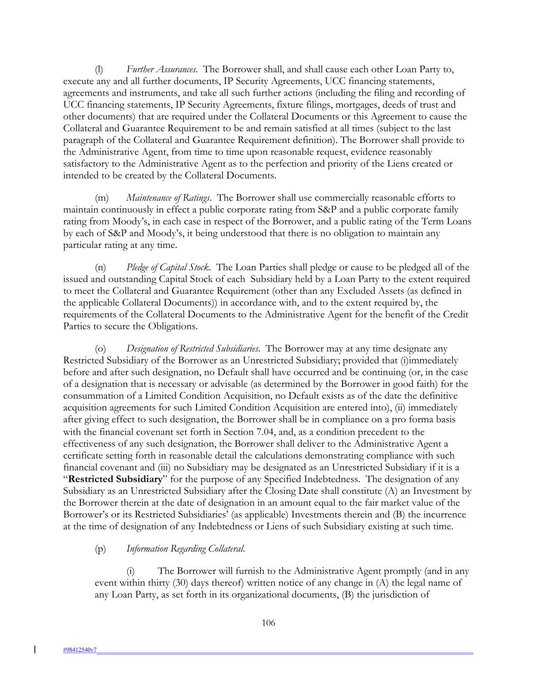 (l) Further Assurances. The Borrower shall, and shall cause each other Loan Party to, execute any and all further documents, IP Security Agreements, UCC financing statements, agreements and instruments, and take all such further actions (including the filing and recording of UCC financing statements, IP Security Agreements, fixture filings, mortgages, deeds of trust and other documents) that are required under the Collateral Documents or this Agreement to cause the Collateral and Guarantee Requirement to be and remain satisfied at all times (subject to the last paragraph of the Collateral and Guarantee Requirement definition). The Borrower shall provide to the Administrative Agent, from time to time upon reasonable request, evidence reasonably satisfactory to the Administrative Agent as to the perfection and priority of the Liens created or intended to be created by the Collateral Documents. (m) Maintenance of Ratings. The Borrower shall use commercially reasonable efforts to maintain continuously in effect a public corporate rating from S&P and a public corporate family rating from Moody’s, in each case in respect of the Borrower, and a public rating of the Term Loans by each of S&P and Moody’s, it being understood that there is no obligation to maintain any particular rating at any time. (n) Pledge of Capital Stock. The Loan Parties shall pledge or cause to be pledged all of the issued and outstanding Capital Stock of each Subsidiary held by a Loan Party to the extent required to meet the Collateral and Guarantee Requirement (other than any Excluded Assets (as defined in the applicable Collateral Documents)) in accordance with, and to the extent required by, the requirements of the Collateral Documents to the Administrative Agent for the benefit of the Credit Parties to secure the Obligations. (o) Designation of Restricted Subsidiaries. The Borrower may at any time designate any Restricted Subsidiary of the Borrower as an Unrestricted Subsidiary; provided that (i)immediately before and after such designation, no Default shall have occurred and be continuing (or, in the case of a designation that is necessary or advisable (as determined by the Borrower in good faith) for the consummation of a Limited Condition Acquisition, no Default exists as of the date the definitive acquisition agreements for such Limited Condition Acquisition are entered into), (ii) immediately after giving effect to such designation, the Borrower shall be in compliance on a pro forma basis with the financial covenant set forth in Section 7.04, and, as a condition precedent to the effectiveness of any such designation, the Borrower shall deliver to the Administrative Agent a certificate setting forth in reasonable detail the calculations demonstrating compliance with such financial covenant and (iii) no Subsidiary may be designated as an Unrestricted Subsidiary if it is a “Restricted Subsidiary” for the purpose of any Specified Indebtedness. The designation of any Subsidiary as an Unrestricted Subsidiary after the Closing Date shall constitute (A) an Investment by the Borrower therein at the date of designation in an amount equal to the fair market value of the Borrower’s or its Restricted Subsidiaries’ (as applicable) Investments therein and (B) the incurrence at the time of designation of any Indebtedness or Liens of such Subsidiary existing at such time. (p) Information Regarding Collateral. (i) The Borrower will furnish to the Administrative Agent promptly (and in any event within thirty (30) days thereof) written notice of any change in (A) the legal name of any Loan Party, as set forth in its organizational documents, (B) the jurisdiction of 106 #98412540v7