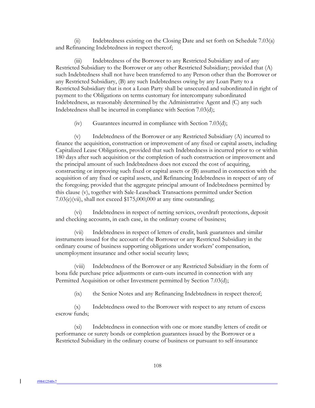(ii) Indebtedness existing on the Closing Date and set forth on Schedule 7.03(a) and Refinancing Indebtedness in respect thereof; (iii) Indebtedness of the Borrower to any Restricted Subsidiary and of any Restricted Subsidiary to the Borrower or any other Restricted Subsidiary; provided that (A) such Indebtedness shall not have been transferred to any Person other than the Borrower or any Restricted Subsidiary, (B) any such Indebtedness owing by any Loan Party to a Restricted Subsidiary that is not a Loan Party shall be unsecured and subordinated in right of payment to the Obligations on terms customary for intercompany subordinated Indebtedness, as reasonably determined by the Administrative Agent and (C) any such Indebtedness shall be incurred in compliance with Section 7.03(d); (iv) Guarantees incurred in compliance with Section 7.03(d); (v) Indebtedness of the Borrower or any Restricted Subsidiary (A) incurred to finance the acquisition, construction or improvement of any fixed or capital assets, including Capitalized Lease Obligations, provided that such Indebtedness is incurred prior to or within 180 days after such acquisition or the completion of such construction or improvement and the principal amount of such Indebtedness does not exceed the cost of acquiring, constructing or improving such fixed or capital assets or (B) assumed in connection with the acquisition of any fixed or capital assets, and Refinancing Indebtedness in respect of any of the foregoing; provided that the aggregate principal amount of Indebtedness permitted by this clause (v), together with Sale-Leaseback Transactions permitted under Section 7.03(e)(vii), shall not exceed $175,000,000 at any time outstanding; (vi) Indebtedness in respect of netting services, overdraft protections, deposit and checking accounts, in each case, in the ordinary course of business; (vii) Indebtedness in respect of letters of credit, bank guarantees and similar instruments issued for the account of the Borrower or any Restricted Subsidiary in the ordinary course of business supporting obligations under workers’ compensation, unemployment insurance and other social security laws; (viii) Indebtedness of the Borrower or any Restricted Subsidiary in the form of bona fide purchase price adjustments or earn-outs incurred in connection with any Permitted Acquisition or other Investment permitted by Section 7.03(d); (ix) the Senior Notes and any Refinancing Indebtedness in respect thereof; (x) Indebtedness owed to the Borrower with respect to any return of excess escrow funds; (xi) Indebtedness in connection with one or more standby letters of credit or performance or surety bonds or completion guarantees issued by the Borrower or a Restricted Subsidiary in the ordinary course of business or pursuant to self-insurance 108 #98412540v7