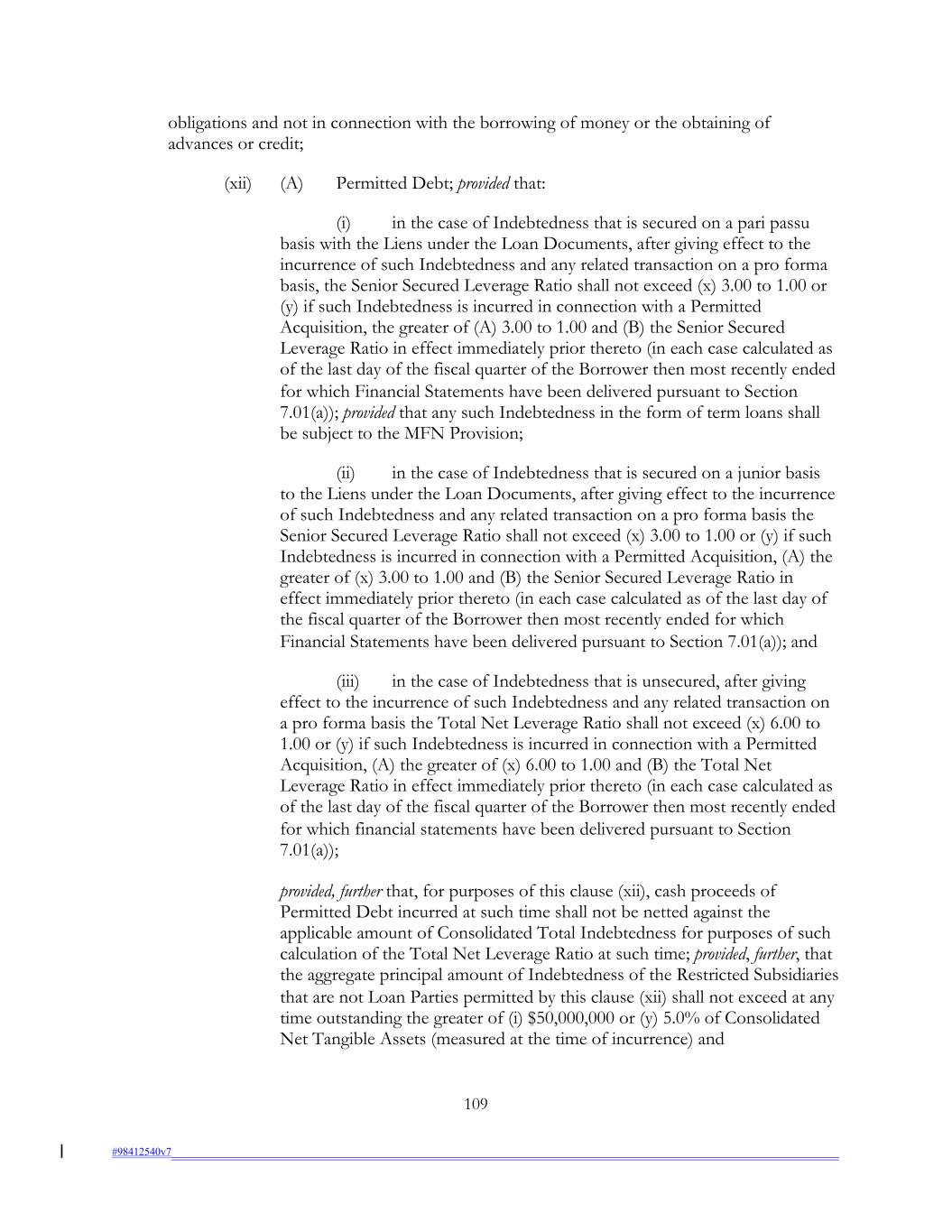 obligations and not in connection with the borrowing of money or the obtaining of advances or credit; (xii) (A) Permitted Debt; provided that: (i) in the case of Indebtedness that is secured on a pari passu basis with the Liens under the Loan Documents, after giving effect to the incurrence of such Indebtedness and any related transaction on a pro forma basis, the Senior Secured Leverage Ratio shall not exceed (x) 3.00 to 1.00 or (y) if such Indebtedness is incurred in connection with a Permitted Acquisition, the greater of (A) 3.00 to 1.00 and (B) the Senior Secured Leverage Ratio in effect immediately prior thereto (in each case calculated as of the last day of the fiscal quarter of the Borrower then most recently ended for which Financial Statements have been delivered pursuant to Section 7.01(a)); provided that any such Indebtedness in the form of term loans shall be subject to the MFN Provision; (ii) in the case of Indebtedness that is secured on a junior basis to the Liens under the Loan Documents, after giving effect to the incurrence of such Indebtedness and any related transaction on a pro forma basis the Senior Secured Leverage Ratio shall not exceed (x) 3.00 to 1.00 or (y) if such Indebtedness is incurred in connection with a Permitted Acquisition, (A) the greater of (x) 3.00 to 1.00 and (B) the Senior Secured Leverage Ratio in effect immediately prior thereto (in each case calculated as of the last day of the fiscal quarter of the Borrower then most recently ended for which Financial Statements have been delivered pursuant to Section 7.01(a)); and (iii) in the case of Indebtedness that is unsecured, after giving effect to the incurrence of such Indebtedness and any related transaction on a pro forma basis the Total Net Leverage Ratio shall not exceed (x) 6.00 to 1.00 or (y) if such Indebtedness is incurred in connection with a Permitted Acquisition, (A) the greater of (x) 6.00 to 1.00 and (B) the Total Net Leverage Ratio in effect immediately prior thereto (in each case calculated as of the last day of the fiscal quarter of the Borrower then most recently ended for which financial statements have been delivered pursuant to Section 7.01(a)); provided, further that, for purposes of this clause (xii), cash proceeds of Permitted Debt incurred at such time shall not be netted against the applicable amount of Consolidated Total Indebtedness for purposes of such calculation of the Total Net Leverage Ratio at such time; provided, further, that the aggregate principal amount of Indebtedness of the Restricted Subsidiaries that are not Loan Parties permitted by this clause (xii) shall not exceed at any time outstanding the greater of (i) $50,000,000 or (y) 5.0% of Consolidated Net Tangible Assets (measured at the time of incurrence) and 109 #98412540v7