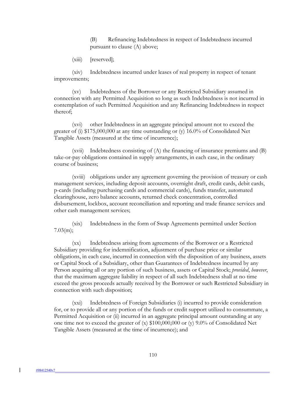 (B) Refinancing Indebtedness in respect of Indebtedness incurred pursuant to clause (A) above; (xiii) [reserved]; (xiv) Indebtedness incurred under leases of real property in respect of tenant improvements; (xv) Indebtedness of the Borrower or any Restricted Subsidiary assumed in connection with any Permitted Acquisition so long as such Indebtedness is not incurred in contemplation of such Permitted Acquisition and any Refinancing Indebtedness in respect thereof; (xvi) other Indebtedness in an aggregate principal amount not to exceed the greater of (i) $175,000,000 at any time outstanding or (y) 16.0% of Consolidated Net Tangible Assets (measured at the time of incurrence); (xvii) Indebtedness consisting of (A) the financing of insurance premiums and (B) take-or-pay obligations contained in supply arrangements, in each case, in the ordinary course of business; (xviii) obligations under any agreement governing the provision of treasury or cash management services, including deposit accounts, overnight draft, credit cards, debit cards, p-cards (including purchasing cards and commercial cards), funds transfer, automated clearinghouse, zero balance accounts, returned check concentration, controlled disbursement, lockbox, account reconciliation and reporting and trade finance services and other cash management services; (xix) Indebtedness in the form of Swap Agreements permitted under Section 7.03(m); (xx) Indebtedness arising from agreements of the Borrower or a Restricted Subsidiary providing for indemnification, adjustment of purchase price or similar obligations, in each case, incurred in connection with the disposition of any business, assets or Capital Stock of a Subsidiary, other than Guarantees of Indebtedness incurred by any Person acquiring all or any portion of such business, assets or Capital Stock; provided, however, that the maximum aggregate liability in respect of all such Indebtedness shall at no time exceed the gross proceeds actually received by the Borrower or such Restricted Subsidiary in connection with such disposition; (xxi) Indebtedness of Foreign Subsidiaries (i) incurred to provide consideration for, or to provide all or any portion of the funds or credit support utilized to consummate, a Permitted Acquisition or (ii) incurred in an aggregate principal amount outstanding at any one time not to exceed the greater of (x) $100,000,000 or (y) 9.0% of Consolidated Net Tangible Assets (measured at the time of incurrence); and 110 #98412540v7