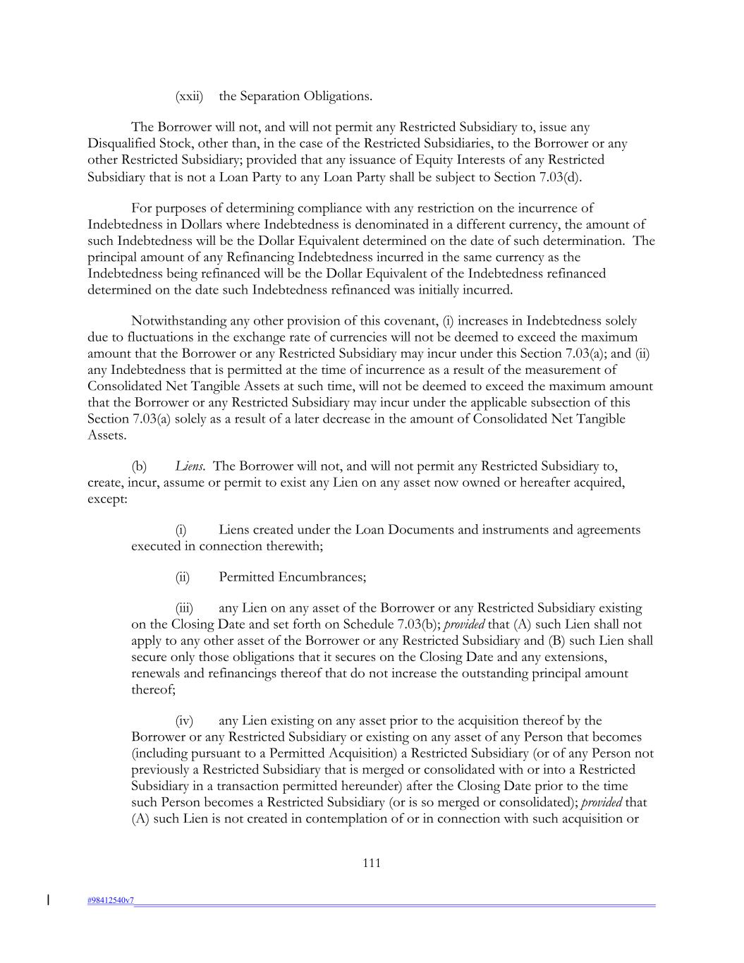 (xxii) the Separation Obligations. The Borrower will not, and will not permit any Restricted Subsidiary to, issue any Disqualified Stock, other than, in the case of the Restricted Subsidiaries, to the Borrower or any other Restricted Subsidiary; provided that any issuance of Equity Interests of any Restricted Subsidiary that is not a Loan Party to any Loan Party shall be subject to Section 7.03(d). For purposes of determining compliance with any restriction on the incurrence of Indebtedness in Dollars where Indebtedness is denominated in a different currency, the amount of such Indebtedness will be the Dollar Equivalent determined on the date of such determination. The principal amount of any Refinancing Indebtedness incurred in the same currency as the Indebtedness being refinanced will be the Dollar Equivalent of the Indebtedness refinanced determined on the date such Indebtedness refinanced was initially incurred. Notwithstanding any other provision of this covenant, (i) increases in Indebtedness solely due to fluctuations in the exchange rate of currencies will not be deemed to exceed the maximum amount that the Borrower or any Restricted Subsidiary may incur under this Section 7.03(a); and (ii) any Indebtedness that is permitted at the time of incurrence as a result of the measurement of Consolidated Net Tangible Assets at such time, will not be deemed to exceed the maximum amount that the Borrower or any Restricted Subsidiary may incur under the applicable subsection of this Section 7.03(a) solely as a result of a later decrease in the amount of Consolidated Net Tangible Assets. (b) Liens. The Borrower will not, and will not permit any Restricted Subsidiary to, create, incur, assume or permit to exist any Lien on any asset now owned or hereafter acquired, except: (i) Liens created under the Loan Documents and instruments and agreements executed in connection therewith; (ii) Permitted Encumbrances; (iii) any Lien on any asset of the Borrower or any Restricted Subsidiary existing on the Closing Date and set forth on Schedule 7.03(b); provided that (A) such Lien shall not apply to any other asset of the Borrower or any Restricted Subsidiary and (B) such Lien shall secure only those obligations that it secures on the Closing Date and any extensions, renewals and refinancings thereof that do not increase the outstanding principal amount thereof; (iv) any Lien existing on any asset prior to the acquisition thereof by the Borrower or any Restricted Subsidiary or existing on any asset of any Person that becomes (including pursuant to a Permitted Acquisition) a Restricted Subsidiary (or of any Person not previously a Restricted Subsidiary that is merged or consolidated with or into a Restricted Subsidiary in a transaction permitted hereunder) after the Closing Date prior to the time such Person becomes a Restricted Subsidiary (or is so merged or consolidated); provided that (A) such Lien is not created in contemplation of or in connection with such acquisition or 111 #98412540v7
