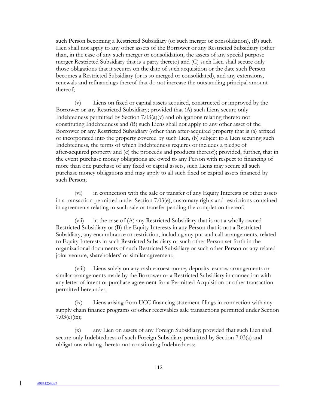 such Person becoming a Restricted Subsidiary (or such merger or consolidation), (B) such Lien shall not apply to any other assets of the Borrower or any Restricted Subsidiary (other than, in the case of any such merger or consolidation, the assets of any special purpose merger Restricted Subsidiary that is a party thereto) and (C) such Lien shall secure only those obligations that it secures on the date of such acquisition or the date such Person becomes a Restricted Subsidiary (or is so merged or consolidated), and any extensions, renewals and refinancings thereof that do not increase the outstanding principal amount thereof; (v) Liens on fixed or capital assets acquired, constructed or improved by the Borrower or any Restricted Subsidiary; provided that (A) such Liens secure only Indebtedness permitted by Section 7.03(a)(v) and obligations relating thereto not constituting Indebtedness and (B) such Liens shall not apply to any other asset of the Borrower or any Restricted Subsidiary (other than after-acquired property that is (a) affixed or incorporated into the property covered by such Lien, (b) subject to a Lien securing such Indebtedness, the terms of which Indebtedness requires or includes a pledge of after-acquired property and (c) the proceeds and products thereof); provided, further, that in the event purchase money obligations are owed to any Person with respect to financing of more than one purchase of any fixed or capital assets, such Liens may secure all such purchase money obligations and may apply to all such fixed or capital assets financed by such Person; (vi) in connection with the sale or transfer of any Equity Interests or other assets in a transaction permitted under Section 7.03(e), customary rights and restrictions contained in agreements relating to such sale or transfer pending the completion thereof; (vii) in the case of (A) any Restricted Subsidiary that is not a wholly owned Restricted Subsidiary or (B) the Equity Interests in any Person that is not a Restricted Subsidiary, any encumbrance or restriction, including any put and call arrangements, related to Equity Interests in such Restricted Subsidiary or such other Person set forth in the organizational documents of such Restricted Subsidiary or such other Person or any related joint venture, shareholders’ or similar agreement; (viii) Liens solely on any cash earnest money deposits, escrow arrangements or similar arrangements made by the Borrower or a Restricted Subsidiary in connection with any letter of intent or purchase agreement for a Permitted Acquisition or other transaction permitted hereunder; (ix) Liens arising from UCC financing statement filings in connection with any supply chain finance programs or other receivables sale transactions permitted under Section 7.03(e)(ix); (x) any Lien on assets of any Foreign Subsidiary; provided that such Lien shall secure only Indebtedness of such Foreign Subsidiary permitted by Section 7.03(a) and obligations relating thereto not constituting Indebtedness; 112 #98412540v7
