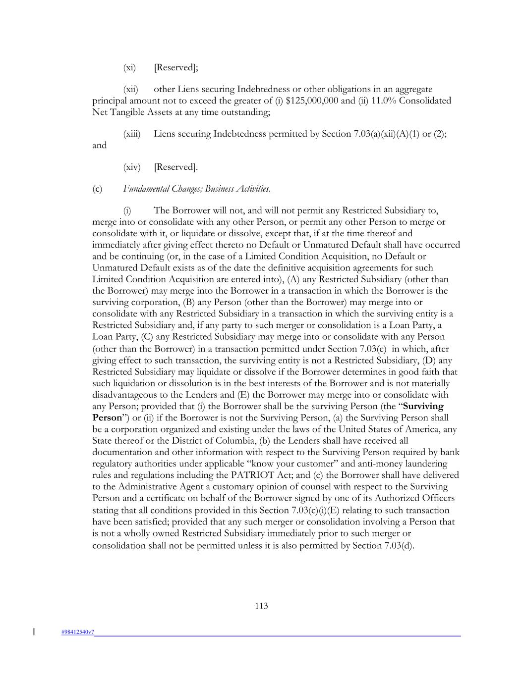 (xi) [Reserved]; (xii) other Liens securing Indebtedness or other obligations in an aggregate principal amount not to exceed the greater of (i) $125,000,000 and (ii) 11.0% Consolidated Net Tangible Assets at any time outstanding; (xiii) Liens securing Indebtedness permitted by Section 7.03(a)(xii)(A)(1) or (2); and (xiv) [Reserved]. (c) Fundamental Changes; Business Activities. (i) The Borrower will not, and will not permit any Restricted Subsidiary to, merge into or consolidate with any other Person, or permit any other Person to merge or consolidate with it, or liquidate or dissolve, except that, if at the time thereof and immediately after giving effect thereto no Default or Unmatured Default shall have occurred and be continuing (or, in the case of a Limited Condition Acquisition, no Default or Unmatured Default exists as of the date the definitive acquisition agreements for such Limited Condition Acquisition are entered into), (A) any Restricted Subsidiary (other than the Borrower) may merge into the Borrower in a transaction in which the Borrower is the surviving corporation, (B) any Person (other than the Borrower) may merge into or consolidate with any Restricted Subsidiary in a transaction in which the surviving entity is a Restricted Subsidiary and, if any party to such merger or consolidation is a Loan Party, a Loan Party, (C) any Restricted Subsidiary may merge into or consolidate with any Person (other than the Borrower) in a transaction permitted under Section 7.03(e) in which, after giving effect to such transaction, the surviving entity is not a Restricted Subsidiary, (D) any Restricted Subsidiary may liquidate or dissolve if the Borrower determines in good faith that such liquidation or dissolution is in the best interests of the Borrower and is not materially disadvantageous to the Lenders and (E) the Borrower may merge into or consolidate with any Person; provided that (i) the Borrower shall be the surviving Person (the “Surviving Person”) or (ii) if the Borrower is not the Surviving Person, (a) the Surviving Person shall be a corporation organized and existing under the laws of the United States of America, any State thereof or the District of Columbia, (b) the Lenders shall have received all documentation and other information with respect to the Surviving Person required by bank regulatory authorities under applicable “know your customer” and anti-money laundering rules and regulations including the PATRIOT Act; and (c) the Borrower shall have delivered to the Administrative Agent a customary opinion of counsel with respect to the Surviving Person and a certificate on behalf of the Borrower signed by one of its Authorized Officers stating that all conditions provided in this Section 7.03(c)(i)(E) relating to such transaction have been satisfied; provided that any such merger or consolidation involving a Person that is not a wholly owned Restricted Subsidiary immediately prior to such merger or consolidation shall not be permitted unless it is also permitted by Section 7.03(d). 113 #98412540v7