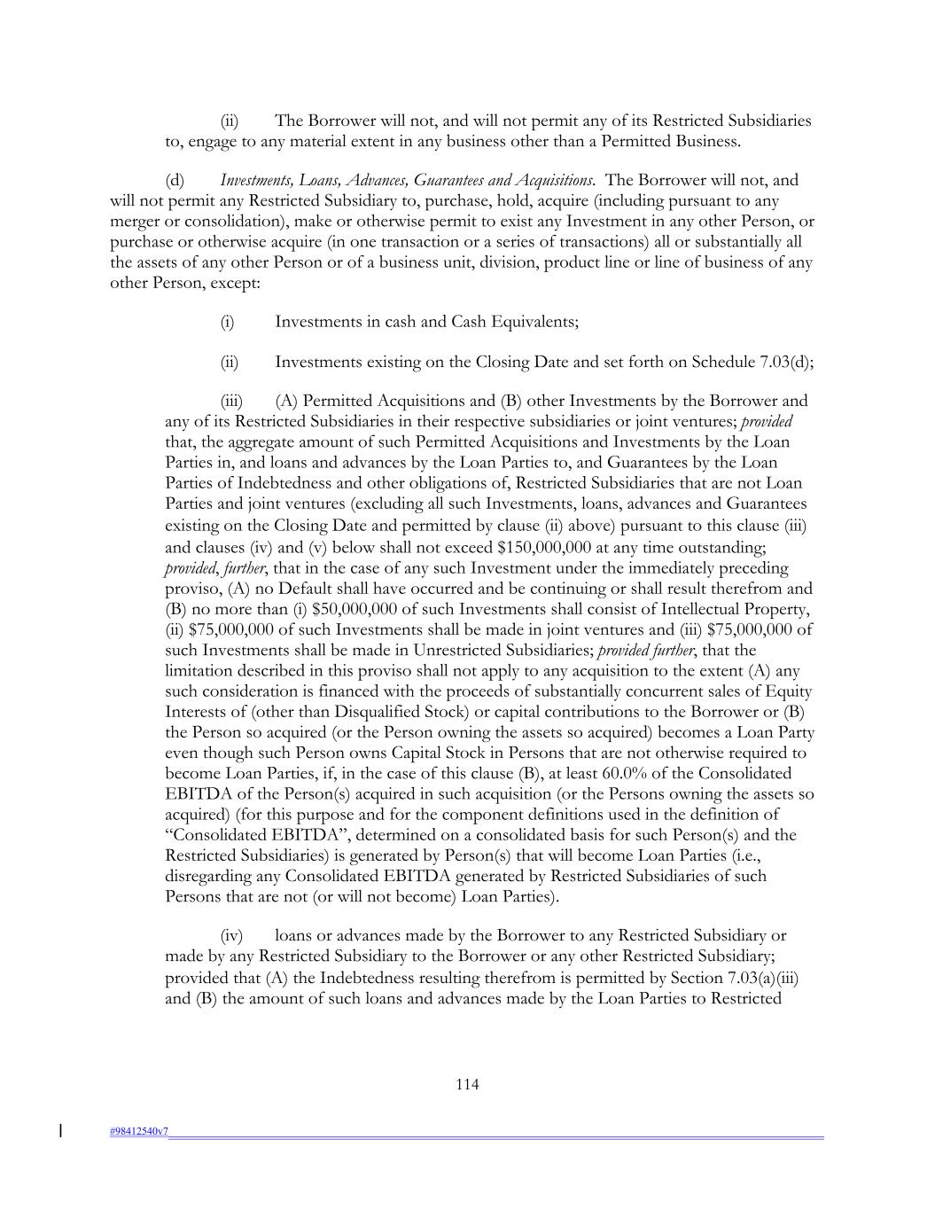 (ii) The Borrower will not, and will not permit any of its Restricted Subsidiaries to, engage to any material extent in any business other than a Permitted Business. (d) Investments, Loans, Advances, Guarantees and Acquisitions. The Borrower will not, and will not permit any Restricted Subsidiary to, purchase, hold, acquire (including pursuant to any merger or consolidation), make or otherwise permit to exist any Investment in any other Person, or purchase or otherwise acquire (in one transaction or a series of transactions) all or substantially all the assets of any other Person or of a business unit, division, product line or line of business of any other Person, except: (i) Investments in cash and Cash Equivalents; (ii) Investments existing on the Closing Date and set forth on Schedule 7.03(d); (iii) (A) Permitted Acquisitions and (B) other Investments by the Borrower and any of its Restricted Subsidiaries in their respective subsidiaries or joint ventures; provided that, the aggregate amount of such Permitted Acquisitions and Investments by the Loan Parties in, and loans and advances by the Loan Parties to, and Guarantees by the Loan Parties of Indebtedness and other obligations of, Restricted Subsidiaries that are not Loan Parties and joint ventures (excluding all such Investments, loans, advances and Guarantees existing on the Closing Date and permitted by clause (ii) above) pursuant to this clause (iii) and clauses (iv) and (v) below shall not exceed $150,000,000 at any time outstanding; provided, further, that in the case of any such Investment under the immediately preceding proviso, (A) no Default shall have occurred and be continuing or shall result therefrom and (B) no more than (i) $50,000,000 of such Investments shall consist of Intellectual Property, (ii) $75,000,000 of such Investments shall be made in joint ventures and (iii) $75,000,000 of such Investments shall be made in Unrestricted Subsidiaries; provided further, that the limitation described in this proviso shall not apply to any acquisition to the extent (A) any such consideration is financed with the proceeds of substantially concurrent sales of Equity Interests of (other than Disqualified Stock) or capital contributions to the Borrower or (B) the Person so acquired (or the Person owning the assets so acquired) becomes a Loan Party even though such Person owns Capital Stock in Persons that are not otherwise required to become Loan Parties, if, in the case of this clause (B), at least 60.0% of the Consolidated EBITDA of the Person(s) acquired in such acquisition (or the Persons owning the assets so acquired) (for this purpose and for the component definitions used in the definition of “Consolidated EBITDA”, determined on a consolidated basis for such Person(s) and the Restricted Subsidiaries) is generated by Person(s) that will become Loan Parties (i.e., disregarding any Consolidated EBITDA generated by Restricted Subsidiaries of such Persons that are not (or will not become) Loan Parties). (iv) loans or advances made by the Borrower to any Restricted Subsidiary or made by any Restricted Subsidiary to the Borrower or any other Restricted Subsidiary; provided that (A) the Indebtedness resulting therefrom is permitted by Section 7.03(a)(iii) and (B) the amount of such loans and advances made by the Loan Parties to Restricted 114 #98412540v7