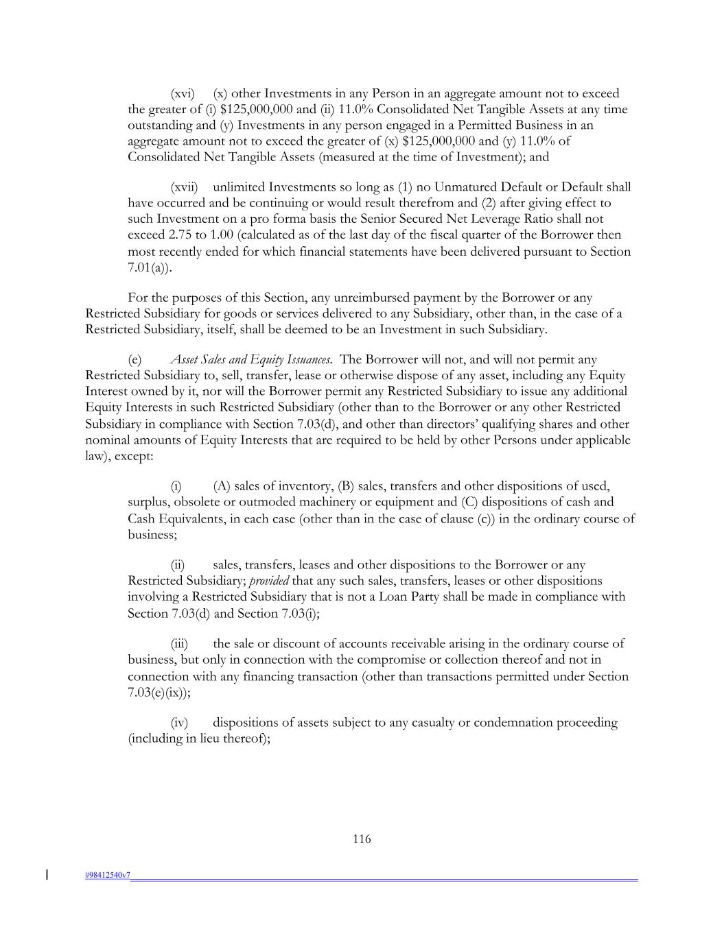 (xvi) (x) other Investments in any Person in an aggregate amount not to exceed the greater of (i) $125,000,000 and (ii) 11.0% Consolidated Net Tangible Assets at any time outstanding and (y) Investments in any person engaged in a Permitted Business in an aggregate amount not to exceed the greater of (x) $125,000,000 and (y) 11.0% of Consolidated Net Tangible Assets (measured at the time of Investment); and (xvii) unlimited Investments so long as (1) no Unmatured Default or Default shall have occurred and be continuing or would result therefrom and (2) after giving effect to such Investment on a pro forma basis the Senior Secured Net Leverage Ratio shall not exceed 2.75 to 1.00 (calculated as of the last day of the fiscal quarter of the Borrower then most recently ended for which financial statements have been delivered pursuant to Section 7.01(a)). For the purposes of this Section, any unreimbursed payment by the Borrower or any Restricted Subsidiary for goods or services delivered to any Subsidiary, other than, in the case of a Restricted Subsidiary, itself, shall be deemed to be an Investment in such Subsidiary. (e) Asset Sales and Equity Issuances. The Borrower will not, and will not permit any Restricted Subsidiary to, sell, transfer, lease or otherwise dispose of any asset, including any Equity Interest owned by it, nor will the Borrower permit any Restricted Subsidiary to issue any additional Equity Interests in such Restricted Subsidiary (other than to the Borrower or any other Restricted Subsidiary in compliance with Section 7.03(d), and other than directors’ qualifying shares and other nominal amounts of Equity Interests that are required to be held by other Persons under applicable law), except: (i) (A) sales of inventory, (B) sales, transfers and other dispositions of used, surplus, obsolete or outmoded machinery or equipment and (C) dispositions of cash and Cash Equivalents, in each case (other than in the case of clause (c)) in the ordinary course of business; (ii) sales, transfers, leases and other dispositions to the Borrower or any Restricted Subsidiary; provided that any such sales, transfers, leases or other dispositions involving a Restricted Subsidiary that is not a Loan Party shall be made in compliance with Section 7.03(d) and Section 7.03(i); (iii) the sale or discount of accounts receivable arising in the ordinary course of business, but only in connection with the compromise or collection thereof and not in connection with any financing transaction (other than transactions permitted under Section 7.03(e)(ix)); (iv) dispositions of assets subject to any casualty or condemnation proceeding (including in lieu thereof); 116 #98412540v7