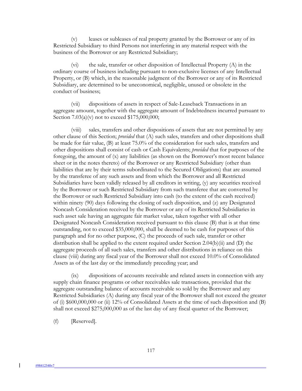 (v) leases or subleases of real property granted by the Borrower or any of its Restricted Subsidiary to third Persons not interfering in any material respect with the business of the Borrower or any Restricted Subsidiary; (vi) the sale, transfer or other disposition of Intellectual Property (A) in the ordinary course of business including pursuant to non-exclusive licenses of any Intellectual Property, or (B) which, in the reasonable judgment of the Borrower or any of its Restricted Subsidiary, are determined to be uneconomical, negligible, unused or obsolete in the conduct of business; (vii) dispositions of assets in respect of Sale-Leaseback Transactions in an aggregate amount, together with the aggregate amount of Indebtedness incurred pursuant to Section 7.03(a)(v) not to exceed $175,000,000; (viii) sales, transfers and other dispositions of assets that are not permitted by any other clause of this Section; provided that (A) such sales, transfers and other dispositions shall be made for fair value, (B) at least 75.0% of the consideration for such sales, transfers and other dispositions shall consist of cash or Cash Equivalents; provided that for purposes of the foregoing, the amount of (x) any liabilities (as shown on the Borrower’s most recent balance sheet or in the notes thereto) of the Borrower or any Restricted Subsidiary (other than liabilities that are by their terms subordinated to the Secured Obligations) that are assumed by the transferee of any such assets and from which the Borrower and all Restricted Subsidiaries have been validly released by all creditors in writing, (y) any securities received by the Borrower or such Restricted Subsidiary from such transferee that are converted by the Borrower or such Restricted Subsidiary into cash (to the extent of the cash received) within ninety (90) days following the closing of such disposition, and (z) any Designated Noncash Consideration received by the Borrower or any of its Restricted Subsidiaries in such asset sale having an aggregate fair market value, taken together with all other Designated Noncash Consideration received pursuant to this clause (B) that is at that time outstanding, not to exceed $35,000,000, shall be deemed to be cash for purposes of this paragraph and for no other purpose, (C) the proceeds of such sale, transfer or other distribution shall be applied to the extent required under Section 2.04(b)(ii) and (D) the aggregate proceeds of all such sales, transfers and other distributions in reliance on this clause (viii) during any fiscal year of the Borrower shall not exceed 10.0% of Consolidated Assets as of the last day or the immediately preceding year; and (ix) dispositions of accounts receivable and related assets in connection with any supply chain finance programs or other receivables sale transactions, provided that the aggregate outstanding balance of accounts receivable so sold by the Borrower and any Restricted Subsidiaries (A) during any fiscal year of the Borrower shall not exceed the greater of (i) $600,000,000 or (ii) 12% of Consolidated Assets at the time of such disposition and (B) shall not exceed $275,000,000 as of the last day of any fiscal quarter of the Borrower; (f) [Reserved]. 117 #98412540v7