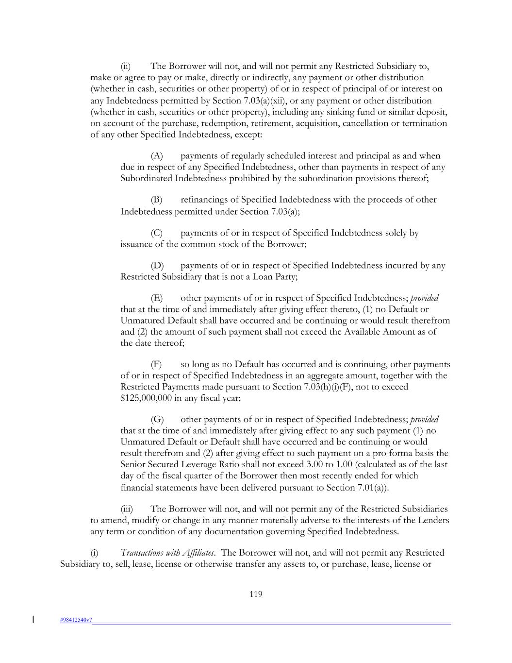 (ii) The Borrower will not, and will not permit any Restricted Subsidiary to, make or agree to pay or make, directly or indirectly, any payment or other distribution (whether in cash, securities or other property) of or in respect of principal of or interest on any Indebtedness permitted by Section 7.03(a)(xii), or any payment or other distribution (whether in cash, securities or other property), including any sinking fund or similar deposit, on account of the purchase, redemption, retirement, acquisition, cancellation or termination of any other Specified Indebtedness, except: (A) payments of regularly scheduled interest and principal as and when due in respect of any Specified Indebtedness, other than payments in respect of any Subordinated Indebtedness prohibited by the subordination provisions thereof; (B) refinancings of Specified Indebtedness with the proceeds of other Indebtedness permitted under Section 7.03(a); (C) payments of or in respect of Specified Indebtedness solely by issuance of the common stock of the Borrower; (D) payments of or in respect of Specified Indebtedness incurred by any Restricted Subsidiary that is not a Loan Party; (E) other payments of or in respect of Specified Indebtedness; provided that at the time of and immediately after giving effect thereto, (1) no Default or Unmatured Default shall have occurred and be continuing or would result therefrom and (2) the amount of such payment shall not exceed the Available Amount as of the date thereof; (F) so long as no Default has occurred and is continuing, other payments of or in respect of Specified Indebtedness in an aggregate amount, together with the Restricted Payments made pursuant to Section 7.03(h)(i)(F), not to exceed $125,000,000 in any fiscal year; (G) other payments of or in respect of Specified Indebtedness; provided that at the time of and immediately after giving effect to any such payment (1) no Unmatured Default or Default shall have occurred and be continuing or would result therefrom and (2) after giving effect to such payment on a pro forma basis the Senior Secured Leverage Ratio shall not exceed 3.00 to 1.00 (calculated as of the last day of the fiscal quarter of the Borrower then most recently ended for which financial statements have been delivered pursuant to Section 7.01(a)). (iii) The Borrower will not, and will not permit any of the Restricted Subsidiaries to amend, modify or change in any manner materially adverse to the interests of the Lenders any term or condition of any documentation governing Specified Indebtedness. (i) Transactions with Affiliates. The Borrower will not, and will not permit any Restricted Subsidiary to, sell, lease, license or otherwise transfer any assets to, or purchase, lease, license or 119 #98412540v7