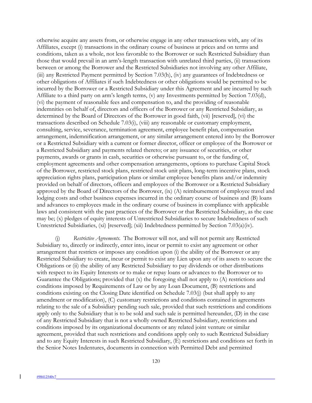 otherwise acquire any assets from, or otherwise engage in any other transactions with, any of its Affiliates, except (i) transactions in the ordinary course of business at prices and on terms and conditions, taken as a whole, not less favorable to the Borrower or such Restricted Subsidiary than those that would prevail in an arm’s-length transaction with unrelated third parties, (ii) transactions between or among the Borrower and the Restricted Subsidiaries not involving any other Affiliate, (iii) any Restricted Payment permitted by Section 7.03(h), (iv) any guarantees of Indebtedness or other obligations of Affiliates if such Indebtedness or other obligations would be permitted to be incurred by the Borrower or a Restricted Subsidiary under this Agreement and are incurred by such Affiliate to a third party on arm’s length terms, (v) any Investments permitted by Section 7.03(d), (vi) the payment of reasonable fees and compensation to, and the providing of reasonable indemnities on behalf of, directors and officers of the Borrower or any Restricted Subsidiary, as determined by the Board of Directors of the Borrower in good faith, (vii) [reserved], (vi) the transactions described on Schedule 7.03(i), (viii) any reasonable or customary employment, consulting, service, severance, termination agreement, employee benefit plan, compensation arrangement, indemnification arrangement, or any similar arrangement entered into by the Borrower or a Restricted Subsidiary with a current or former director, officer or employee of the Borrower or a Restricted Subsidiary and payments related thereto; or any issuance of securities, or other payments, awards or grants in cash, securities or otherwise pursuant to, or the funding of, employment agreements and other compensation arrangements, options to purchase Capital Stock of the Borrower, restricted stock plans, restricted stock unit plans, long-term incentive plans, stock appreciation rights plans, participation plans or similar employee benefits plans and/or indemnity provided on behalf of directors, officers and employees of the Borrower or a Restricted Subsidiary approved by the Board of Directors of the Borrower, (ix) (A) reimbursement of employee travel and lodging costs and other business expenses incurred in the ordinary course of business and (B) loans and advances to employees made in the ordinary course of business in compliance with applicable laws and consistent with the past practices of the Borrower or that Restricted Subsidiary, as the case may be; (x) pledges of equity interests of Unrestricted Subsidiaries to secure Indebtedness of such Unrestricted Subsidiaries, (xi) [reserved]; (xii) Indebtedness permitted by Section 7.03(a)(iv). (j) Restrictive Agreements. The Borrower will not, and will not permit any Restricted Subsidiary to, directly or indirectly, enter into, incur or permit to exist any agreement or other arrangement that restricts or imposes any condition upon (i) the ability of the Borrower or any Restricted Subsidiary to create, incur or permit to exist any Lien upon any of its assets to secure the Obligations or (ii) the ability of any Restricted Subsidiary to pay dividends or other distributions with respect to its Equity Interests or to make or repay loans or advances to the Borrower or to Guarantee the Obligations; provided that (x) the foregoing shall not apply to (A) restrictions and conditions imposed by Requirements of Law or by any Loan Document, (B) restrictions and conditions existing on the Closing Date identified on Schedule 7.03(j) (but shall apply to any amendment or modification), (C) customary restrictions and conditions contained in agreements relating to the sale of a Subsidiary pending such sale, provided that such restrictions and conditions apply only to the Subsidiary that is to be sold and such sale is permitted hereunder, (D) in the case of any Restricted Subsidiary that is not a wholly owned Restricted Subsidiary, restrictions and conditions imposed by its organizational documents or any related joint venture or similar agreement, provided that such restrictions and conditions apply only to such Restricted Subsidiary and to any Equity Interests in such Restricted Subsidiary, (E) restrictions and conditions set forth in the Senior Notes Indentures, documents in connection with Permitted Debt and permitted 120 #98412540v7