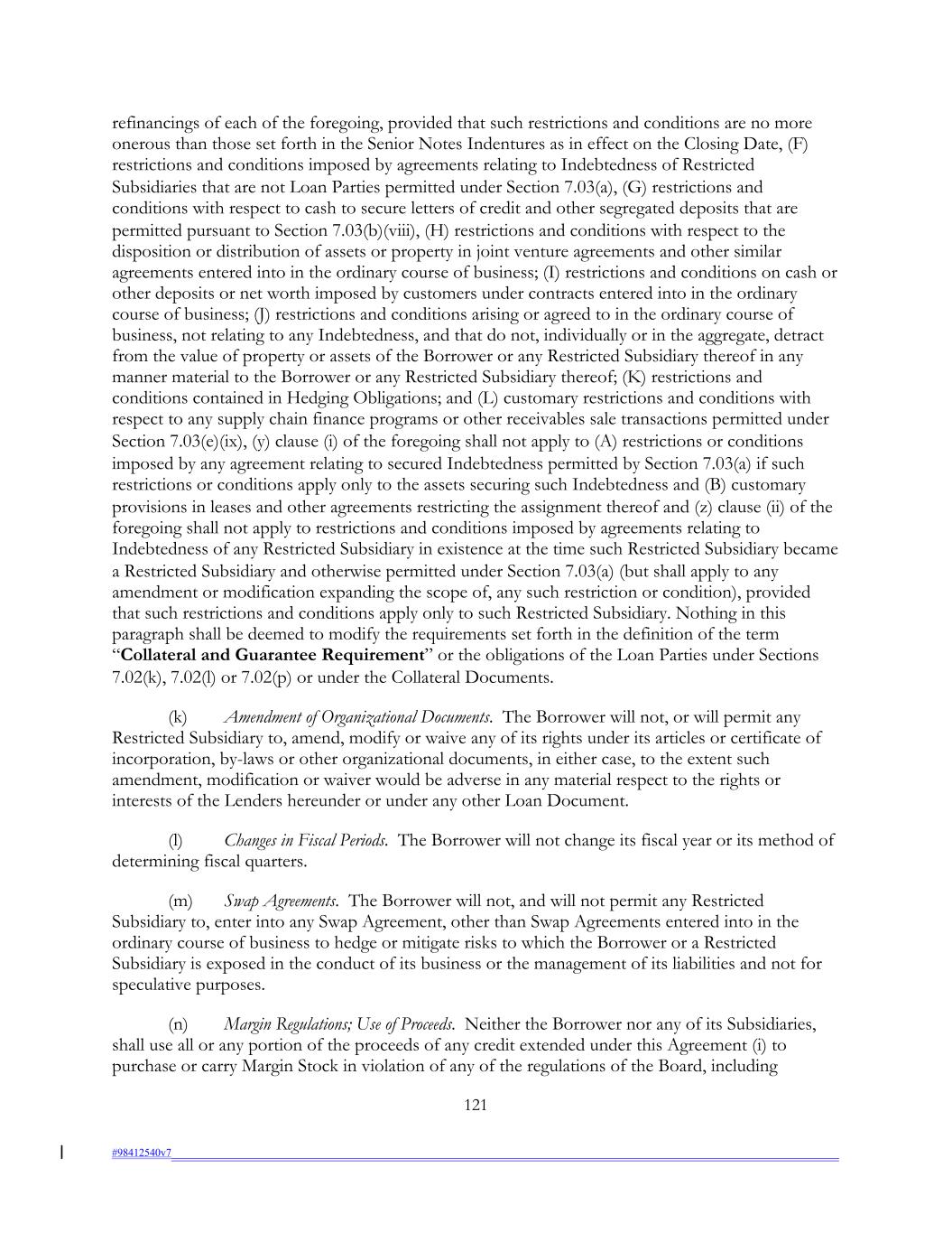 refinancings of each of the foregoing, provided that such restrictions and conditions are no more onerous than those set forth in the Senior Notes Indentures as in effect on the Closing Date, (F) restrictions and conditions imposed by agreements relating to Indebtedness of Restricted Subsidiaries that are not Loan Parties permitted under Section 7.03(a), (G) restrictions and conditions with respect to cash to secure letters of credit and other segregated deposits that are permitted pursuant to Section 7.03(b)(viii), (H) restrictions and conditions with respect to the disposition or distribution of assets or property in joint venture agreements and other similar agreements entered into in the ordinary course of business; (I) restrictions and conditions on cash or other deposits or net worth imposed by customers under contracts entered into in the ordinary course of business; (J) restrictions and conditions arising or agreed to in the ordinary course of business, not relating to any Indebtedness, and that do not, individually or in the aggregate, detract from the value of property or assets of the Borrower or any Restricted Subsidiary thereof in any manner material to the Borrower or any Restricted Subsidiary thereof; (K) restrictions and conditions contained in Hedging Obligations; and (L) customary restrictions and conditions with respect to any supply chain finance programs or other receivables sale transactions permitted under Section 7.03(e)(ix), (y) clause (i) of the foregoing shall not apply to (A) restrictions or conditions imposed by any agreement relating to secured Indebtedness permitted by Section 7.03(a) if such restrictions or conditions apply only to the assets securing such Indebtedness and (B) customary provisions in leases and other agreements restricting the assignment thereof and (z) clause (ii) of the foregoing shall not apply to restrictions and conditions imposed by agreements relating to Indebtedness of any Restricted Subsidiary in existence at the time such Restricted Subsidiary became a Restricted Subsidiary and otherwise permitted under Section 7.03(a) (but shall apply to any amendment or modification expanding the scope of, any such restriction or condition), provided that such restrictions and conditions apply only to such Restricted Subsidiary. Nothing in this paragraph shall be deemed to modify the requirements set forth in the definition of the term “Collateral and Guarantee Requirement” or the obligations of the Loan Parties under Sections 7.02(k), 7.02(l) or 7.02(p) or under the Collateral Documents. (k) Amendment of Organizational Documents. The Borrower will not, or will permit any Restricted Subsidiary to, amend, modify or waive any of its rights under its articles or certificate of incorporation, by-laws or other organizational documents, in either case, to the extent such amendment, modification or waiver would be adverse in any material respect to the rights or interests of the Lenders hereunder or under any other Loan Document. (l) Changes in Fiscal Periods. The Borrower will not change its fiscal year or its method of determining fiscal quarters. (m) Swap Agreements. The Borrower will not, and will not permit any Restricted Subsidiary to, enter into any Swap Agreement, other than Swap Agreements entered into in the ordinary course of business to hedge or mitigate risks to which the Borrower or a Restricted Subsidiary is exposed in the conduct of its business or the management of its liabilities and not for speculative purposes. (n) Margin Regulations; Use of Proceeds. Neither the Borrower nor any of its Subsidiaries, shall use all or any portion of the proceeds of any credit extended under this Agreement (i) to purchase or carry Margin Stock in violation of any of the regulations of the Board, including 121 #98412540v7