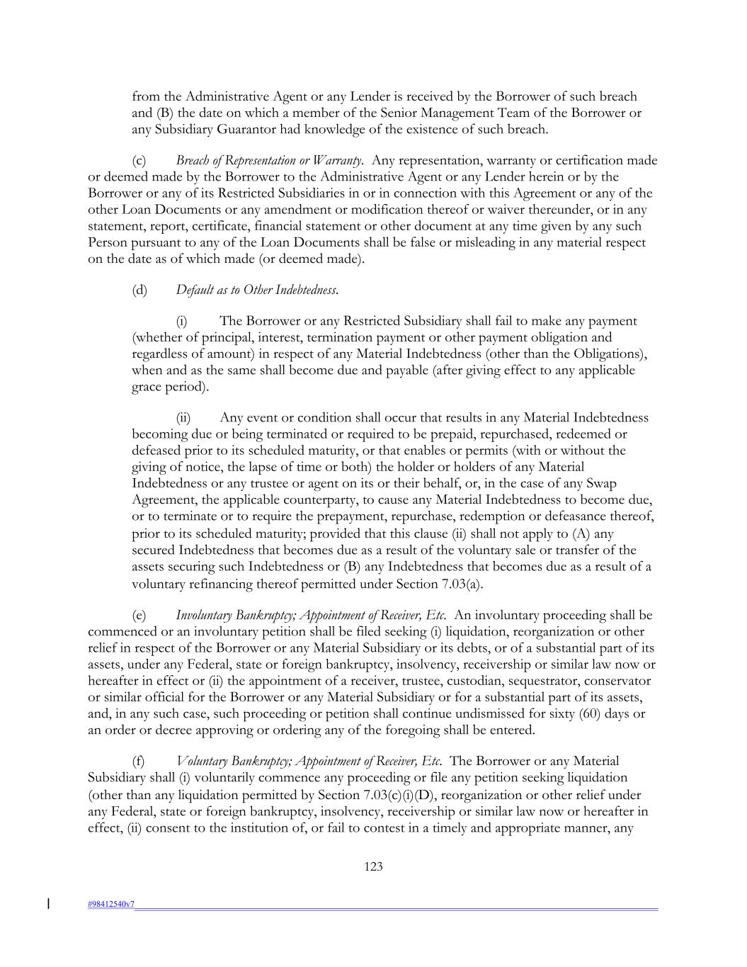 from the Administrative Agent or any Lender is received by the Borrower of such breach and (B) the date on which a member of the Senior Management Team of the Borrower or any Subsidiary Guarantor had knowledge of the existence of such breach. (c) Breach of Representation or Warranty. Any representation, warranty or certification made or deemed made by the Borrower to the Administrative Agent or any Lender herein or by the Borrower or any of its Restricted Subsidiaries in or in connection with this Agreement or any of the other Loan Documents or any amendment or modification thereof or waiver thereunder, or in any statement, report, certificate, financial statement or other document at any time given by any such Person pursuant to any of the Loan Documents shall be false or misleading in any material respect on the date as of which made (or deemed made). (d) Default as to Other Indebtedness. (i) The Borrower or any Restricted Subsidiary shall fail to make any payment (whether of principal, interest, termination payment or other payment obligation and regardless of amount) in respect of any Material Indebtedness (other than the Obligations), when and as the same shall become due and payable (after giving effect to any applicable grace period). (ii) Any event or condition shall occur that results in any Material Indebtedness becoming due or being terminated or required to be prepaid, repurchased, redeemed or defeased prior to its scheduled maturity, or that enables or permits (with or without the giving of notice, the lapse of time or both) the holder or holders of any Material Indebtedness or any trustee or agent on its or their behalf, or, in the case of any Swap Agreement, the applicable counterparty, to cause any Material Indebtedness to become due, or to terminate or to require the prepayment, repurchase, redemption or defeasance thereof, prior to its scheduled maturity; provided that this clause (ii) shall not apply to (A) any secured Indebtedness that becomes due as a result of the voluntary sale or transfer of the assets securing such Indebtedness or (B) any Indebtedness that becomes due as a result of a voluntary refinancing thereof permitted under Section 7.03(a). (e) Involuntary Bankruptcy; Appointment of Receiver, Etc. An involuntary proceeding shall be commenced or an involuntary petition shall be filed seeking (i) liquidation, reorganization or other relief in respect of the Borrower or any Material Subsidiary or its debts, or of a substantial part of its assets, under any Federal, state or foreign bankruptcy, insolvency, receivership or similar law now or hereafter in effect or (ii) the appointment of a receiver, trustee, custodian, sequestrator, conservator or similar official for the Borrower or any Material Subsidiary or for a substantial part of its assets, and, in any such case, such proceeding or petition shall continue undismissed for sixty (60) days or an order or decree approving or ordering any of the foregoing shall be entered. (f) Voluntary Bankruptcy; Appointment of Receiver, Etc. The Borrower or any Material Subsidiary shall (i) voluntarily commence any proceeding or file any petition seeking liquidation (other than any liquidation permitted by Section 7.03(c)(i)(D), reorganization or other relief under any Federal, state or foreign bankruptcy, insolvency, receivership or similar law now or hereafter in effect, (ii) consent to the institution of, or fail to contest in a timely and appropriate manner, any 123 #98412540v7