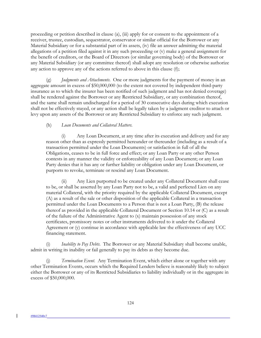 proceeding or petition described in clause (a), (iii) apply for or consent to the appointment of a receiver, trustee, custodian, sequestrator, conservator or similar official for the Borrower or any Material Subsidiary or for a substantial part of its assets, (iv) file an answer admitting the material allegations of a petition filed against it in any such proceeding or (v) make a general assignment for the benefit of creditors, or the Board of Directors (or similar governing body) of the Borrower or any Material Subsidiary (or any committee thereof) shall adopt any resolution or otherwise authorize any action to approve any of the actions referred to above in this clause (f); (g) Judgments and Attachments. One or more judgments for the payment of money in an aggregate amount in excess of $50,000,000 (to the extent not covered by independent third-party insurance as to which the insurer has been notified of such judgment and has not denied coverage) shall be rendered against the Borrower or any Restricted Subsidiary, or any combination thereof, and the same shall remain undischarged for a period of 30 consecutive days during which execution shall not be effectively stayed, or any action shall be legally taken by a judgment creditor to attach or levy upon any assets of the Borrower or any Restricted Subsidiary to enforce any such judgment. (h) Loan Documents and Collateral Matters. (i) Any Loan Document, at any time after its execution and delivery and for any reason other than as expressly permitted hereunder or thereunder (including as a result of a transaction permitted under the Loan Documents) or satisfaction in full of all the Obligations, ceases to be in full force and effect; or any Loan Party or any other Person contests in any manner the validity or enforceability of any Loan Document; or any Loan Party denies that it has any or further liability or obligation under any Loan Document, or purports to revoke, terminate or rescind any Loan Document. (ii) Any Lien purported to be created under any Collateral Document shall cease to be, or shall be asserted by any Loan Party not to be, a valid and perfected Lien on any material Collateral, with the priority required by the applicable Collateral Document, except (A) as a result of the sale or other disposition of the applicable Collateral in a transaction permitted under the Loan Documents to a Person that is not a Loan Party, (B) the release thereof as provided in the applicable Collateral Document or Section 10.14 or (C) as a result of the failure of the Administrative Agent to (x) maintain possession of any stock certificates, promissory notes or other instruments delivered to it under the Collateral Agreement or (y) continue in accordance with applicable law the effectiveness of any UCC financing statement. (i) Inability to Pay Debts. The Borrower or any Material Subsidiary shall become unable, admit in writing its inability or fail generally to pay its debts as they become due. (j) Termination Event. Any Termination Event, which either alone or together with any other Termination Events, occurs which the Required Lenders believe is reasonably likely to subject either the Borrower or any of its Restricted Subsidiaries to liability individually or in the aggregate in excess of $50,000,000. 124 #98412540v7