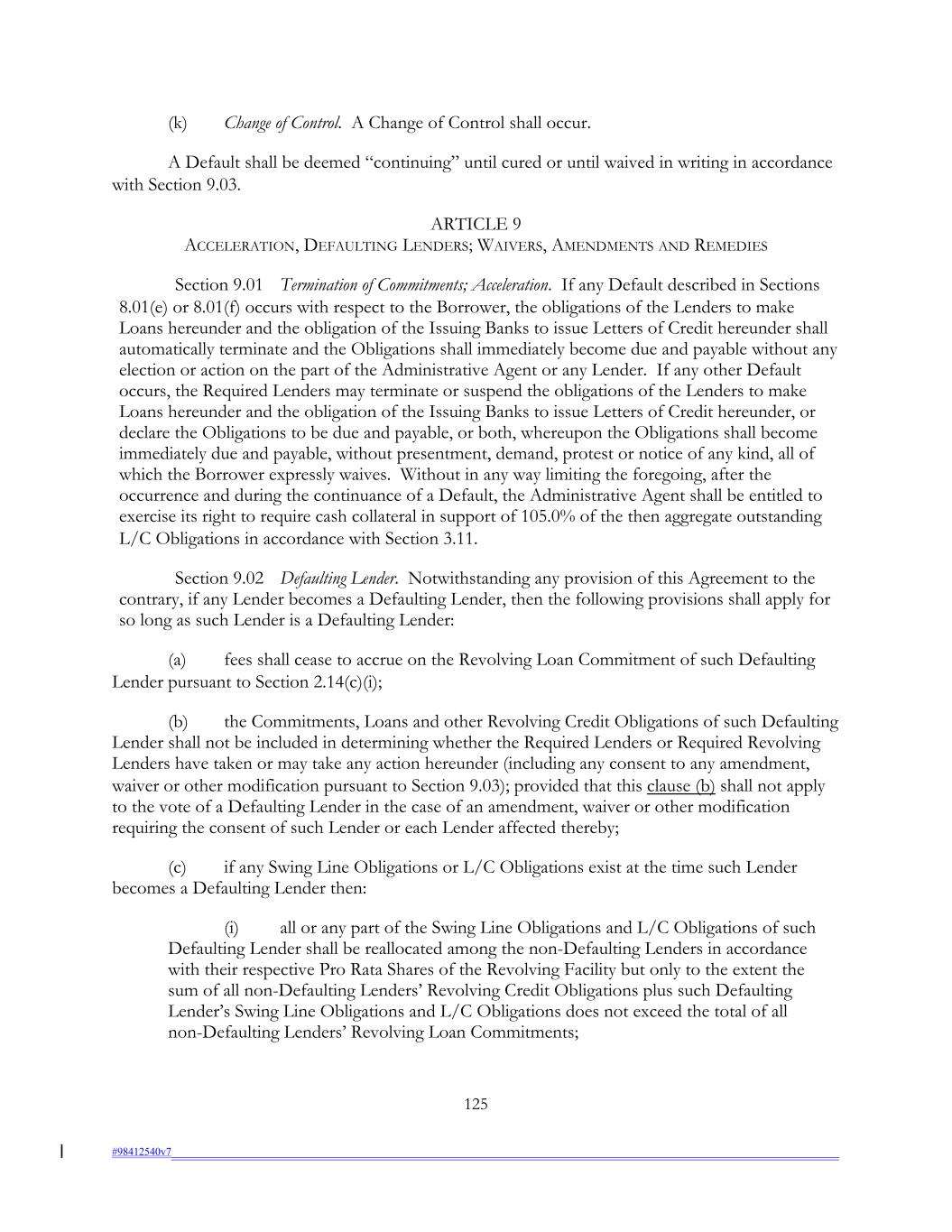 (k) Change of Control. A Change of Control shall occur. A Default shall be deemed “continuing” until cured or until waived in writing in accordance with Section 9.03. ARTICLE 9 ACCELERATION, DEFAULTING LENDERS; WAIVERS, AMENDMENTS AND REMEDIES Section 9.01 Termination of Commitments; Acceleration. If any Default described in Sections 8.01(e) or 8.01(f) occurs with respect to the Borrower, the obligations of the Lenders to make Loans hereunder and the obligation of the Issuing Banks to issue Letters of Credit hereunder shall automatically terminate and the Obligations shall immediately become due and payable without any election or action on the part of the Administrative Agent or any Lender. If any other Default occurs, the Required Lenders may terminate or suspend the obligations of the Lenders to make Loans hereunder and the obligation of the Issuing Banks to issue Letters of Credit hereunder, or declare the Obligations to be due and payable, or both, whereupon the Obligations shall become immediately due and payable, without presentment, demand, protest or notice of any kind, all of which the Borrower expressly waives. Without in any way limiting the foregoing, after the occurrence and during the continuance of a Default, the Administrative Agent shall be entitled to exercise its right to require cash collateral in support of 105.0% of the then aggregate outstanding L/C Obligations in accordance with Section 3.11. Section 9.02 Defaulting Lender. Notwithstanding any provision of this Agreement to the contrary, if any Lender becomes a Defaulting Lender, then the following provisions shall apply for so long as such Lender is a Defaulting Lender: (a) fees shall cease to accrue on the Revolving Loan Commitment of such Defaulting Lender pursuant to Section 2.14(c)(i); (b) the Commitments, Loans and other Revolving Credit Obligations of such Defaulting Lender shall not be included in determining whether the Required Lenders or Required Revolving Lenders have taken or may take any action hereunder (including any consent to any amendment, waiver or other modification pursuant to Section 9.03); provided that this clause (b) shall not apply to the vote of a Defaulting Lender in the case of an amendment, waiver or other modification requiring the consent of such Lender or each Lender affected thereby; (c) if any Swing Line Obligations or L/C Obligations exist at the time such Lender becomes a Defaulting Lender then: (i) all or any part of the Swing Line Obligations and L/C Obligations of such Defaulting Lender shall be reallocated among the non-Defaulting Lenders in accordance with their respective Pro Rata Shares of the Revolving Facility but only to the extent the sum of all non-Defaulting Lenders’ Revolving Credit Obligations plus such Defaulting Lender’s Swing Line Obligations and L/C Obligations does not exceed the total of all non-Defaulting Lenders’ Revolving Loan Commitments; 125 #98412540v7