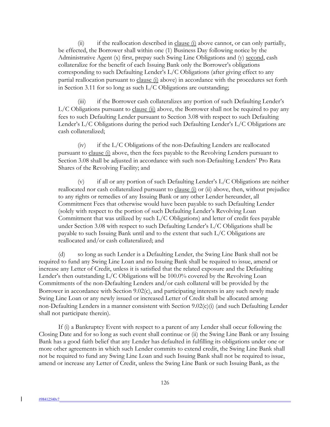 (ii) if the reallocation described in clause (i) above cannot, or can only partially, be effected, the Borrower shall within one (1) Business Day following notice by the Administrative Agent (x) first, prepay such Swing Line Obligations and (y) second, cash collateralize for the benefit of each Issuing Bank only the Borrower’s obligations corresponding to such Defaulting Lender’s L/C Obligations (after giving effect to any partial reallocation pursuant to clause (i) above) in accordance with the procedures set forth in Section 3.11 for so long as such L/C Obligations are outstanding; (iii) if the Borrower cash collateralizes any portion of such Defaulting Lender’s L/C Obligations pursuant to clause (ii) above, the Borrower shall not be required to pay any fees to such Defaulting Lender pursuant to Section 3.08 with respect to such Defaulting Lender’s L/C Obligations during the period such Defaulting Lender’s L/C Obligations are cash collateralized; (iv) if the L/C Obligations of the non-Defaulting Lenders are reallocated pursuant to clause (i) above, then the fees payable to the Revolving Lenders pursuant to Section 3.08 shall be adjusted in accordance with such non-Defaulting Lenders’ Pro Rata Shares of the Revolving Facility; and (v) if all or any portion of such Defaulting Lender’s L/C Obligations are neither reallocated nor cash collateralized pursuant to clause (i) or (ii) above, then, without prejudice to any rights or remedies of any Issuing Bank or any other Lender hereunder, all Commitment Fees that otherwise would have been payable to such Defaulting Lender (solely with respect to the portion of such Defaulting Lender’s Revolving Loan Commitment that was utilized by such L/C Obligations) and letter of credit fees payable under Section 3.08 with respect to such Defaulting Lender’s L/C Obligations shall be payable to such Issuing Bank until and to the extent that such L/C Obligations are reallocated and/or cash collateralized; and (d) so long as such Lender is a Defaulting Lender, the Swing Line Bank shall not be required to fund any Swing Line Loan and no Issuing Bank shall be required to issue, amend or increase any Letter of Credit, unless it is satisfied that the related exposure and the Defaulting Lender’s then outstanding L/C Obligations will be 100.0% covered by the Revolving Loan Commitments of the non-Defaulting Lenders and/or cash collateral will be provided by the Borrower in accordance with Section 9.02(c), and participating interests in any such newly made Swing Line Loan or any newly issued or increased Letter of Credit shall be allocated among non-Defaulting Lenders in a manner consistent with Section 9.02(c)(i) (and such Defaulting Lender shall not participate therein). If (i) a Bankruptcy Event with respect to a parent of any Lender shall occur following the Closing Date and for so long as such event shall continue or (ii) the Swing Line Bank or any Issuing Bank has a good faith belief that any Lender has defaulted in fulfilling its obligations under one or more other agreements in which such Lender commits to extend credit, the Swing Line Bank shall not be required to fund any Swing Line Loan and such Issuing Bank shall not be required to issue, amend or increase any Letter of Credit, unless the Swing Line Bank or such Issuing Bank, as the 126 #98412540v7