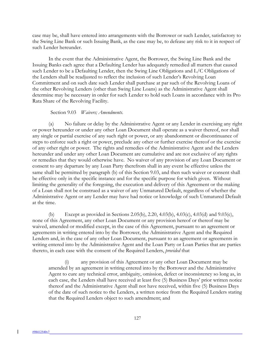 case may be, shall have entered into arrangements with the Borrower or such Lender, satisfactory to the Swing Line Bank or such Issuing Bank, as the case may be, to defease any risk to it in respect of such Lender hereunder. In the event that the Administrative Agent, the Borrower, the Swing Line Bank and the Issuing Banks each agree that a Defaulting Lender has adequately remedied all matters that caused such Lender to be a Defaulting Lender, then the Swing Line Obligations and L/C Obligations of the Lenders shall be readjusted to reflect the inclusion of such Lender’s Revolving Loan Commitment and on such date such Lender shall purchase at par such of the Revolving Loans of the other Revolving Lenders (other than Swing Line Loans) as the Administrative Agent shall determine may be necessary in order for such Lender to hold such Loans in accordance with its Pro Rata Share of the Revolving Facility. Section 9.03 Waivers; Amendments. (a) No failure or delay by the Administrative Agent or any Lender in exercising any right or power hereunder or under any other Loan Document shall operate as a waiver thereof, nor shall any single or partial exercise of any such right or power, or any abandonment or discontinuance of steps to enforce such a right or power, preclude any other or further exercise thereof or the exercise of any other right or power. The rights and remedies of the Administrative Agent and the Lenders hereunder and under any other Loan Document are cumulative and are not exclusive of any rights or remedies that they would otherwise have. No waiver of any provision of any Loan Document or consent to any departure by any Loan Party therefrom shall in any event be effective unless the same shall be permitted by paragraph (b) of this Section 9.03, and then such waiver or consent shall be effective only in the specific instance and for the specific purpose for which given. Without limiting the generality of the foregoing, the execution and delivery of this Agreement or the making of a Loan shall not be construed as a waiver of any Unmatured Default, regardless of whether the Administrative Agent or any Lender may have had notice or knowledge of such Unmatured Default at the time. (b) Except as provided in Sections 2.05(b), 2.20, 4.03(b), 4.03(c), 4.03(d) and 9.03(c), none of this Agreement, any other Loan Document or any provision hereof or thereof may be waived, amended or modified except, in the case of this Agreement, pursuant to an agreement or agreements in writing entered into by the Borrower, the Administrative Agent and the Required Lenders and, in the case of any other Loan Document, pursuant to an agreement or agreements in writing entered into by the Administrative Agent and the Loan Party or Loan Parties that are parties thereto, in each case with the consent of the Required Lenders, provided that (i) any provision of this Agreement or any other Loan Document may be amended by an agreement in writing entered into by the Borrower and the Administrative Agent to cure any technical error, ambiguity, omission, defect or inconsistency so long as, in each case, the Lenders shall have received at least five (5) Business Days’ prior written notice thereof and the Administrative Agent shall not have received, within five (5) Business Days of the date of such notice to the Lenders, a written notice from the Required Lenders stating that the Required Lenders object to such amendment; and 127 #98412540v7