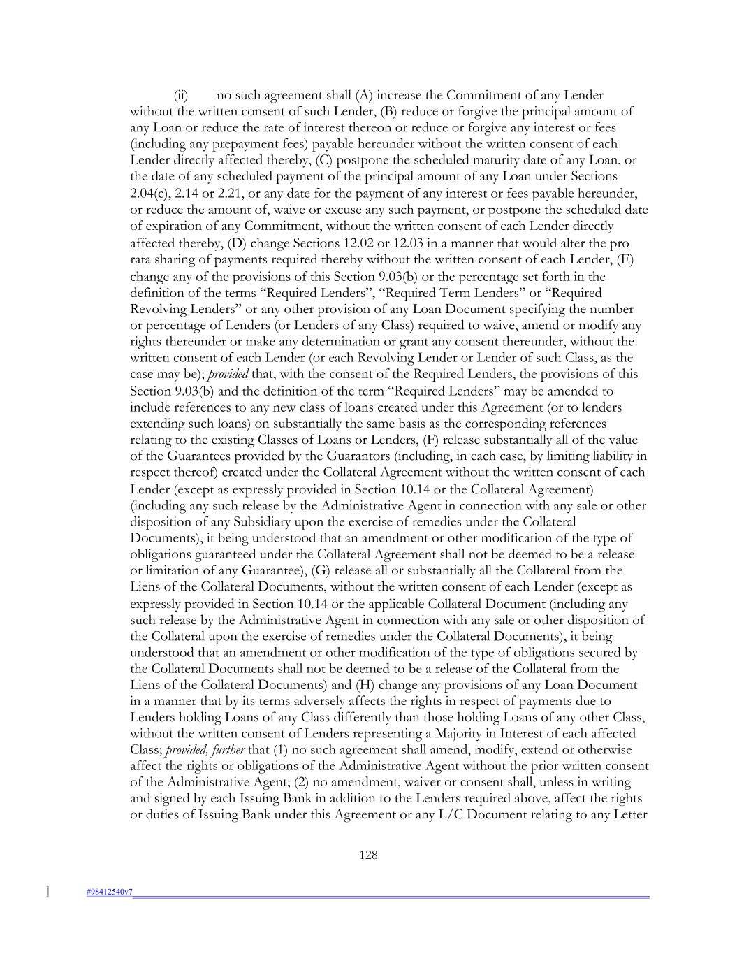 (ii) no such agreement shall (A) increase the Commitment of any Lender without the written consent of such Lender, (B) reduce or forgive the principal amount of any Loan or reduce the rate of interest thereon or reduce or forgive any interest or fees (including any prepayment fees) payable hereunder without the written consent of each Lender directly affected thereby, (C) postpone the scheduled maturity date of any Loan, or the date of any scheduled payment of the principal amount of any Loan under Sections 2.04(c), 2.14 or 2.21, or any date for the payment of any interest or fees payable hereunder, or reduce the amount of, waive or excuse any such payment, or postpone the scheduled date of expiration of any Commitment, without the written consent of each Lender directly affected thereby, (D) change Sections 12.02 or 12.03 in a manner that would alter the pro rata sharing of payments required thereby without the written consent of each Lender, (E) change any of the provisions of this Section 9.03(b) or the percentage set forth in the definition of the terms “Required Lenders”, “Required Term Lenders” or “Required Revolving Lenders” or any other provision of any Loan Document specifying the number or percentage of Lenders (or Lenders of any Class) required to waive, amend or modify any rights thereunder or make any determination or grant any consent thereunder, without the written consent of each Lender (or each Revolving Lender or Lender of such Class, as the case may be); provided that, with the consent of the Required Lenders, the provisions of this Section 9.03(b) and the definition of the term “Required Lenders” may be amended to include references to any new class of loans created under this Agreement (or to lenders extending such loans) on substantially the same basis as the corresponding references relating to the existing Classes of Loans or Lenders, (F) release substantially all of the value of the Guarantees provided by the Guarantors (including, in each case, by limiting liability in respect thereof) created under the Collateral Agreement without the written consent of each Lender (except as expressly provided in Section 10.14 or the Collateral Agreement) (including any such release by the Administrative Agent in connection with any sale or other disposition of any Subsidiary upon the exercise of remedies under the Collateral Documents), it being understood that an amendment or other modification of the type of obligations guaranteed under the Collateral Agreement shall not be deemed to be a release or limitation of any Guarantee), (G) release all or substantially all the Collateral from the Liens of the Collateral Documents, without the written consent of each Lender (except as expressly provided in Section 10.14 or the applicable Collateral Document (including any such release by the Administrative Agent in connection with any sale or other disposition of the Collateral upon the exercise of remedies under the Collateral Documents), it being understood that an amendment or other modification of the type of obligations secured by the Collateral Documents shall not be deemed to be a release of the Collateral from the Liens of the Collateral Documents) and (H) change any provisions of any Loan Document in a manner that by its terms adversely affects the rights in respect of payments due to Lenders holding Loans of any Class differently than those holding Loans of any other Class, without the written consent of Lenders representing a Majority in Interest of each affected Class; provided, further that (1) no such agreement shall amend, modify, extend or otherwise affect the rights or obligations of the Administrative Agent without the prior written consent of the Administrative Agent; (2) no amendment, waiver or consent shall, unless in writing and signed by each Issuing Bank in addition to the Lenders required above, affect the rights or duties of Issuing Bank under this Agreement or any L/C Document relating to any Letter 128 #98412540v7