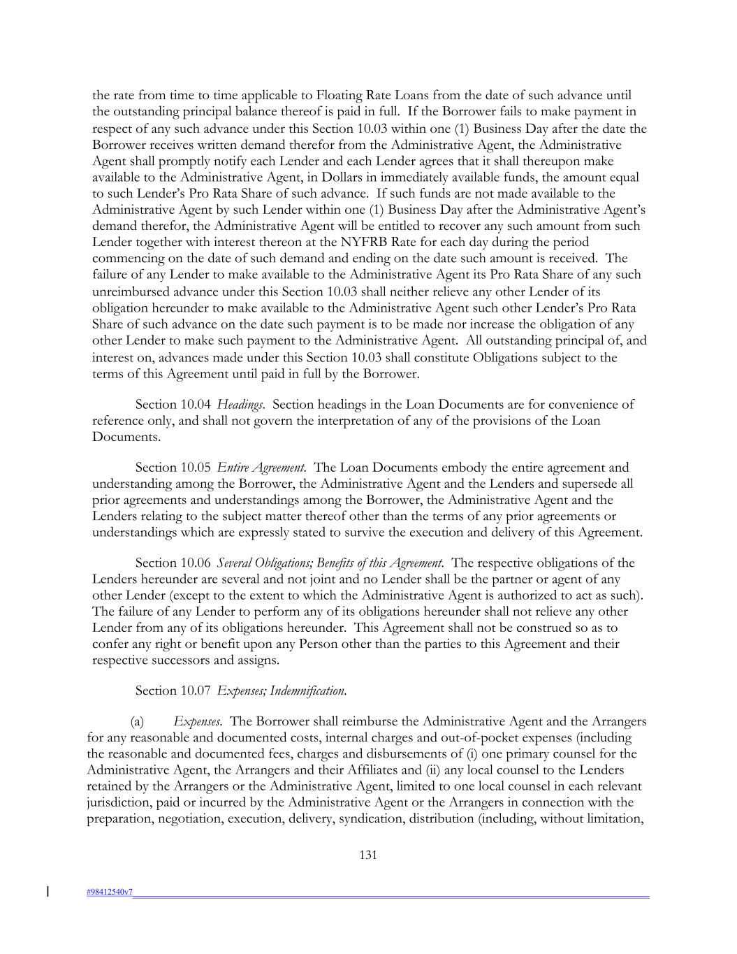 the rate from time to time applicable to Floating Rate Loans from the date of such advance until the outstanding principal balance thereof is paid in full. If the Borrower fails to make payment in respect of any such advance under this Section 10.03 within one (1) Business Day after the date the Borrower receives written demand therefor from the Administrative Agent, the Administrative Agent shall promptly notify each Lender and each Lender agrees that it shall thereupon make available to the Administrative Agent, in Dollars in immediately available funds, the amount equal to such Lender’s Pro Rata Share of such advance. If such funds are not made available to the Administrative Agent by such Lender within one (1) Business Day after the Administrative Agent’s demand therefor, the Administrative Agent will be entitled to recover any such amount from such Lender together with interest thereon at the NYFRB Rate for each day during the period commencing on the date of such demand and ending on the date such amount is received. The failure of any Lender to make available to the Administrative Agent its Pro Rata Share of any such unreimbursed advance under this Section 10.03 shall neither relieve any other Lender of its obligation hereunder to make available to the Administrative Agent such other Lender’s Pro Rata Share of such advance on the date such payment is to be made nor increase the obligation of any other Lender to make such payment to the Administrative Agent. All outstanding principal of, and interest on, advances made under this Section 10.03 shall constitute Obligations subject to the terms of this Agreement until paid in full by the Borrower. Section 10.04 Headings. Section headings in the Loan Documents are for convenience of reference only, and shall not govern the interpretation of any of the provisions of the Loan Documents. Section 10.05 Entire Agreement. The Loan Documents embody the entire agreement and understanding among the Borrower, the Administrative Agent and the Lenders and supersede all prior agreements and understandings among the Borrower, the Administrative Agent and the Lenders relating to the subject matter thereof other than the terms of any prior agreements or understandings which are expressly stated to survive the execution and delivery of this Agreement. Section 10.06 Several Obligations; Benefits of this Agreement. The respective obligations of the Lenders hereunder are several and not joint and no Lender shall be the partner or agent of any other Lender (except to the extent to which the Administrative Agent is authorized to act as such). The failure of any Lender to perform any of its obligations hereunder shall not relieve any other Lender from any of its obligations hereunder. This Agreement shall not be construed so as to confer any right or benefit upon any Person other than the parties to this Agreement and their respective successors and assigns. Section 10.07 Expenses; Indemnification. (a) Expenses. The Borrower shall reimburse the Administrative Agent and the Arrangers for any reasonable and documented costs, internal charges and out-of-pocket expenses (including the reasonable and documented fees, charges and disbursements of (i) one primary counsel for the Administrative Agent, the Arrangers and their Affiliates and (ii) any local counsel to the Lenders retained by the Arrangers or the Administrative Agent, limited to one local counsel in each relevant jurisdiction, paid or incurred by the Administrative Agent or the Arrangers in connection with the preparation, negotiation, execution, delivery, syndication, distribution (including, without limitation, 131 #98412540v7