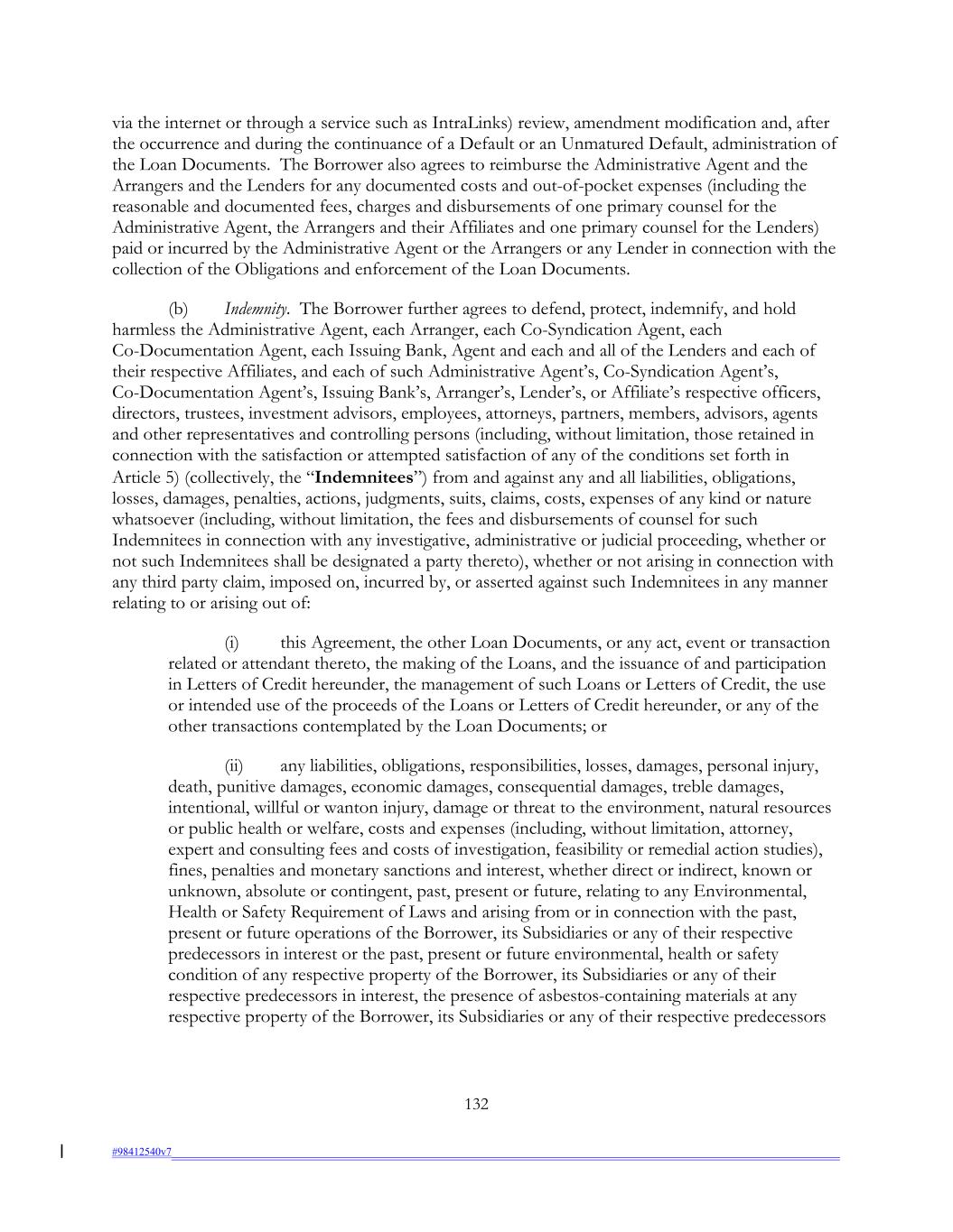 via the internet or through a service such as IntraLinks) review, amendment modification and, after the occurrence and during the continuance of a Default or an Unmatured Default, administration of the Loan Documents. The Borrower also agrees to reimburse the Administrative Agent and the Arrangers and the Lenders for any documented costs and out-of-pocket expenses (including the reasonable and documented fees, charges and disbursements of one primary counsel for the Administrative Agent, the Arrangers and their Affiliates and one primary counsel for the Lenders) paid or incurred by the Administrative Agent or the Arrangers or any Lender in connection with the collection of the Obligations and enforcement of the Loan Documents. (b) Indemnity. The Borrower further agrees to defend, protect, indemnify, and hold harmless the Administrative Agent, each Arranger, each Co-Syndication Agent, each Co-Documentation Agent, each Issuing Bank, Agent and each and all of the Lenders and each of their respective Affiliates, and each of such Administrative Agent’s, Co-Syndication Agent’s, Co-Documentation Agent’s, Issuing Bank’s, Arranger’s, Lender’s, or Affiliate’s respective officers, directors, trustees, investment advisors, employees, attorneys, partners, members, advisors, agents and other representatives and controlling persons (including, without limitation, those retained in connection with the satisfaction or attempted satisfaction of any of the conditions set forth in Article 5) (collectively, the “Indemnitees”) from and against any and all liabilities, obligations, losses, damages, penalties, actions, judgments, suits, claims, costs, expenses of any kind or nature whatsoever (including, without limitation, the fees and disbursements of counsel for such Indemnitees in connection with any investigative, administrative or judicial proceeding, whether or not such Indemnitees shall be designated a party thereto), whether or not arising in connection with any third party claim, imposed on, incurred by, or asserted against such Indemnitees in any manner relating to or arising out of: (i) this Agreement, the other Loan Documents, or any act, event or transaction related or attendant thereto, the making of the Loans, and the issuance of and participation in Letters of Credit hereunder, the management of such Loans or Letters of Credit, the use or intended use of the proceeds of the Loans or Letters of Credit hereunder, or any of the other transactions contemplated by the Loan Documents; or (ii) any liabilities, obligations, responsibilities, losses, damages, personal injury, death, punitive damages, economic damages, consequential damages, treble damages, intentional, willful or wanton injury, damage or threat to the environment, natural resources or public health or welfare, costs and expenses (including, without limitation, attorney, expert and consulting fees and costs of investigation, feasibility or remedial action studies), fines, penalties and monetary sanctions and interest, whether direct or indirect, known or unknown, absolute or contingent, past, present or future, relating to any Environmental, Health or Safety Requirement of Laws and arising from or in connection with the past, present or future operations of the Borrower, its Subsidiaries or any of their respective predecessors in interest or the past, present or future environmental, health or safety condition of any respective property of the Borrower, its Subsidiaries or any of their respective predecessors in interest, the presence of asbestos-containing materials at any respective property of the Borrower, its Subsidiaries or any of their respective predecessors 132 #98412540v7