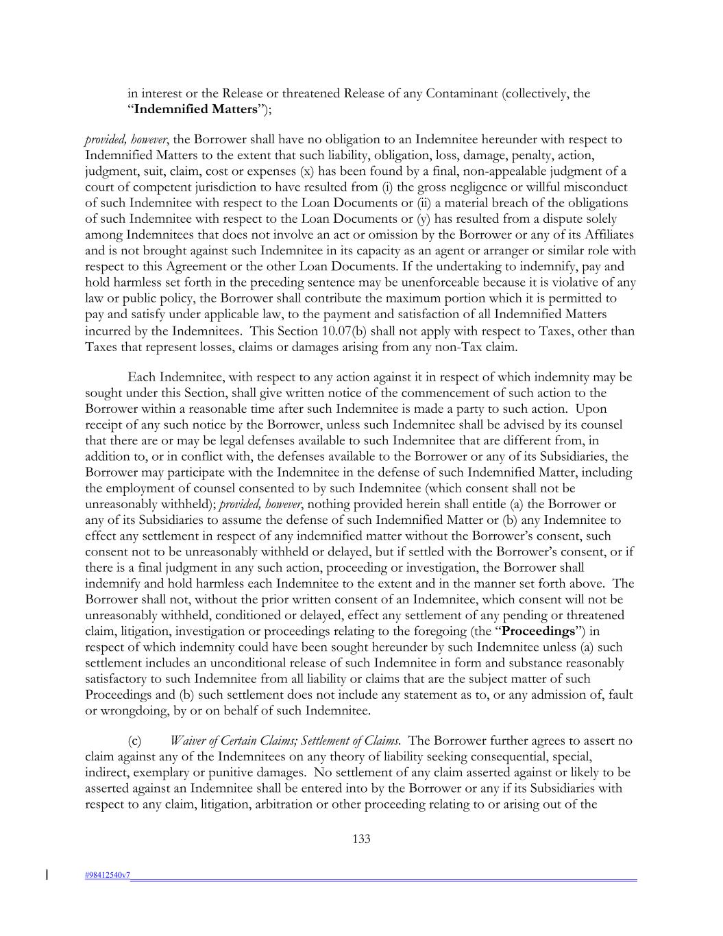 in interest or the Release or threatened Release of any Contaminant (collectively, the “Indemnified Matters”); provided, however, the Borrower shall have no obligation to an Indemnitee hereunder with respect to Indemnified Matters to the extent that such liability, obligation, loss, damage, penalty, action, judgment, suit, claim, cost or expenses (x) has been found by a final, non-appealable judgment of a court of competent jurisdiction to have resulted from (i) the gross negligence or willful misconduct of such Indemnitee with respect to the Loan Documents or (ii) a material breach of the obligations of such Indemnitee with respect to the Loan Documents or (y) has resulted from a dispute solely among Indemnitees that does not involve an act or omission by the Borrower or any of its Affiliates and is not brought against such Indemnitee in its capacity as an agent or arranger or similar role with respect to this Agreement or the other Loan Documents. If the undertaking to indemnify, pay and hold harmless set forth in the preceding sentence may be unenforceable because it is violative of any law or public policy, the Borrower shall contribute the maximum portion which it is permitted to pay and satisfy under applicable law, to the payment and satisfaction of all Indemnified Matters incurred by the Indemnitees. This Section 10.07(b) shall not apply with respect to Taxes, other than Taxes that represent losses, claims or damages arising from any non-Tax claim. Each Indemnitee, with respect to any action against it in respect of which indemnity may be sought under this Section, shall give written notice of the commencement of such action to the Borrower within a reasonable time after such Indemnitee is made a party to such action. Upon receipt of any such notice by the Borrower, unless such Indemnitee shall be advised by its counsel that there are or may be legal defenses available to such Indemnitee that are different from, in addition to, or in conflict with, the defenses available to the Borrower or any of its Subsidiaries, the Borrower may participate with the Indemnitee in the defense of such Indemnified Matter, including the employment of counsel consented to by such Indemnitee (which consent shall not be unreasonably withheld); provided, however, nothing provided herein shall entitle (a) the Borrower or any of its Subsidiaries to assume the defense of such Indemnified Matter or (b) any Indemnitee to effect any settlement in respect of any indemnified matter without the Borrower’s consent, such consent not to be unreasonably withheld or delayed, but if settled with the Borrower’s consent, or if there is a final judgment in any such action, proceeding or investigation, the Borrower shall indemnify and hold harmless each Indemnitee to the extent and in the manner set forth above. The Borrower shall not, without the prior written consent of an Indemnitee, which consent will not be unreasonably withheld, conditioned or delayed, effect any settlement of any pending or threatened claim, litigation, investigation or proceedings relating to the foregoing (the “Proceedings”) in respect of which indemnity could have been sought hereunder by such Indemnitee unless (a) such settlement includes an unconditional release of such Indemnitee in form and substance reasonably satisfactory to such Indemnitee from all liability or claims that are the subject matter of such Proceedings and (b) such settlement does not include any statement as to, or any admission of, fault or wrongdoing, by or on behalf of such Indemnitee. (c) Waiver of Certain Claims; Settlement of Claims. The Borrower further agrees to assert no claim against any of the Indemnitees on any theory of liability seeking consequential, special, indirect, exemplary or punitive damages. No settlement of any claim asserted against or likely to be asserted against an Indemnitee shall be entered into by the Borrower or any if its Subsidiaries with respect to any claim, litigation, arbitration or other proceeding relating to or arising out of the 133 #98412540v7