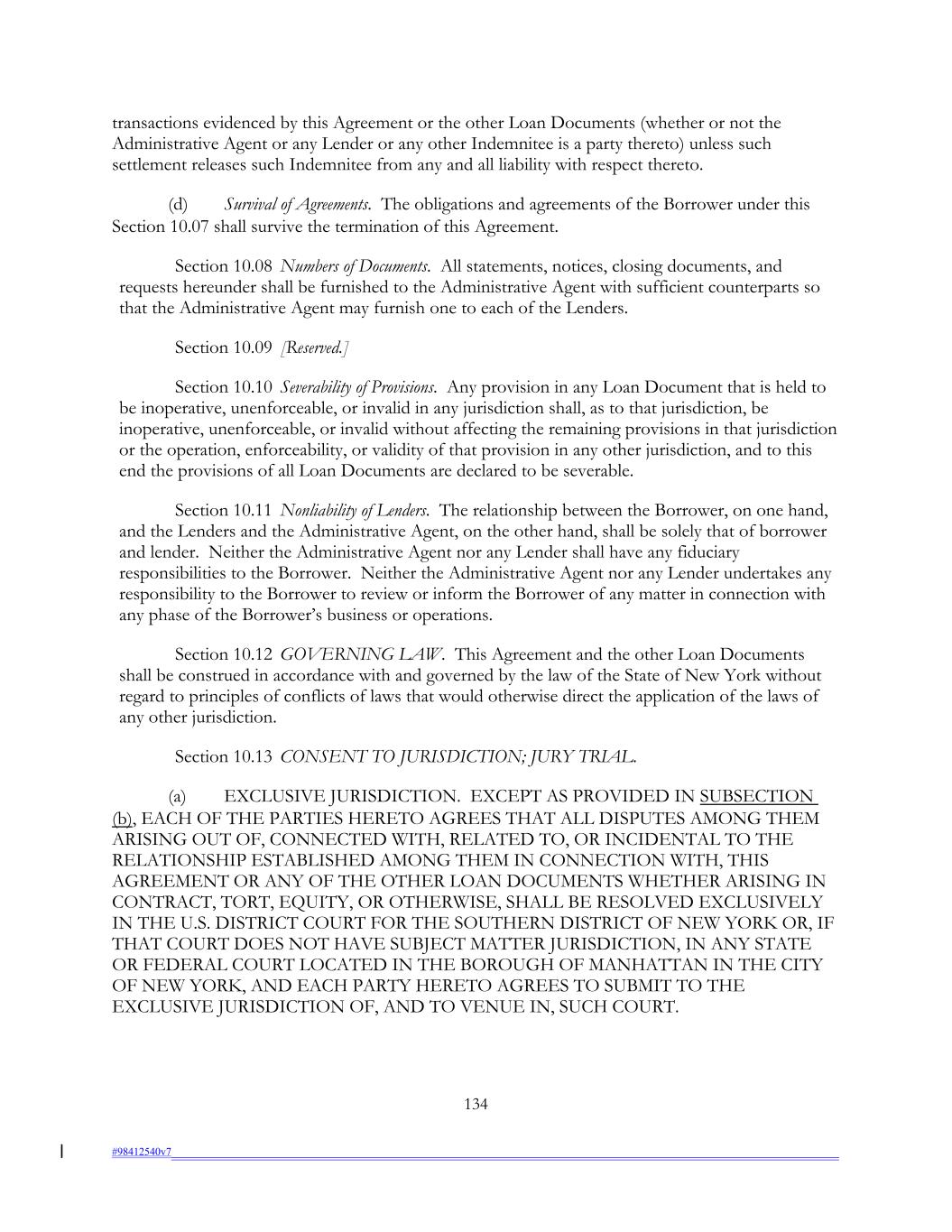 transactions evidenced by this Agreement or the other Loan Documents (whether or not the Administrative Agent or any Lender or any other Indemnitee is a party thereto) unless such settlement releases such Indemnitee from any and all liability with respect thereto. (d) Survival of Agreements. The obligations and agreements of the Borrower under this Section 10.07 shall survive the termination of this Agreement. Section 10.08 Numbers of Documents. All statements, notices, closing documents, and requests hereunder shall be furnished to the Administrative Agent with sufficient counterparts so that the Administrative Agent may furnish one to each of the Lenders. Section 10.09 [Reserved.] Section 10.10 Severability of Provisions. Any provision in any Loan Document that is held to be inoperative, unenforceable, or invalid in any jurisdiction shall, as to that jurisdiction, be inoperative, unenforceable, or invalid without affecting the remaining provisions in that jurisdiction or the operation, enforceability, or validity of that provision in any other jurisdiction, and to this end the provisions of all Loan Documents are declared to be severable. Section 10.11 Nonliability of Lenders. The relationship between the Borrower, on one hand, and the Lenders and the Administrative Agent, on the other hand, shall be solely that of borrower and lender. Neither the Administrative Agent nor any Lender shall have any fiduciary responsibilities to the Borrower. Neither the Administrative Agent nor any Lender undertakes any responsibility to the Borrower to review or inform the Borrower of any matter in connection with any phase of the Borrower’s business or operations. Section 10.12 GOVERNING LAW. This Agreement and the other Loan Documents shall be construed in accordance with and governed by the law of the State of New York without regard to principles of conflicts of laws that would otherwise direct the application of the laws of any other jurisdiction. Section 10.13 CONSENT TO JURISDICTION; JURY TRIAL. (a) EXCLUSIVE JURISDICTION. EXCEPT AS PROVIDED IN SUBSECTION (b), EACH OF THE PARTIES HERETO AGREES THAT ALL DISPUTES AMONG THEM ARISING OUT OF, CONNECTED WITH, RELATED TO, OR INCIDENTAL TO THE RELATIONSHIP ESTABLISHED AMONG THEM IN CONNECTION WITH, THIS AGREEMENT OR ANY OF THE OTHER LOAN DOCUMENTS WHETHER ARISING IN CONTRACT, TORT, EQUITY, OR OTHERWISE, SHALL BE RESOLVED EXCLUSIVELY IN THE U.S. DISTRICT COURT FOR THE SOUTHERN DISTRICT OF NEW YORK OR, IF THAT COURT DOES NOT HAVE SUBJECT MATTER JURISDICTION, IN ANY STATE OR FEDERAL COURT LOCATED IN THE BOROUGH OF MANHATTAN IN THE CITY OF NEW YORK, AND EACH PARTY HERETO AGREES TO SUBMIT TO THE EXCLUSIVE JURISDICTION OF, AND TO VENUE IN, SUCH COURT. 134 #98412540v7